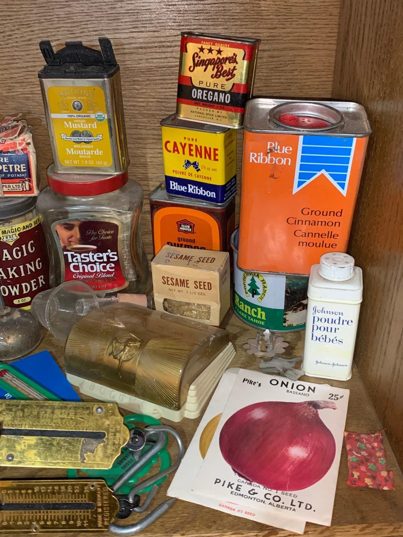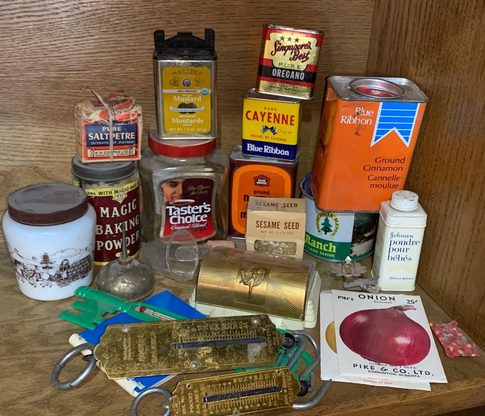 Antique Kitchen Collectables - Spices Tins Moonshine Canteen & More