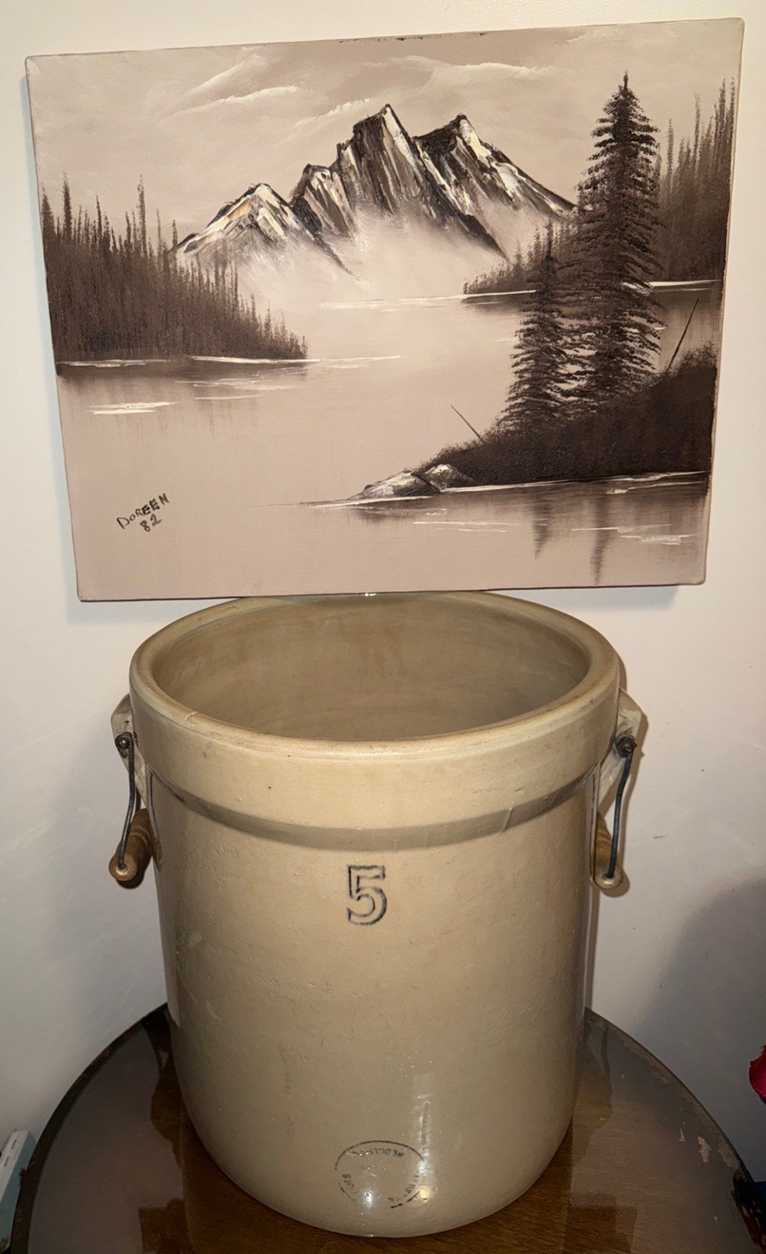 Antique Madelta 5 Crock w/ Original Art Works By Local Artist Doreen