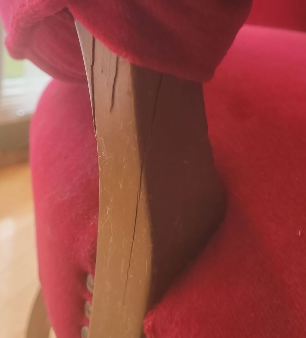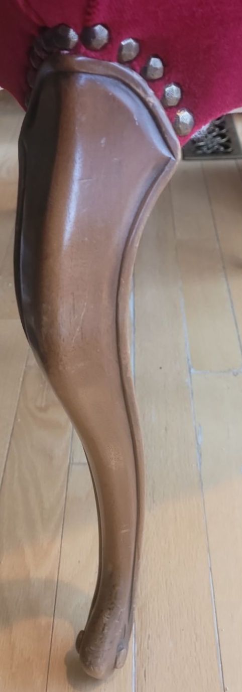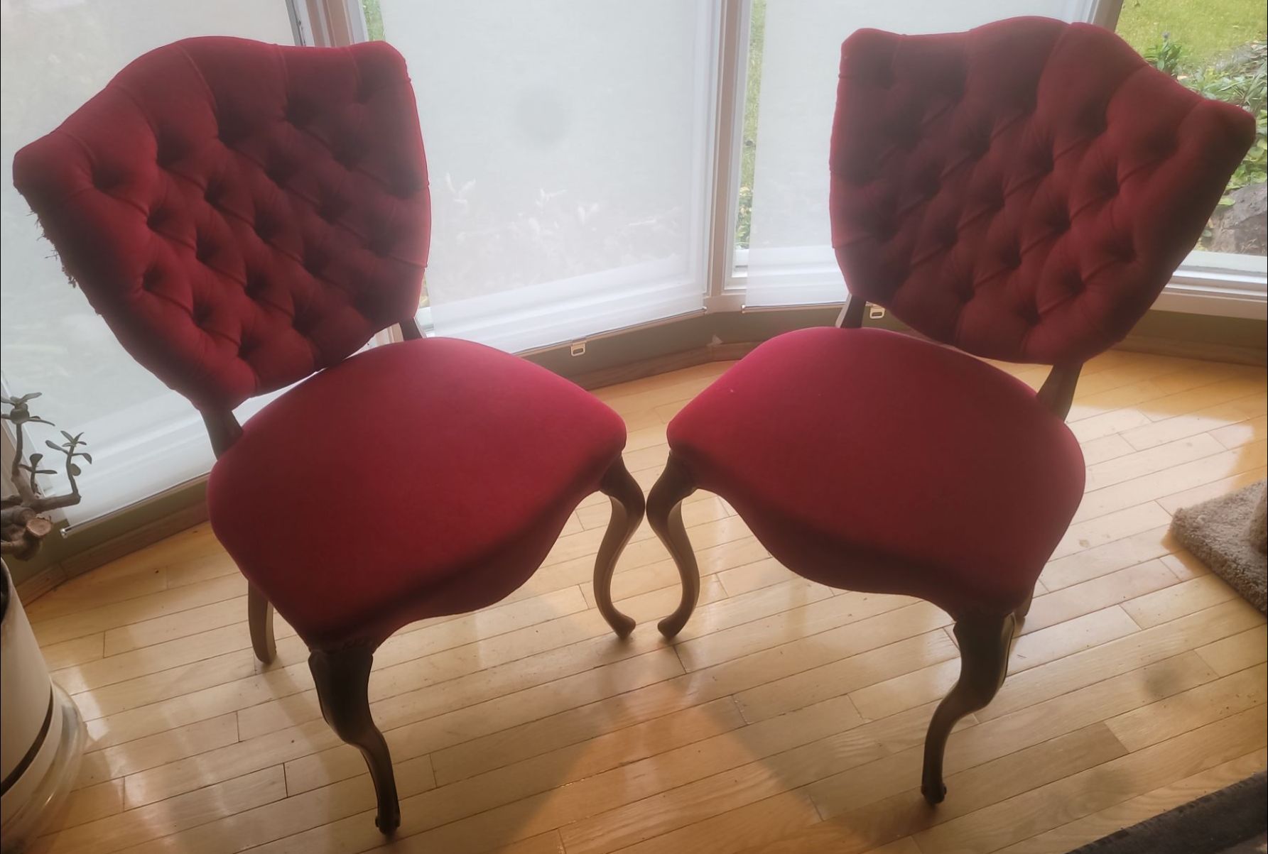 Antique Red Velvet Chairs (2) -  22W, 18D, 35T Each (One Has Cracking on Wood & Fraying on Fabric)