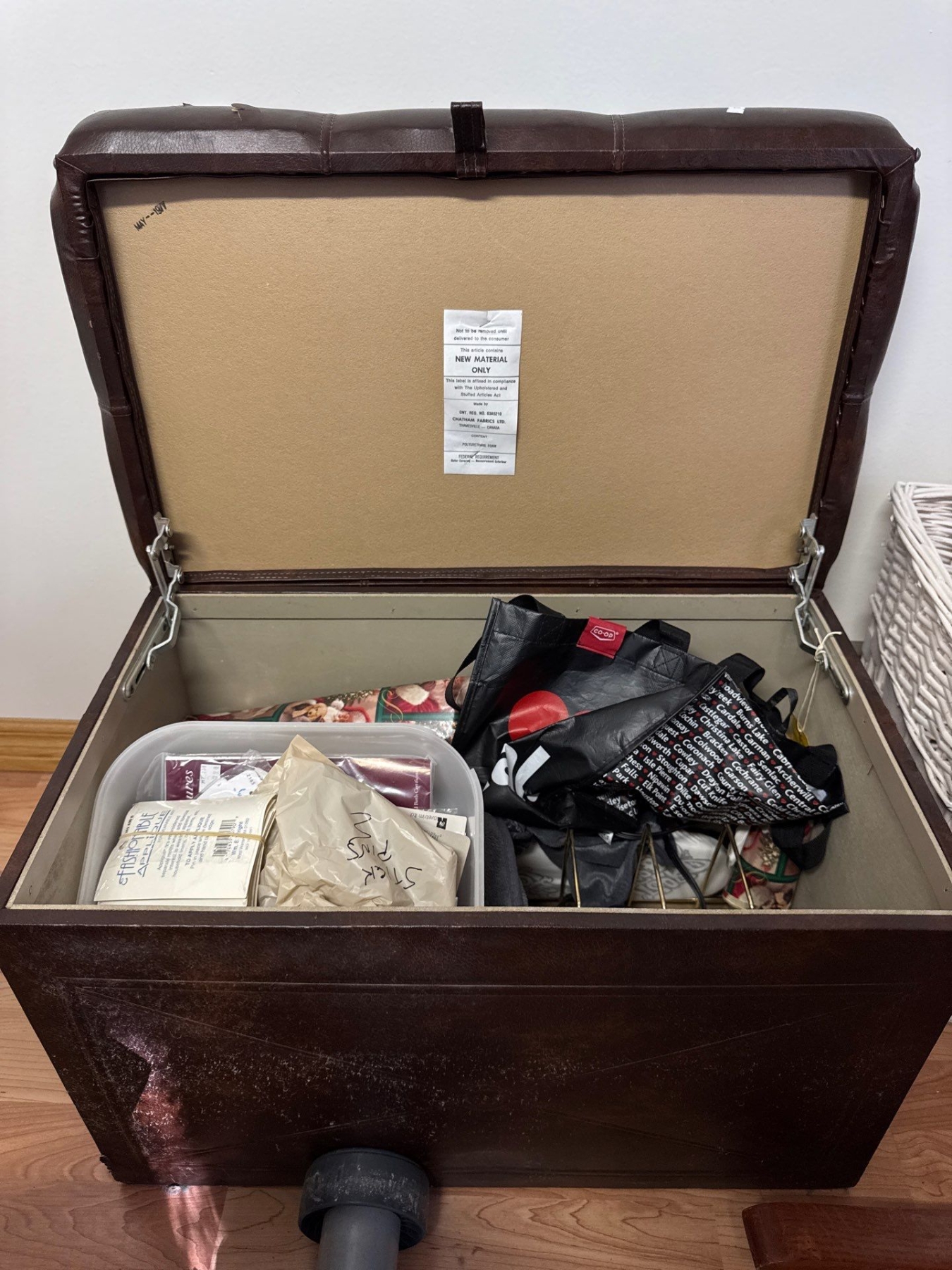 Antique Rocking Chair with cherry leather upholstery and a leather hutch with storage. All contents included.