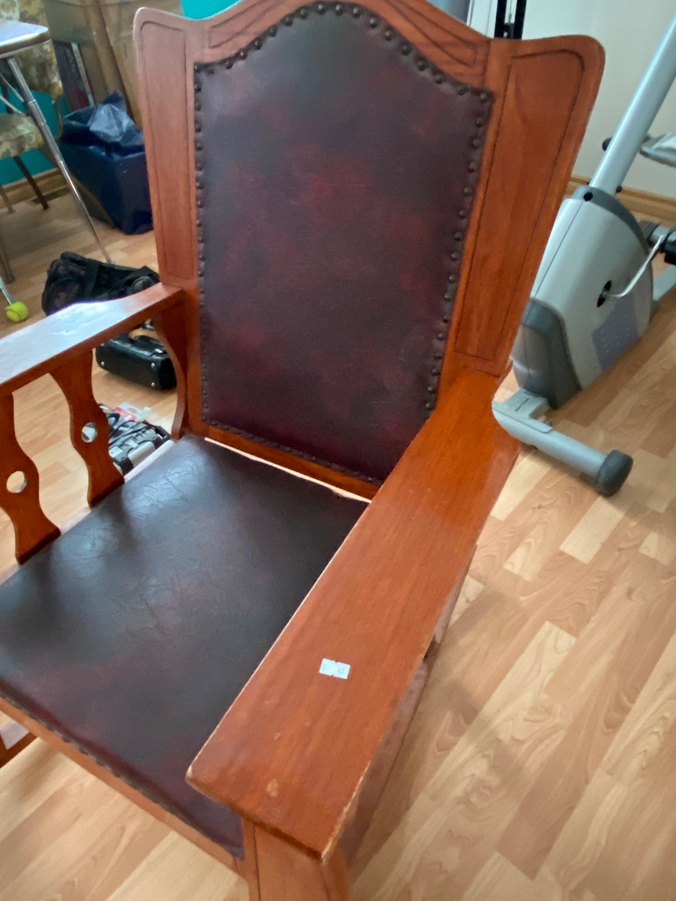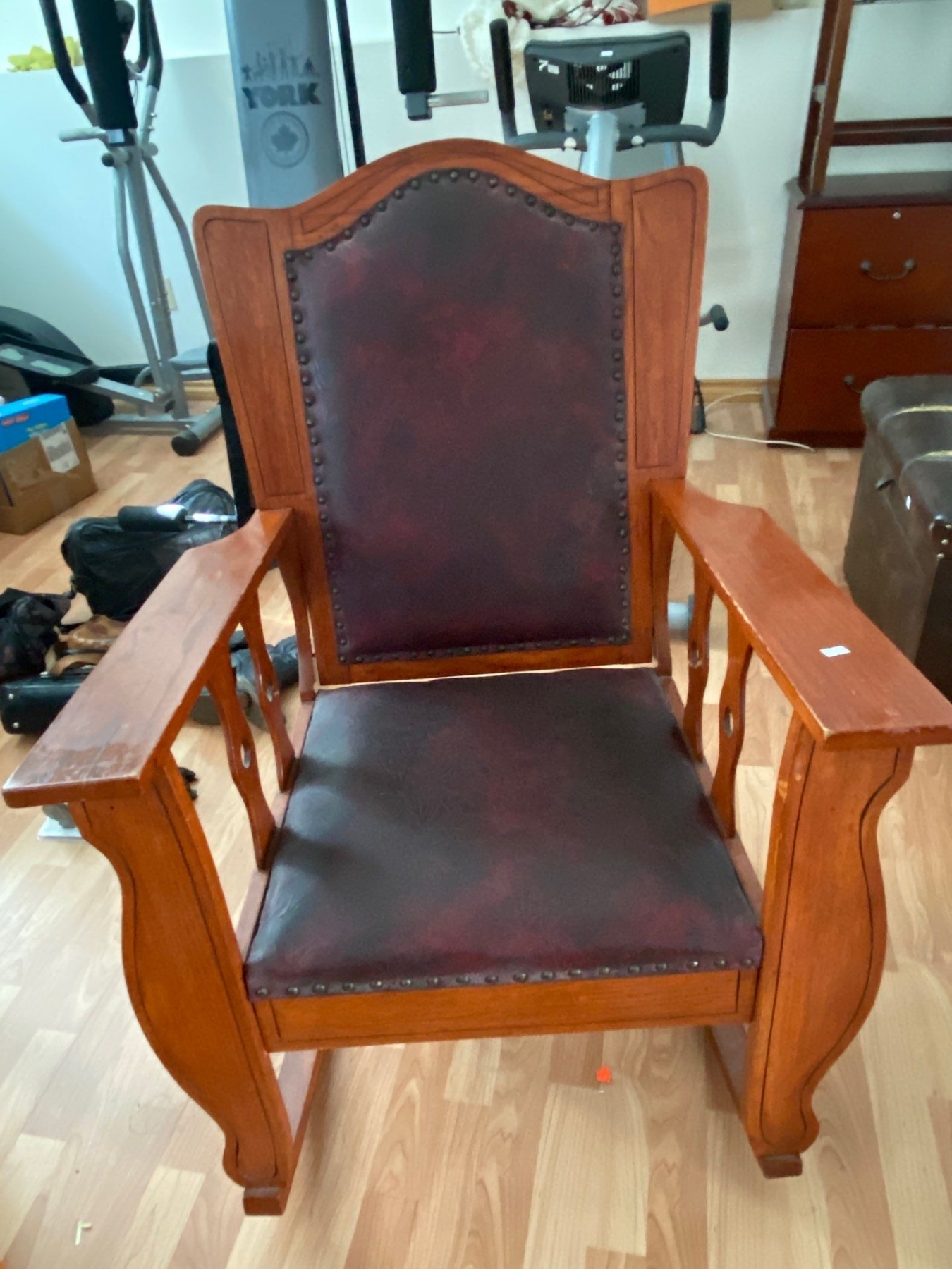 Antique Rocking Chair with cherry leather upholstery and a leather hutch with storage. All contents