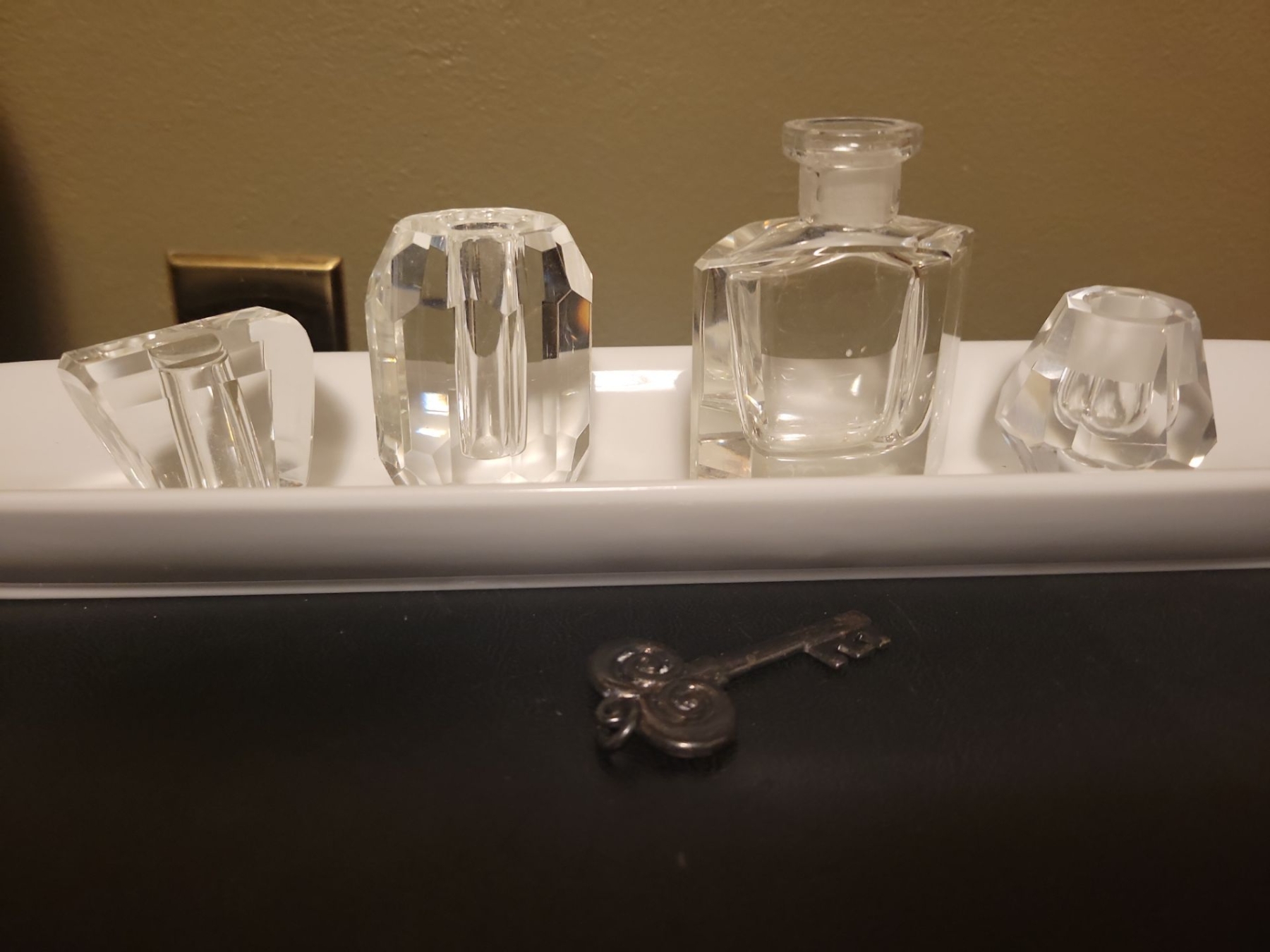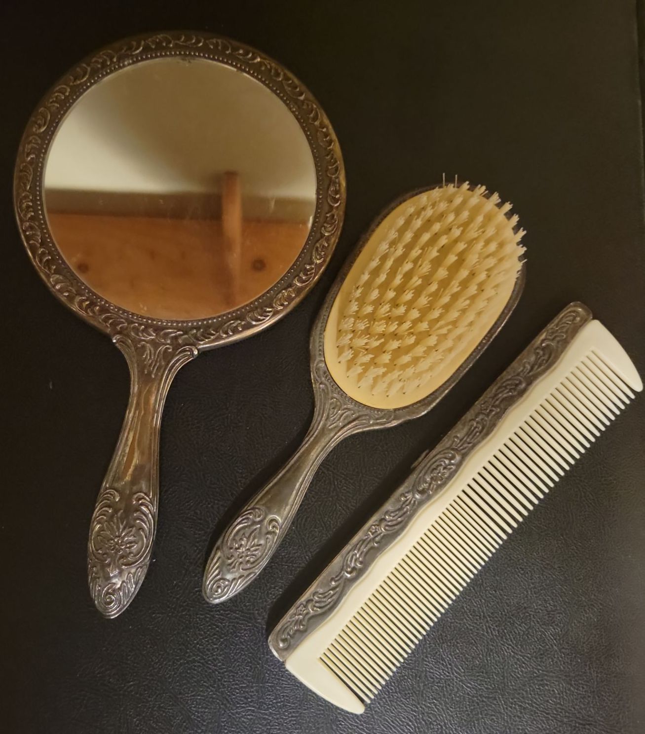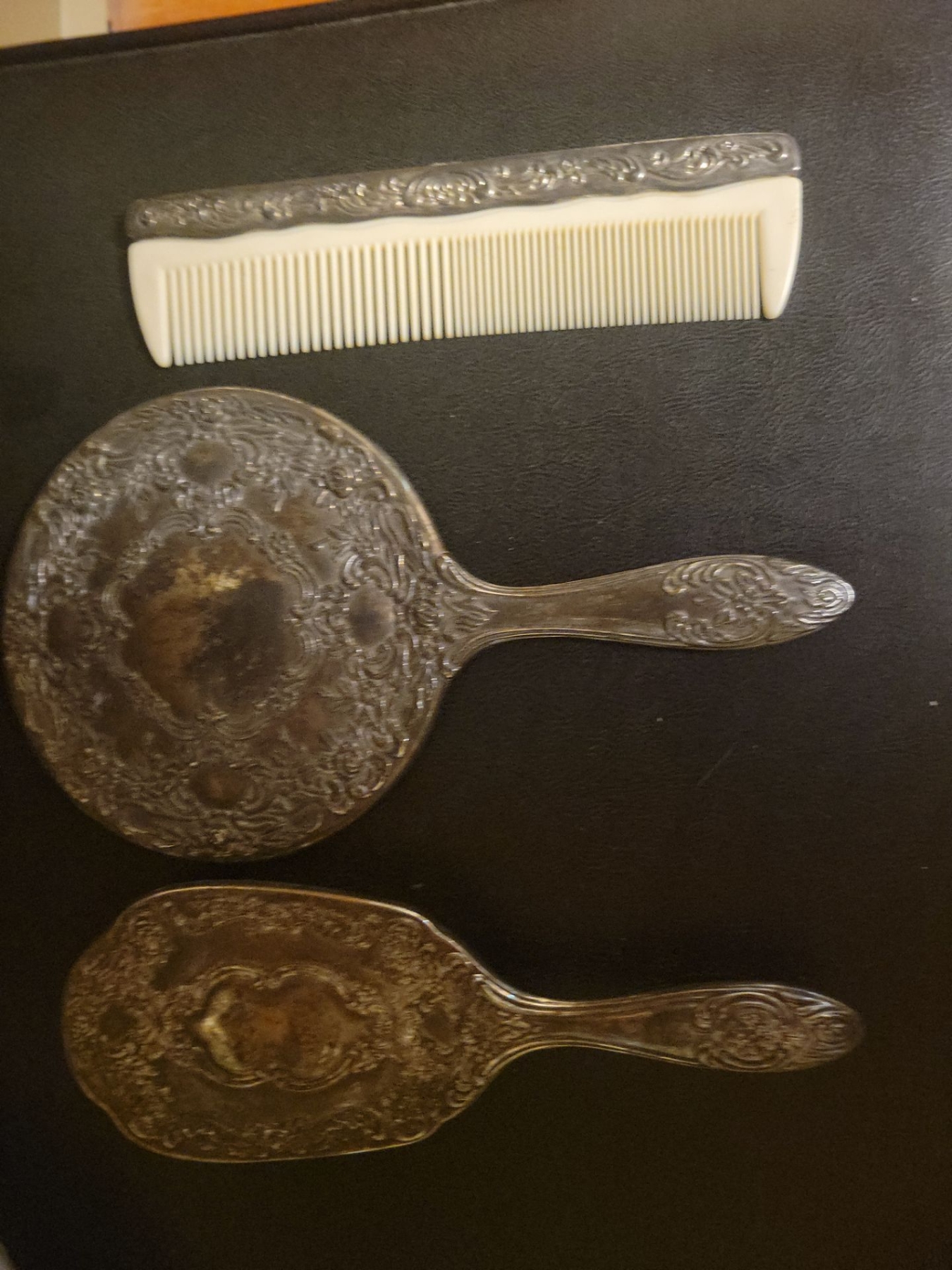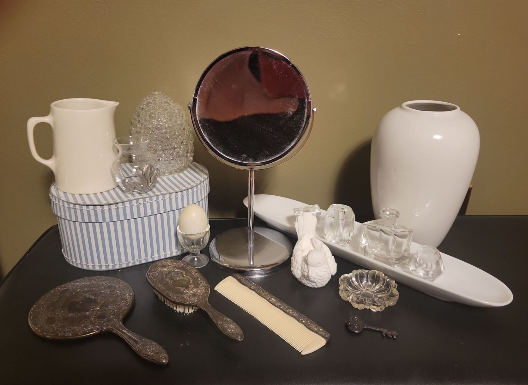Antique Silver Vanity Set w/ Crystal Perfume Bottles Desk Mirror Vase & more