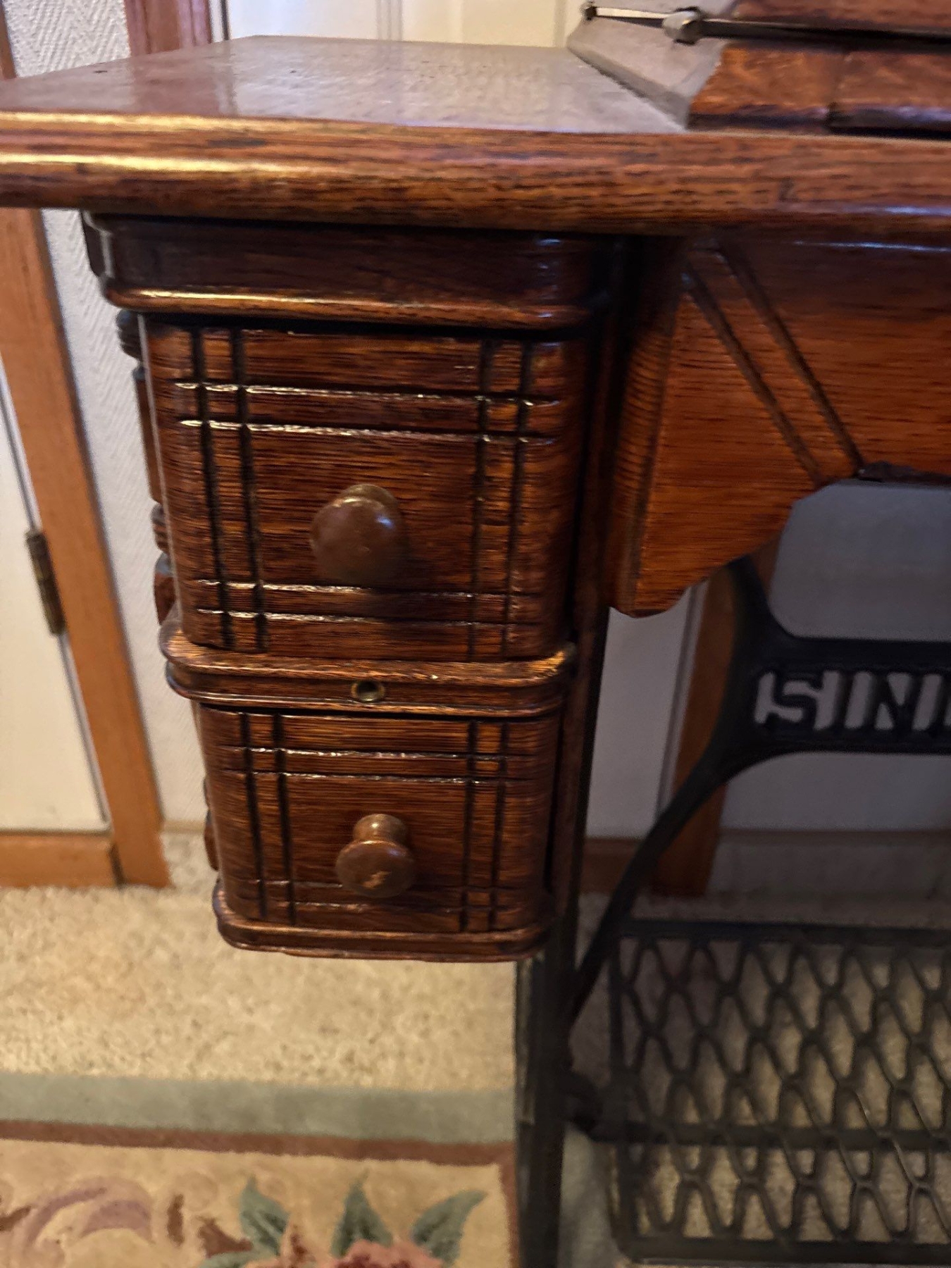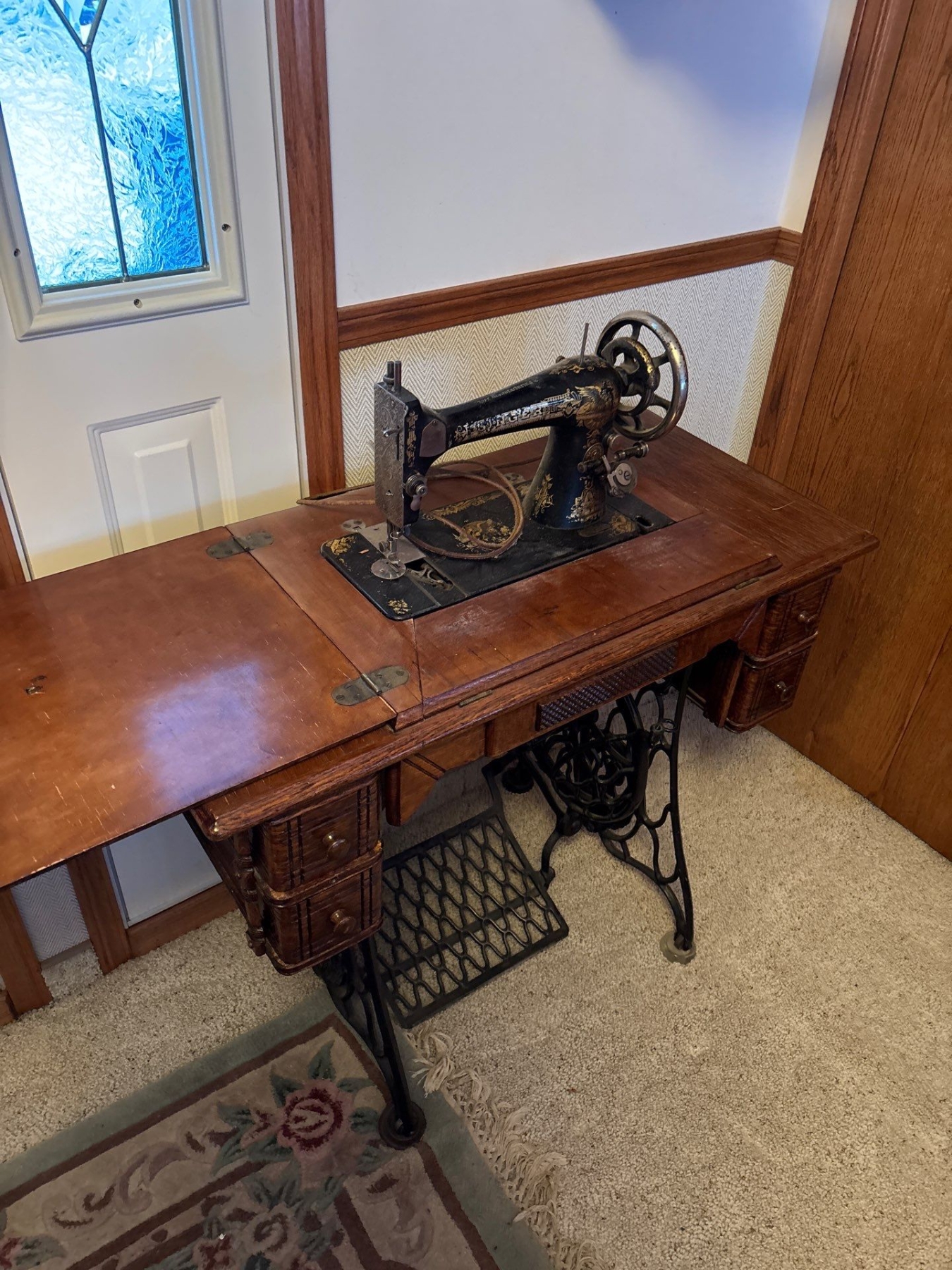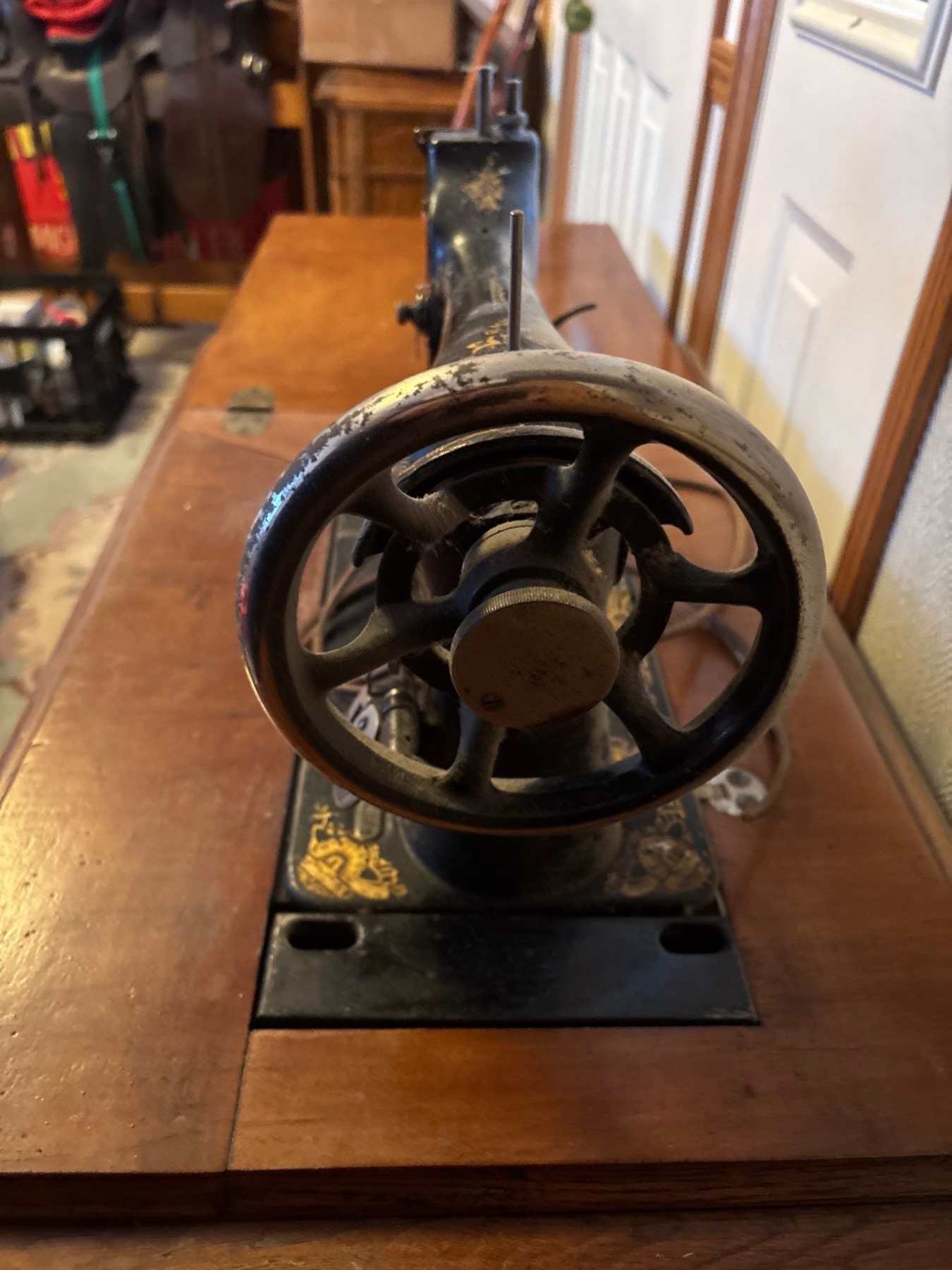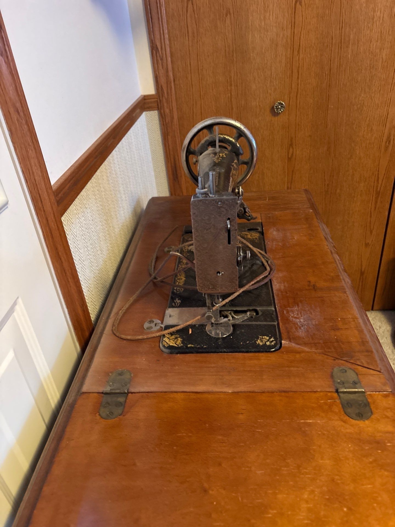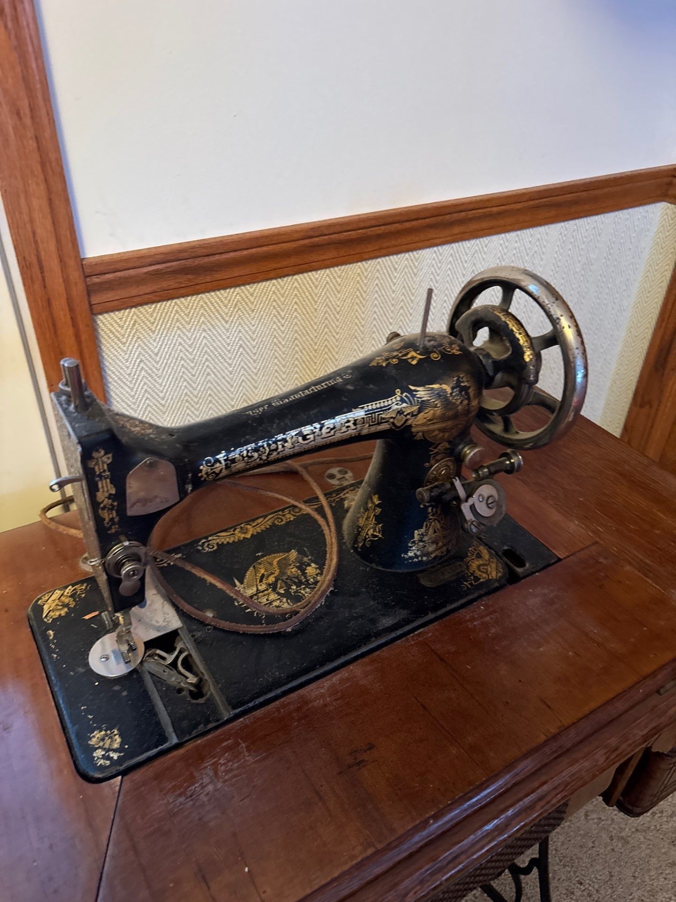 Antique Singer sewing machine, likely manufactured in the early 1900s, housed within its original wooden cabinet. Includes original leather belts to spin wheel in nice condition.