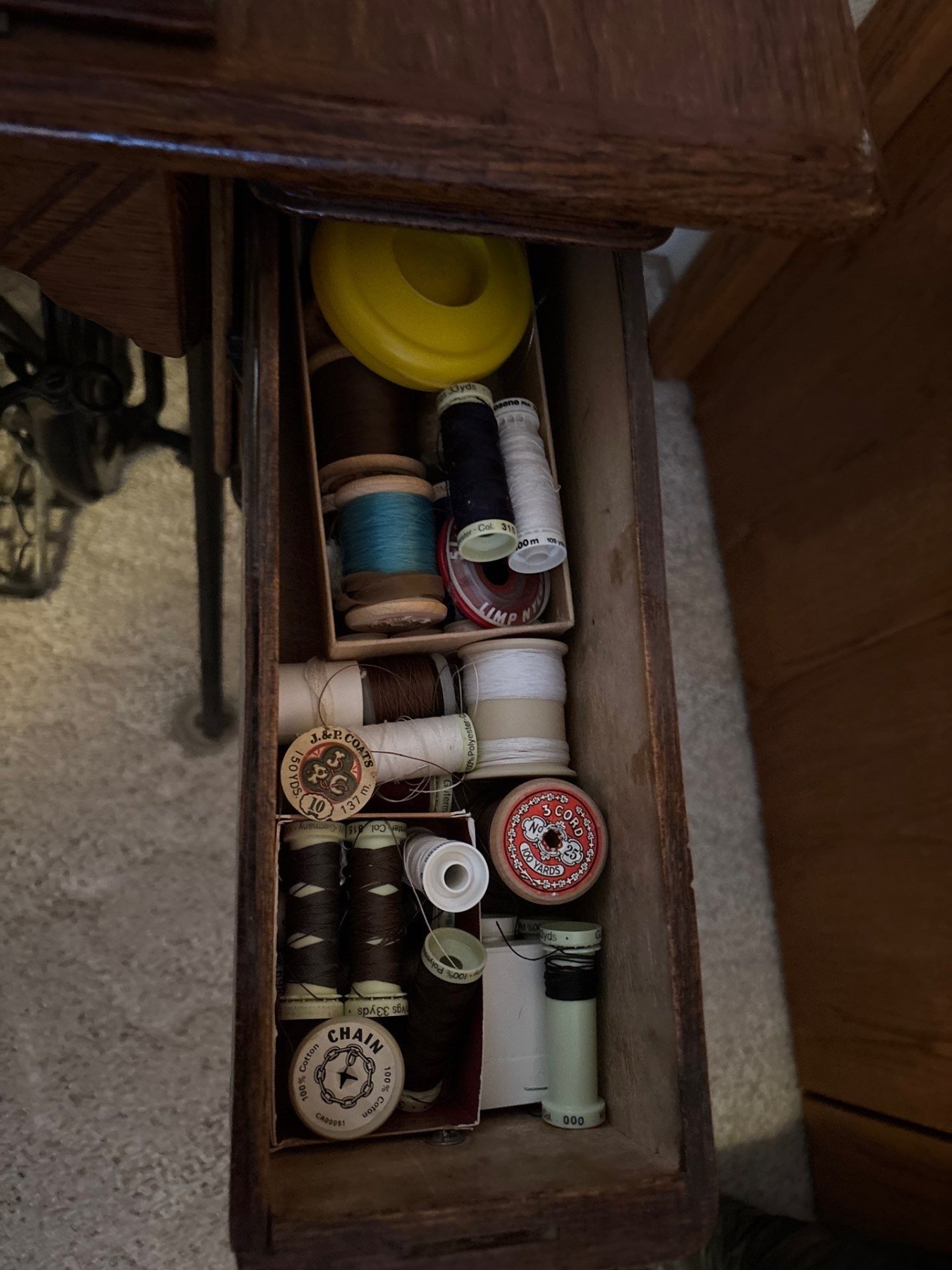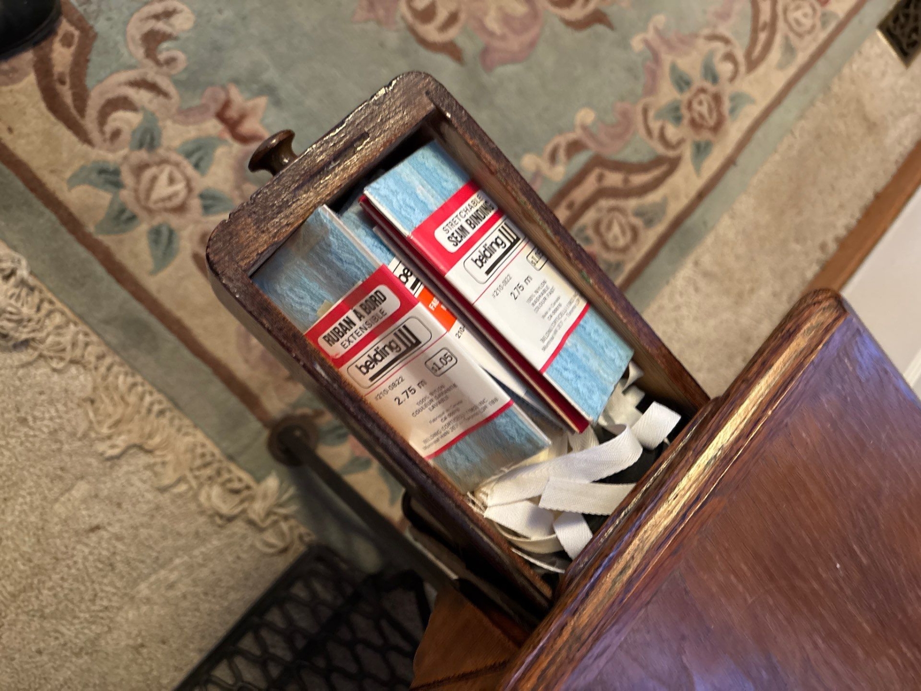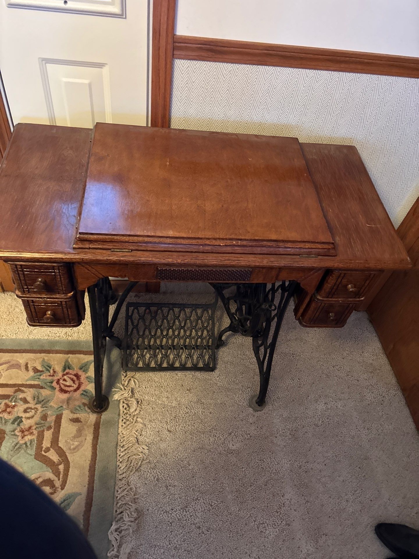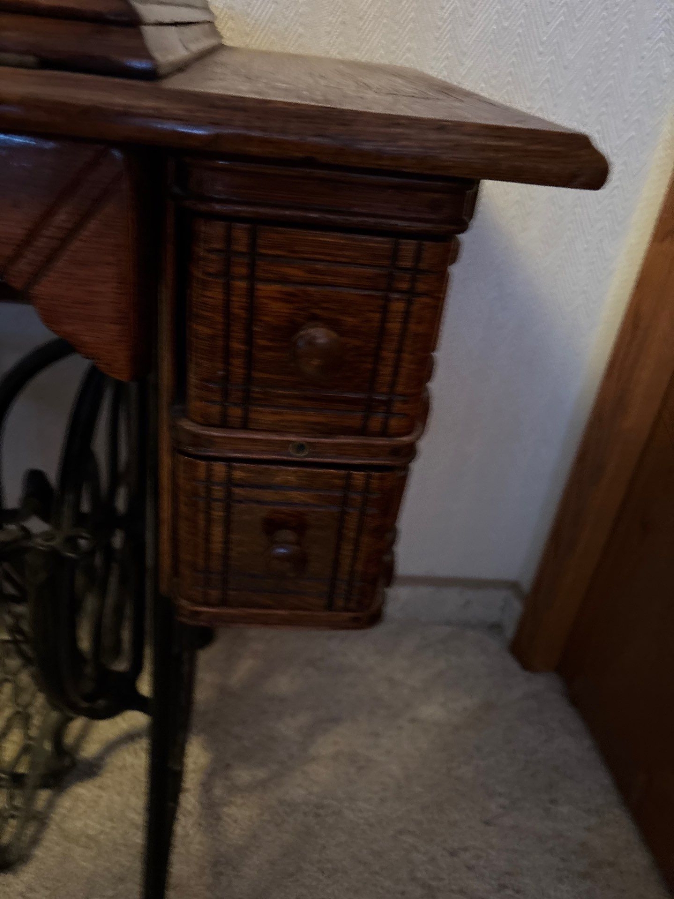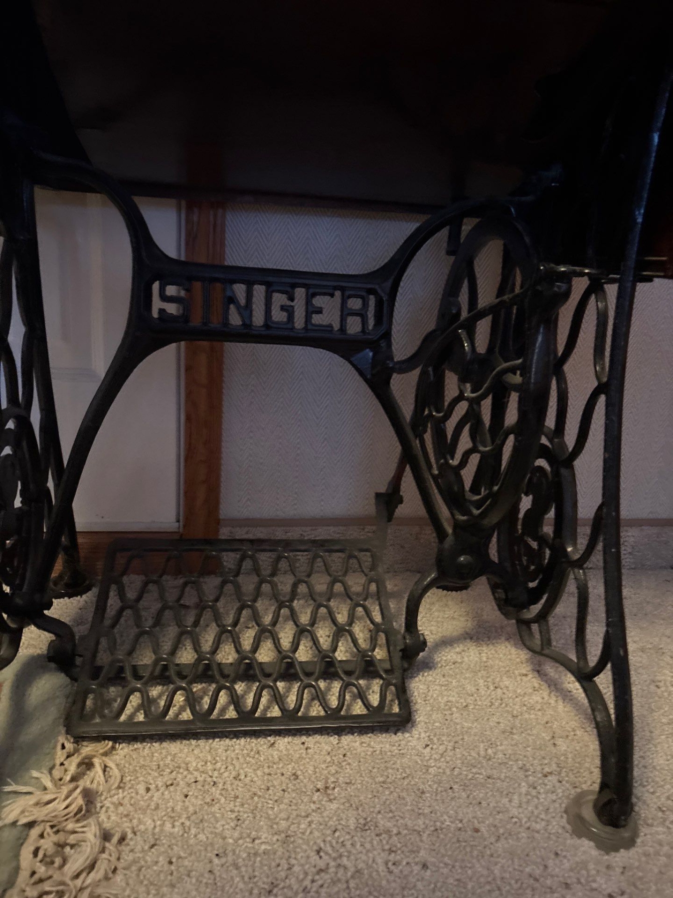 Antique Singer sewing machine, likely manufactured in the early 1900s, housed within its original wooden cabinet. Includes original leather belts to spin wheel in nice condition.