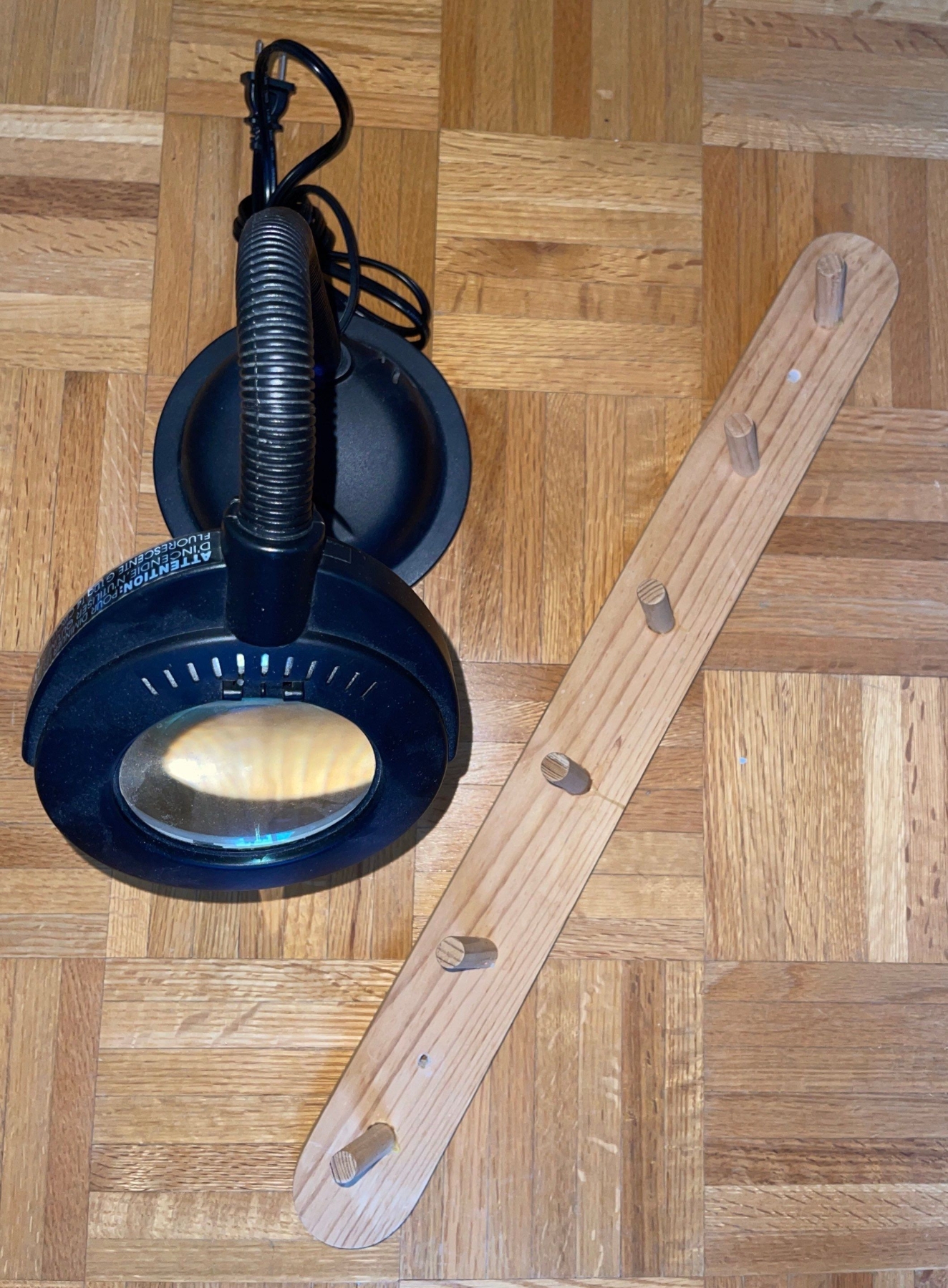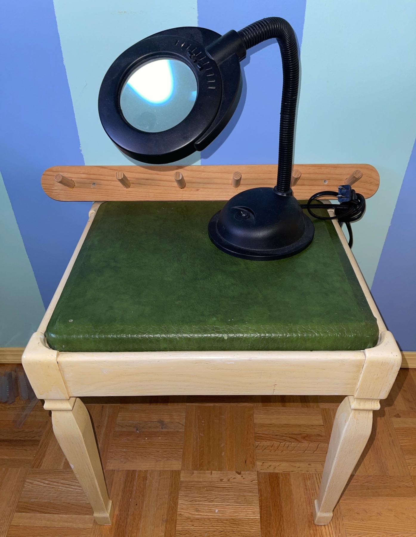 Antique Sitting Mini Bench For Sewing w/ Wooden Coat Hangers & Magnifying Lamp