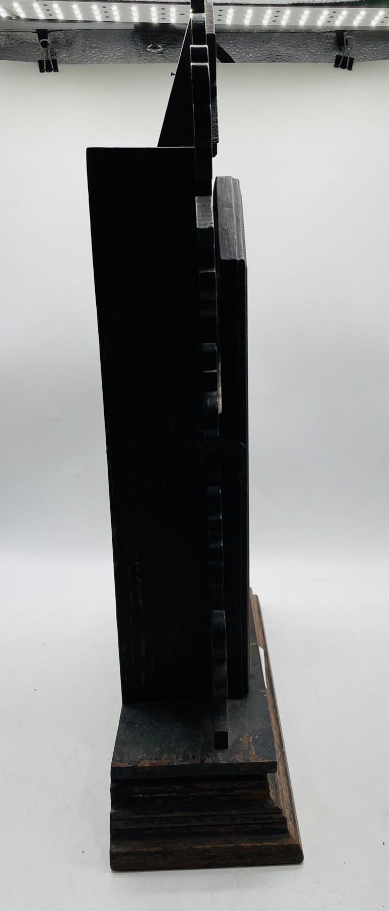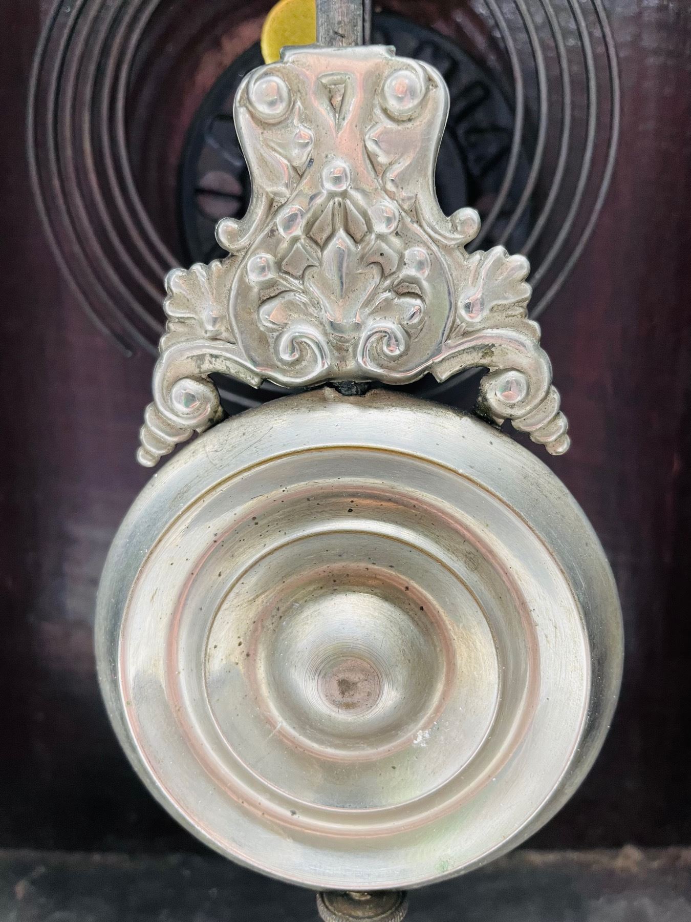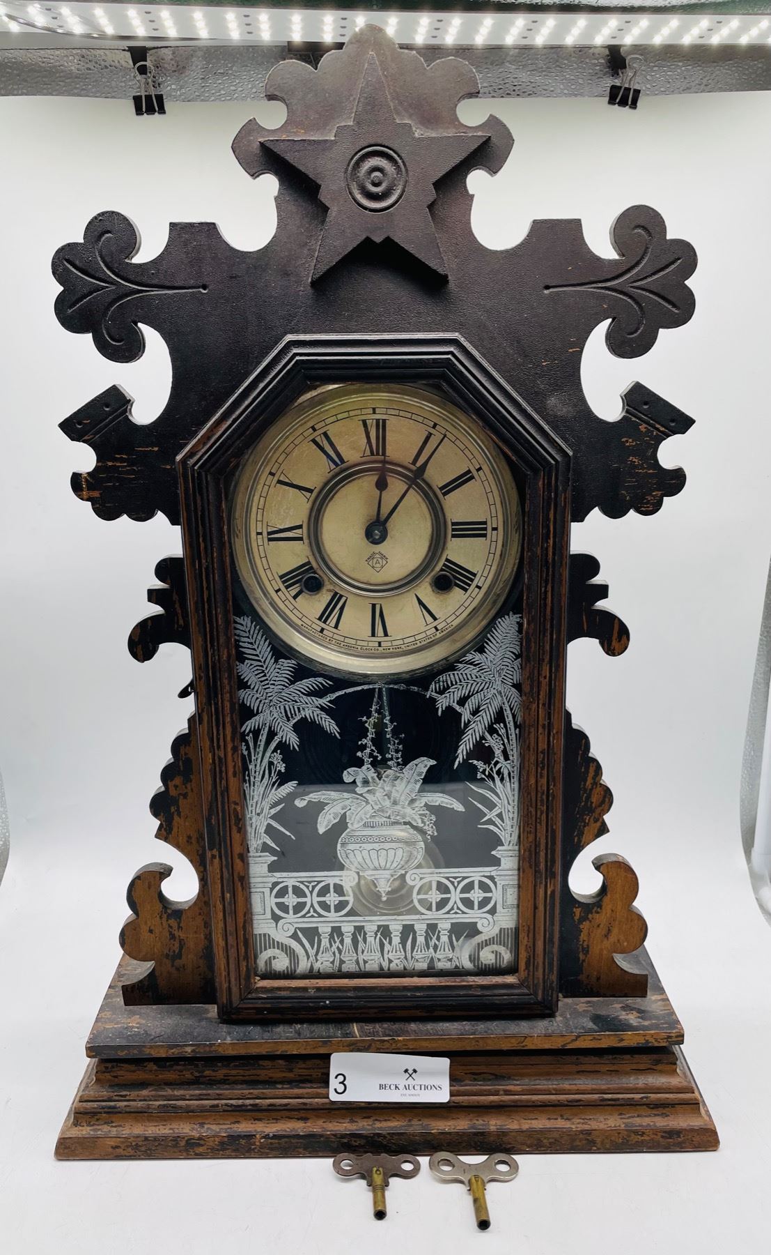 Nice rare Ansonia Clock Company kitchen shelf clock (or mantle clock) with what are believed to be all the original parts. Made beginning in 1883 until 1929 and the New York, U.S.A. The clock face is about 6" and along with the metal/ brass, shows some age discoloration and wear. Wood shows signs of wear as well. Measures approx. 22-1/2" high x 12" wide x 5 " deep. Not tested.