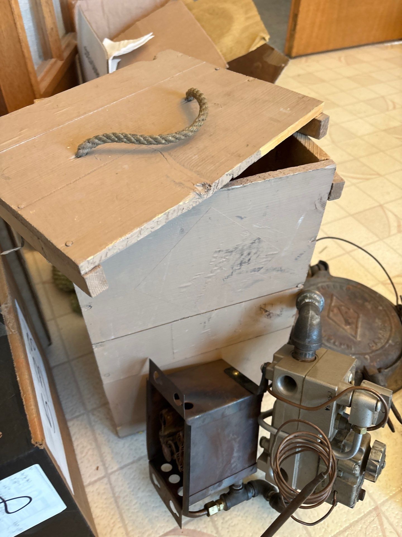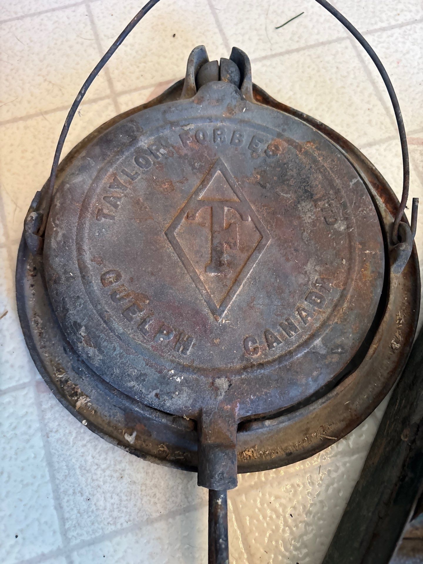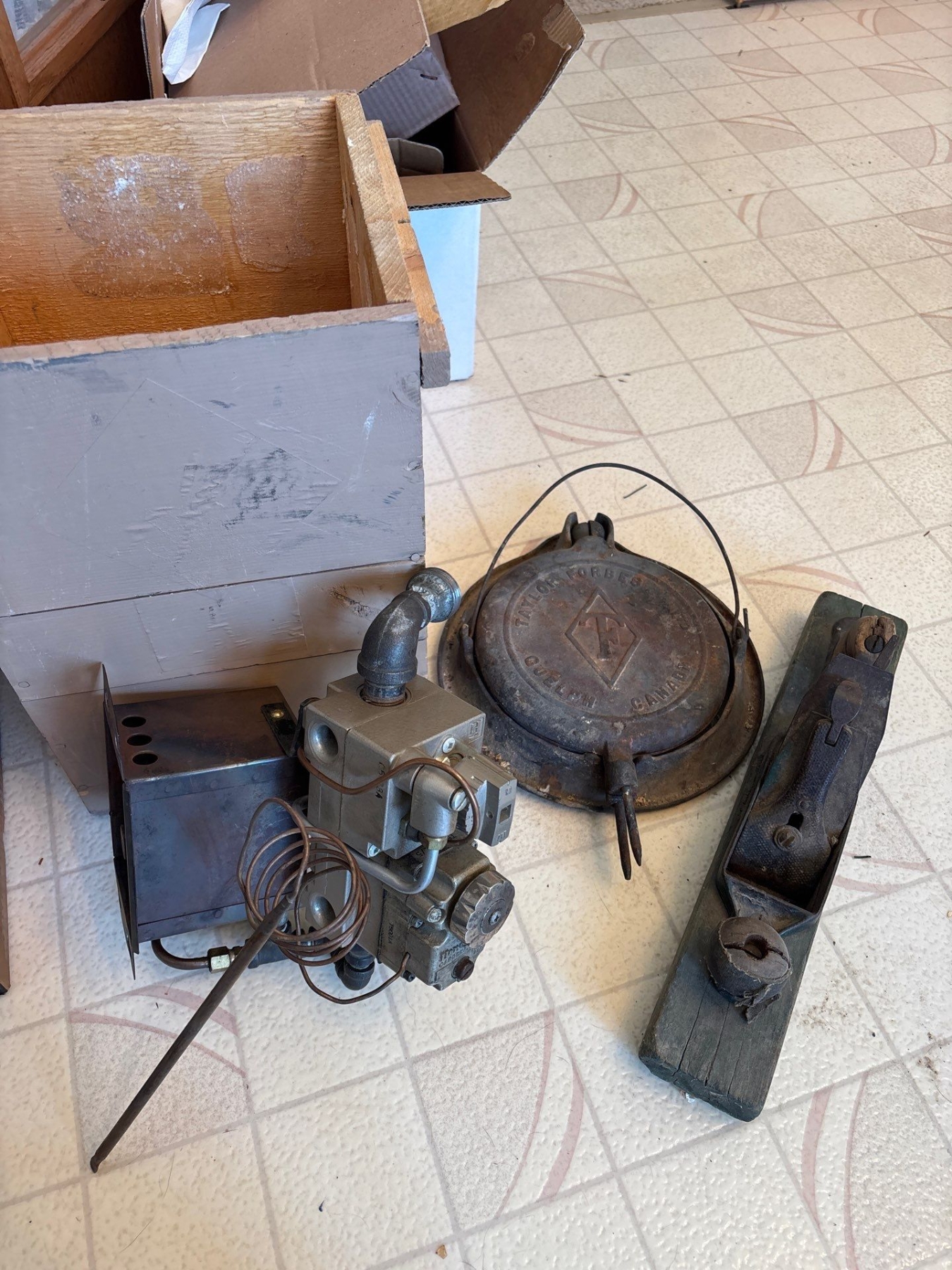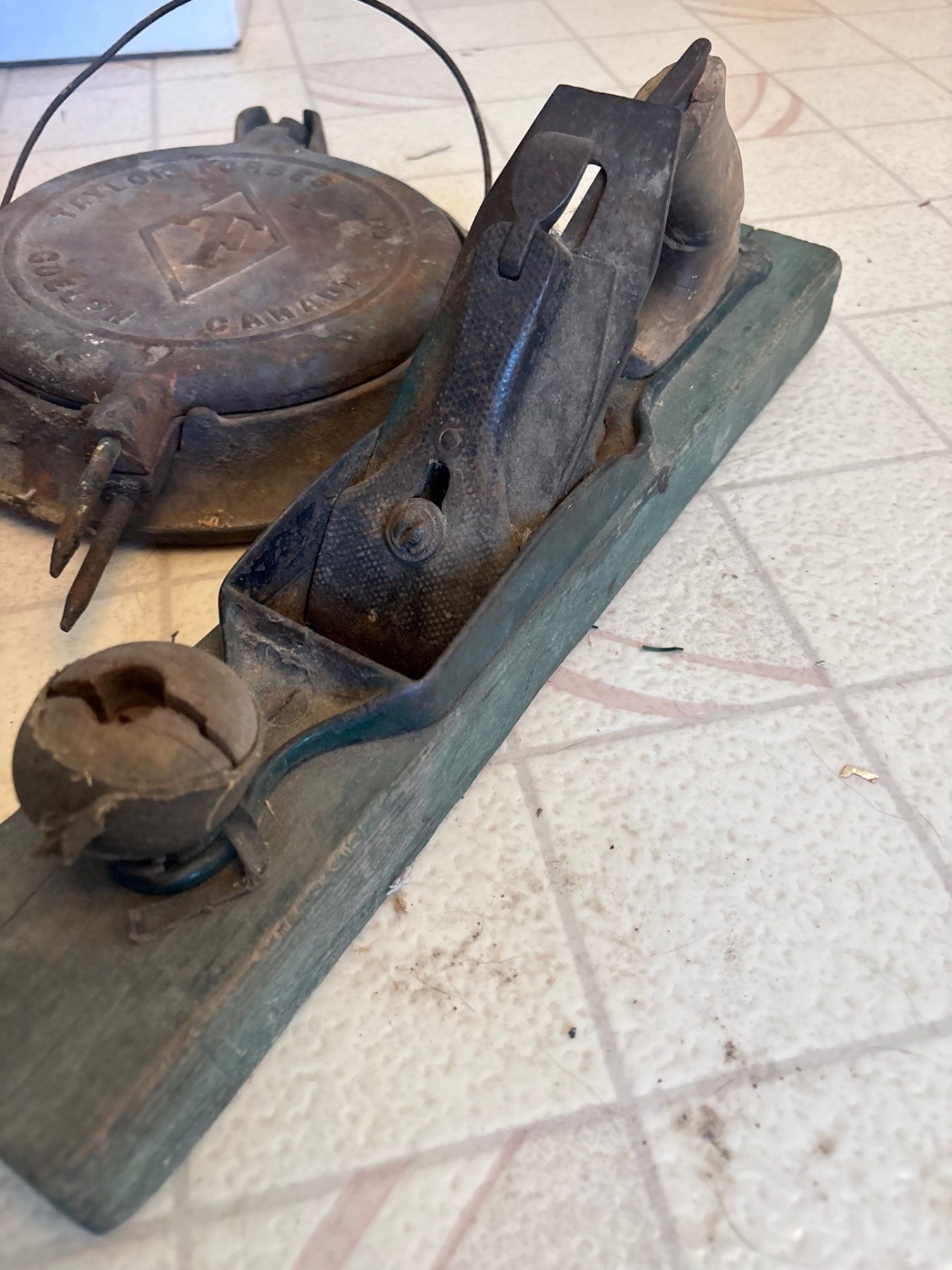 Antique Taylor Forbes cast iron waffle iron Antique wood Plane with honeywell burner and handmade wooden box
