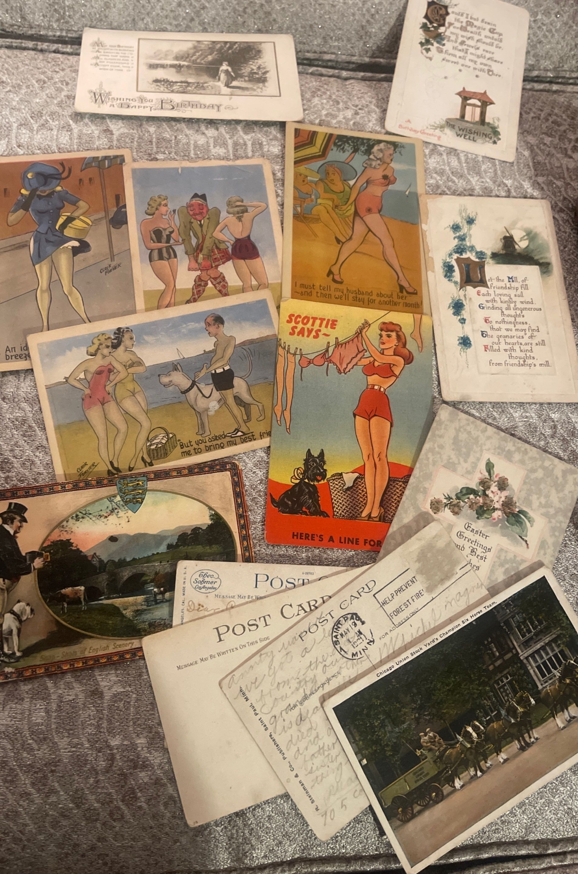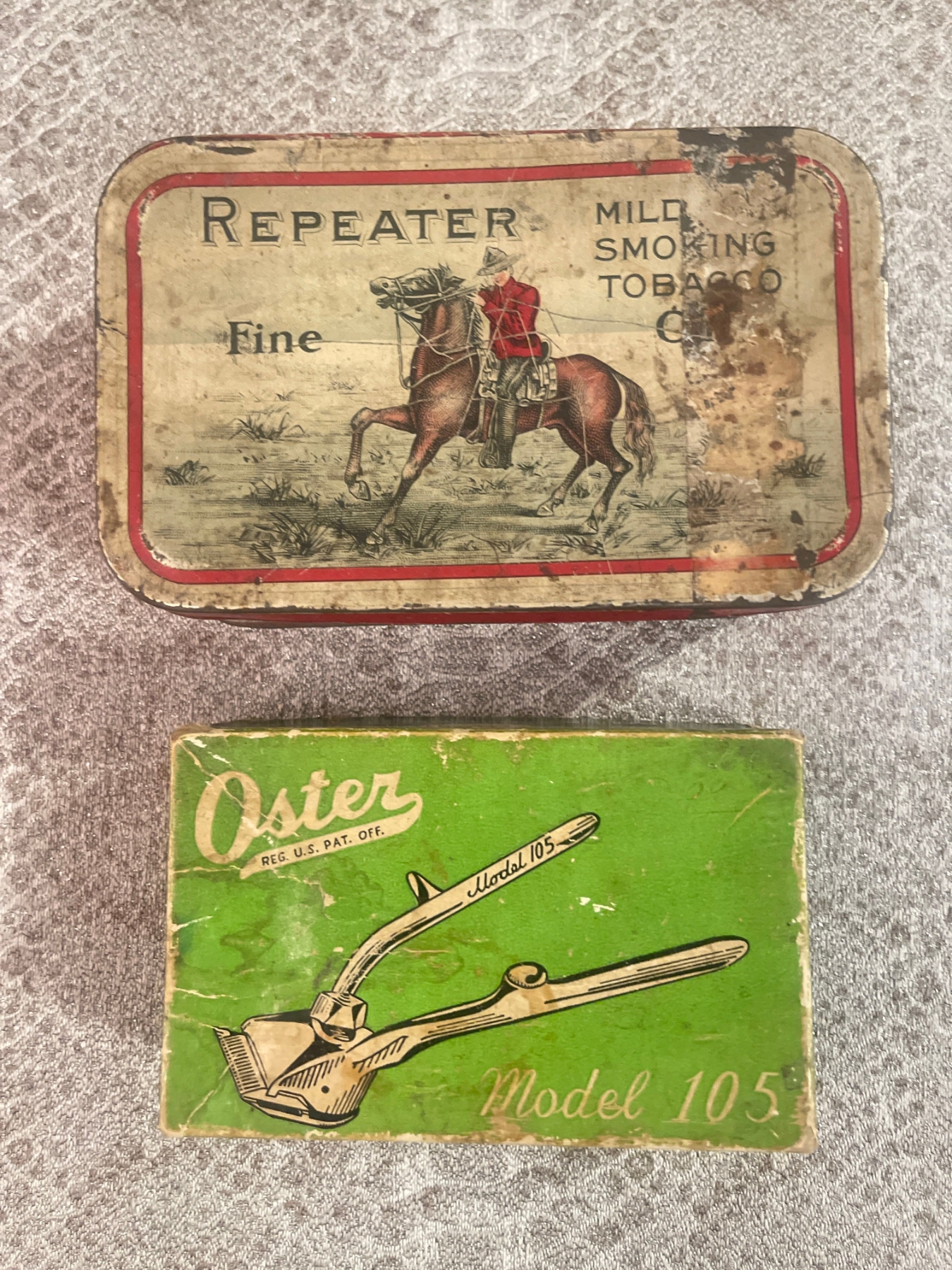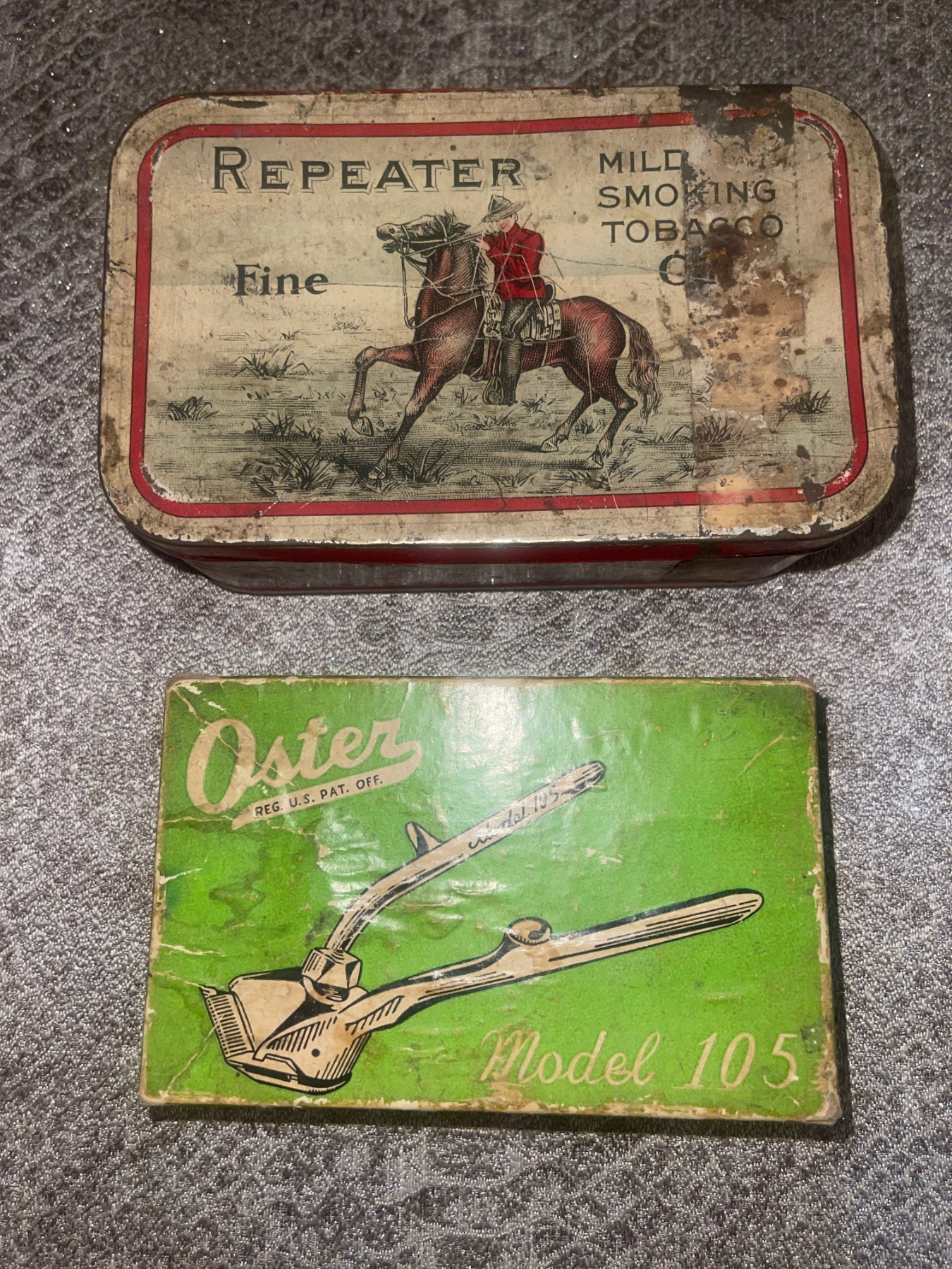 Antique Tobacco Tin Pocket Watch Oster Manual Clippers Mo.105 w/ Assorted Postcard Collection