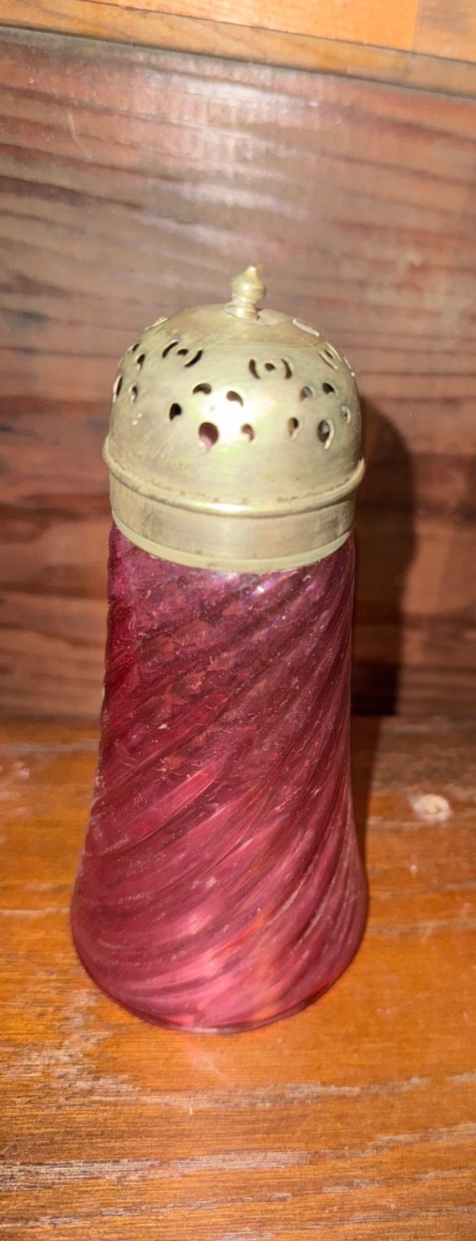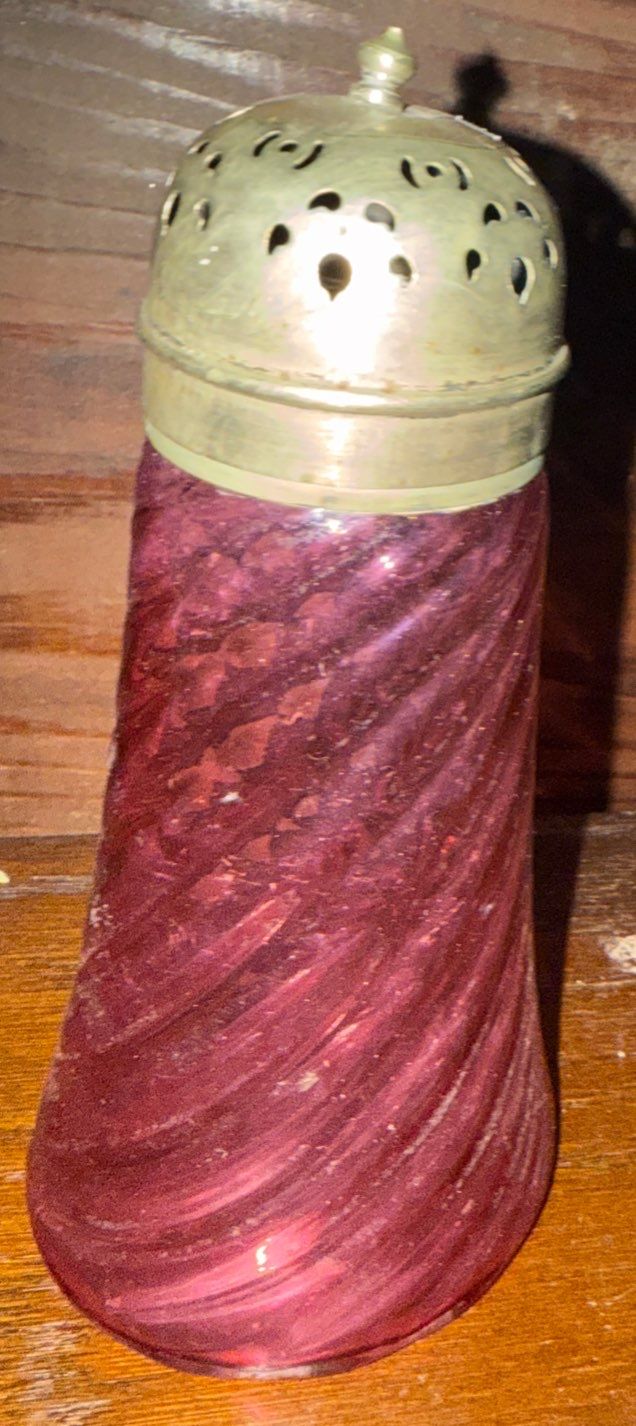 Antique Victorian Cranberry Red Glass Swirled Twist Round Sugar Shaker Muffineer