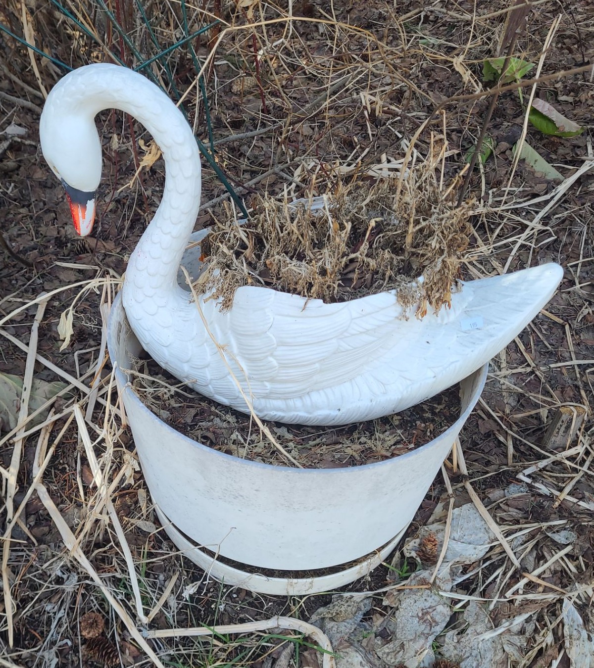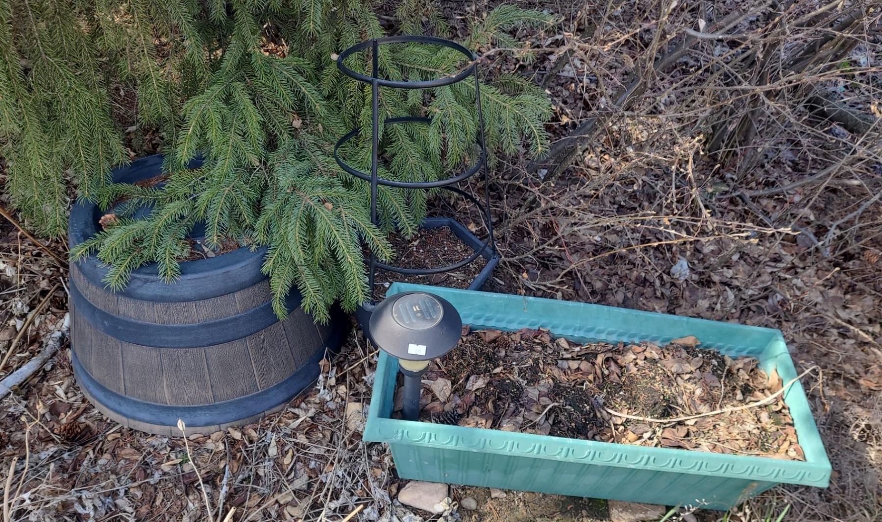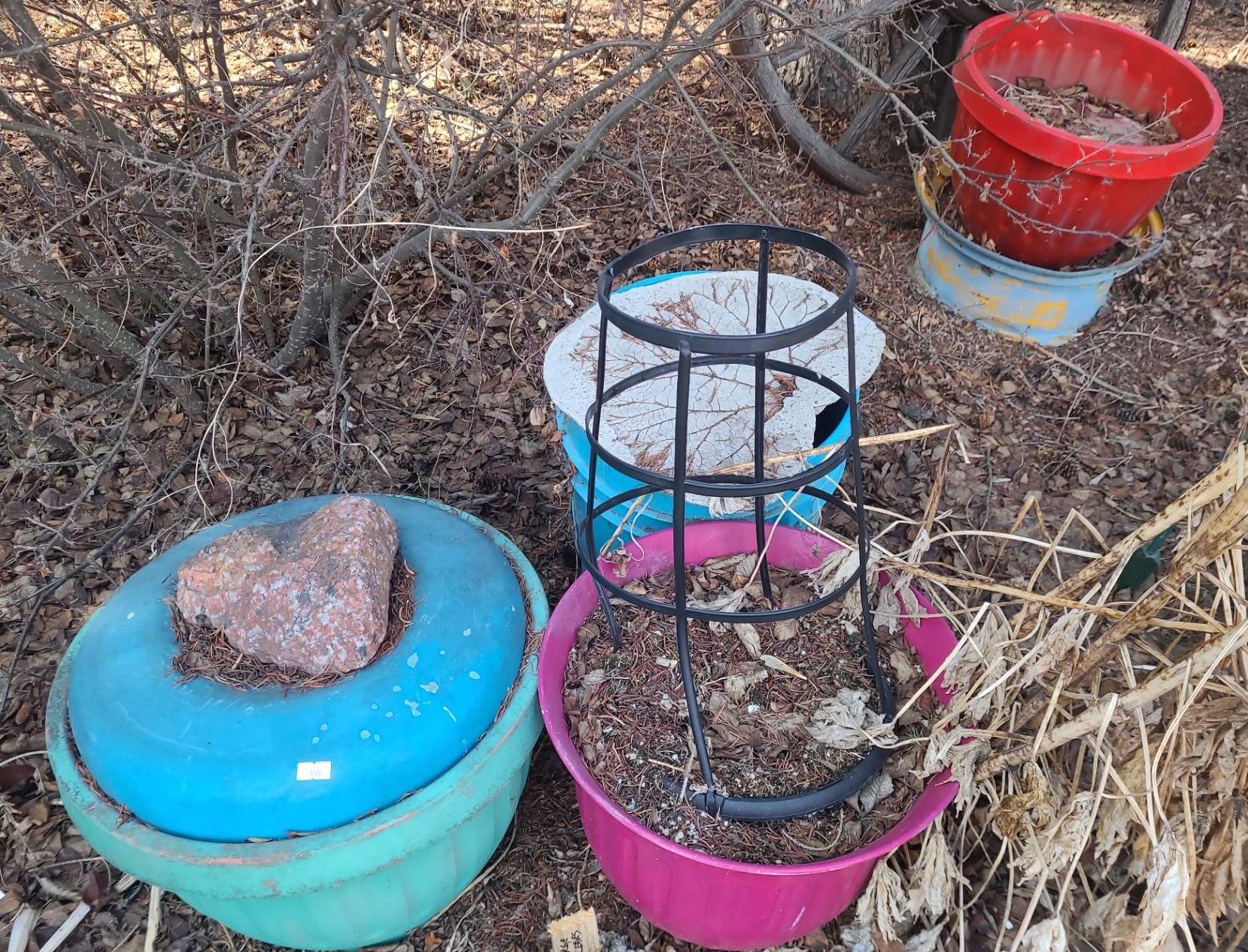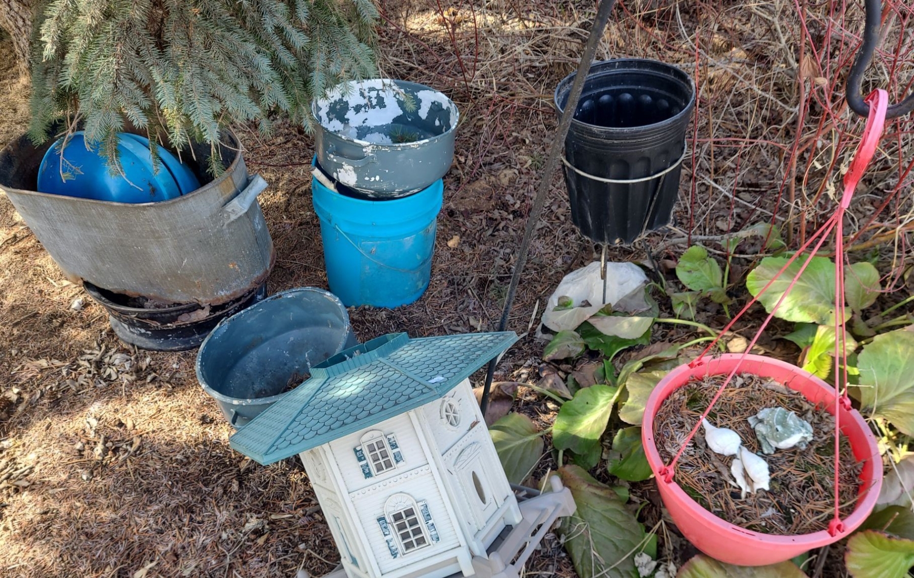 Weathered, Galvanized Planter Bottom Worn, Extra Planters Not Shown as Well, Birdhouse Has Cracks in Plastic