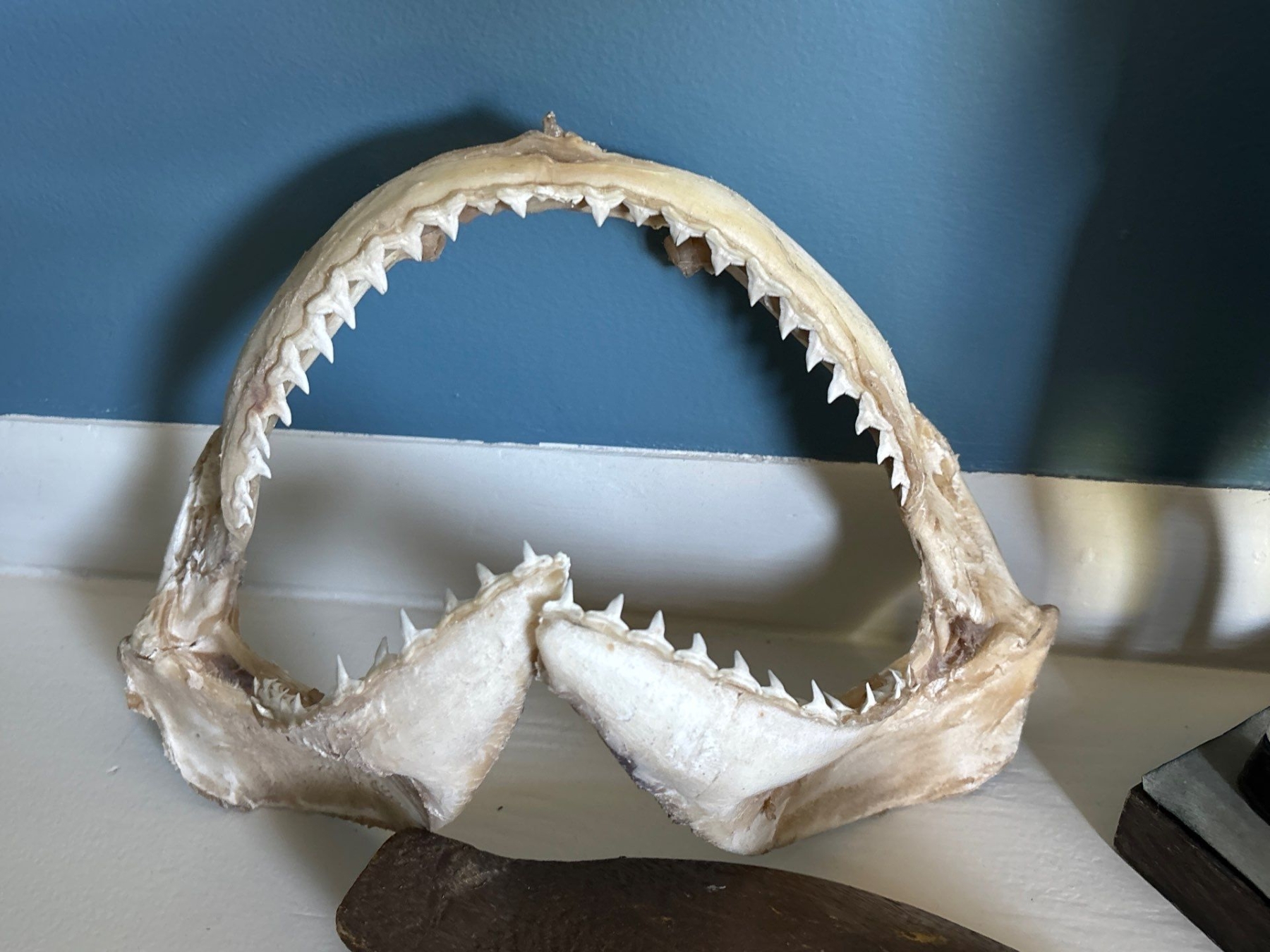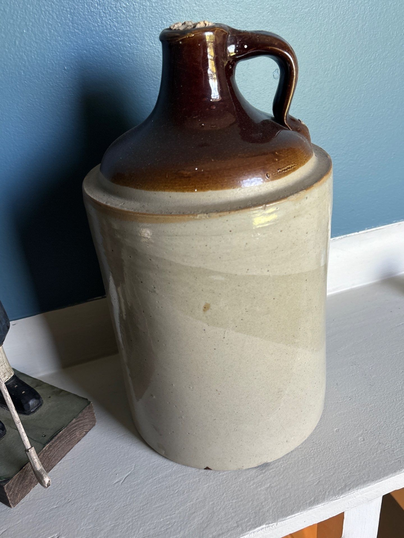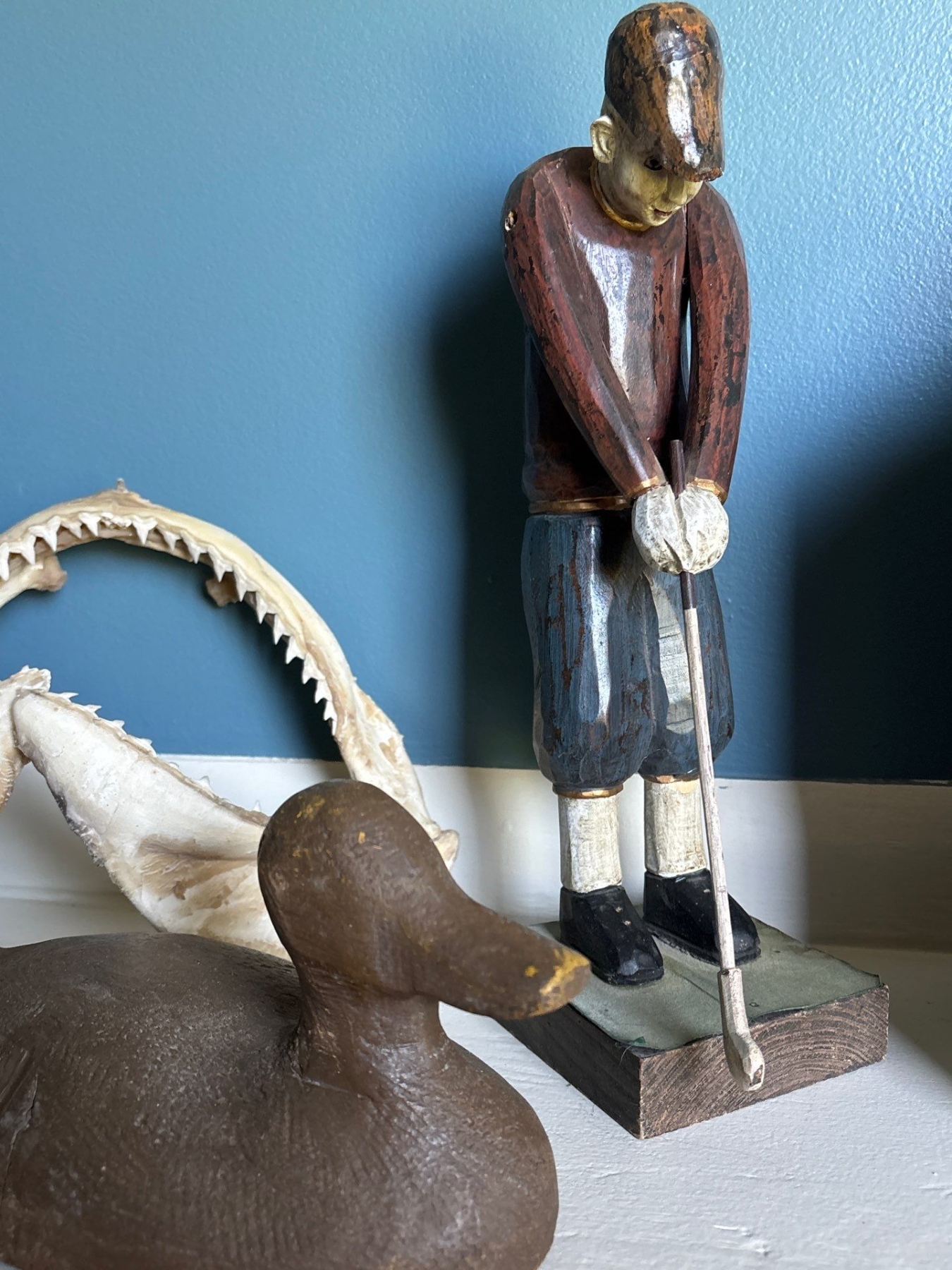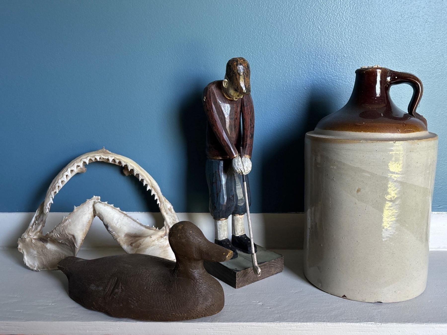 Antique Whiskey Clay Jug With Authentic Shark Jaw With Teeth Wooden Duck & Golf Statue