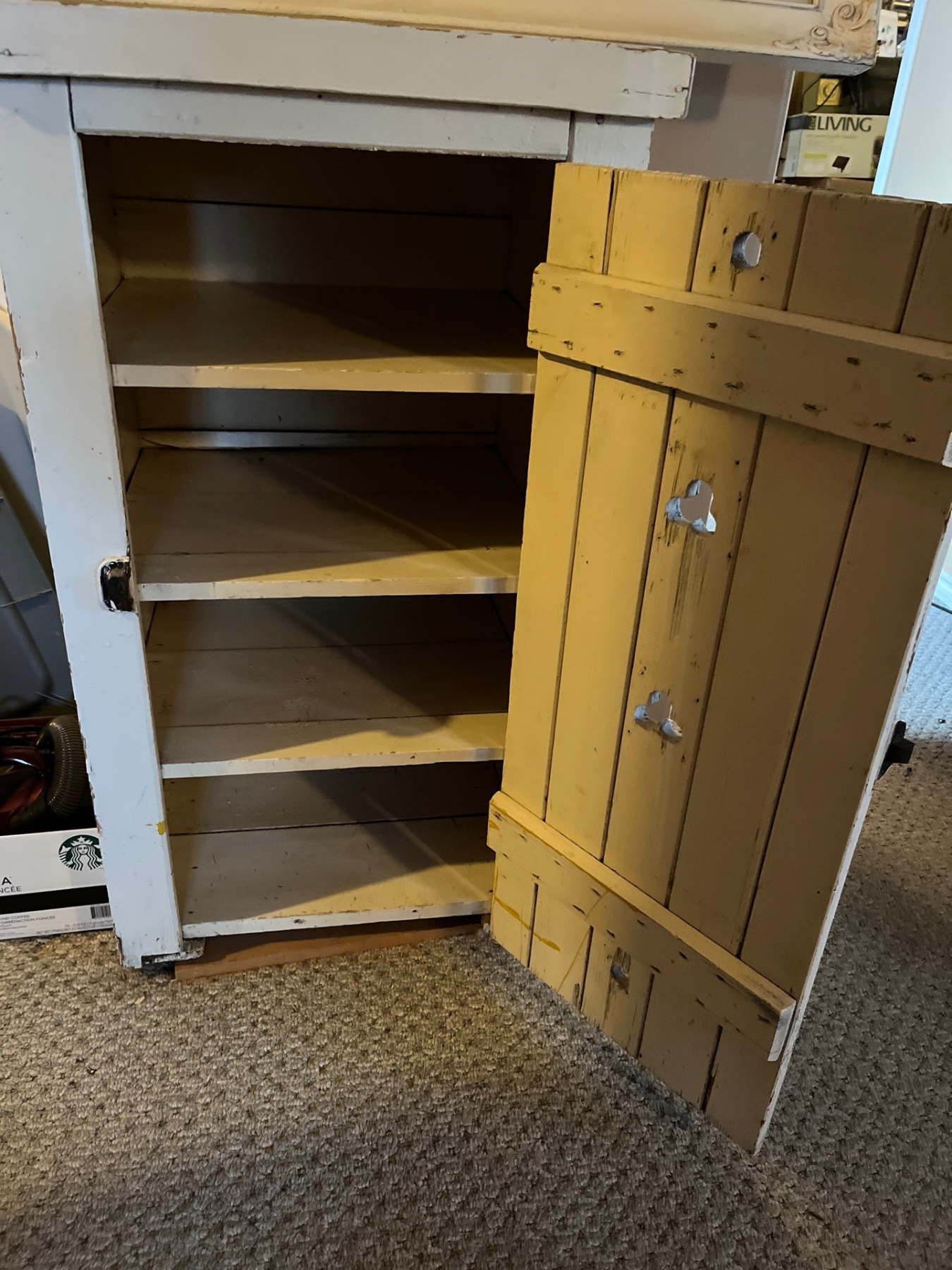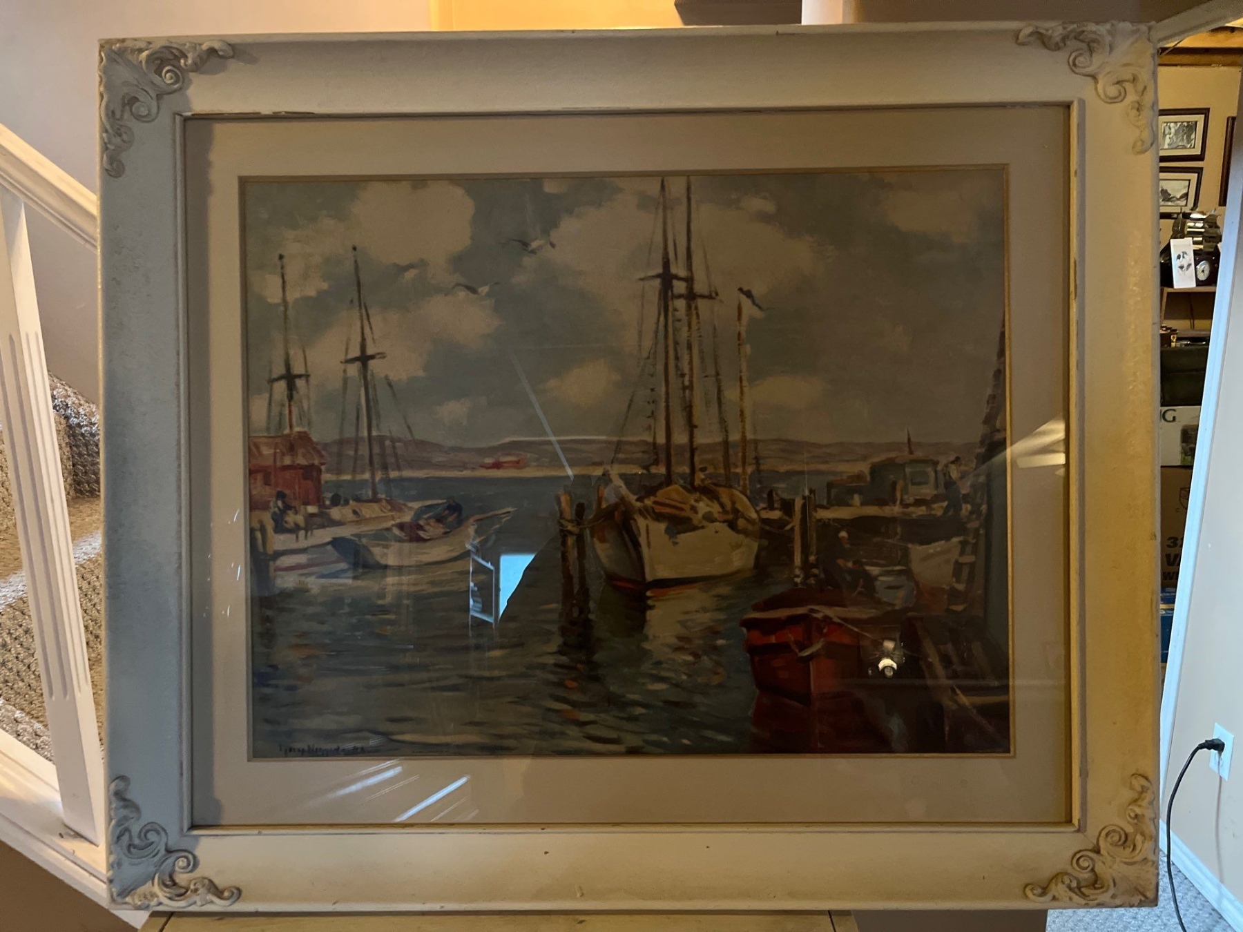 Antique handmade wooden cupboard with sailboat, painting, and beautiful white frame