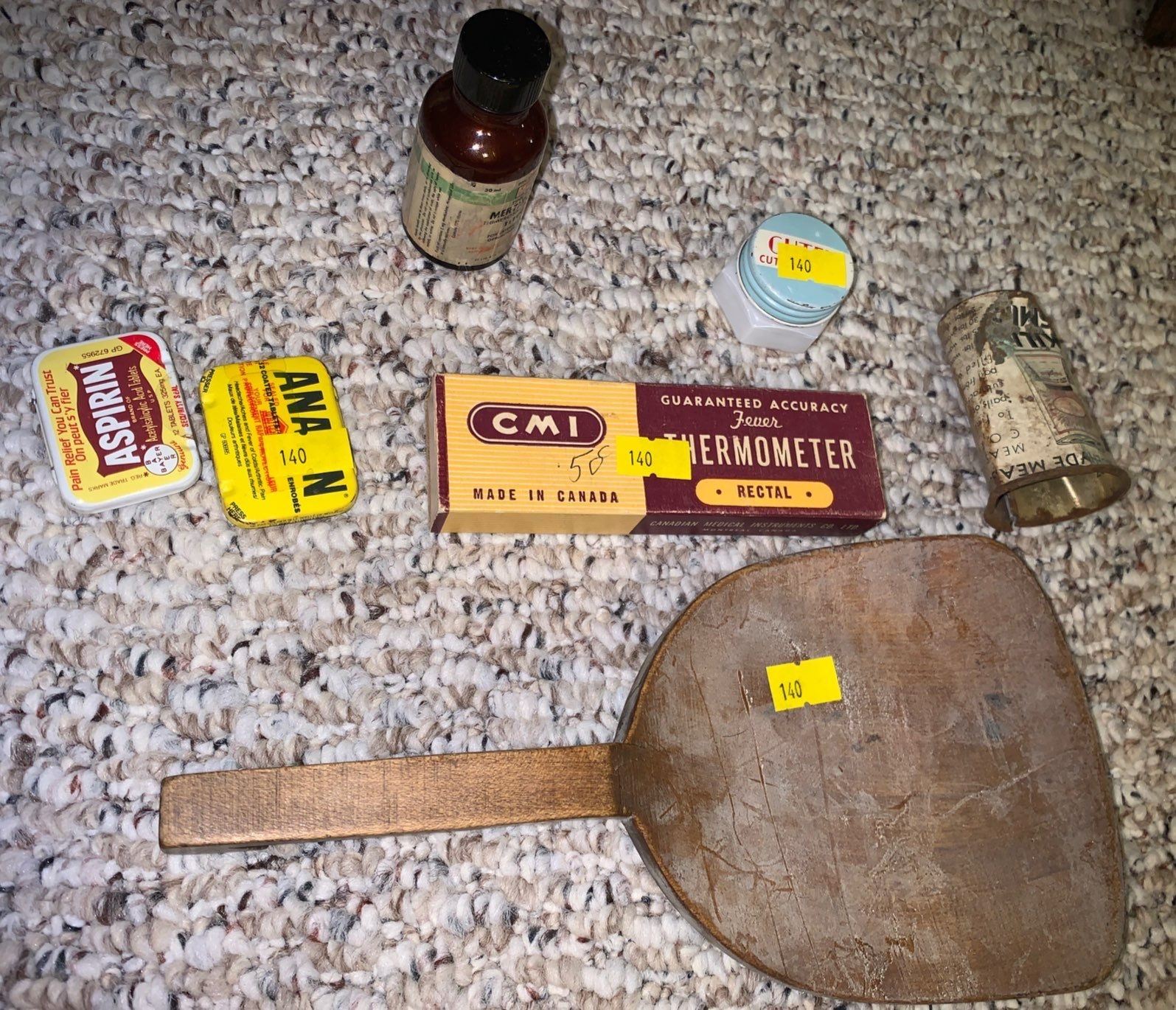 Antique home items; butter paddle, thermometer, formaldehyde measuring cup, pill boxes, cuticle box