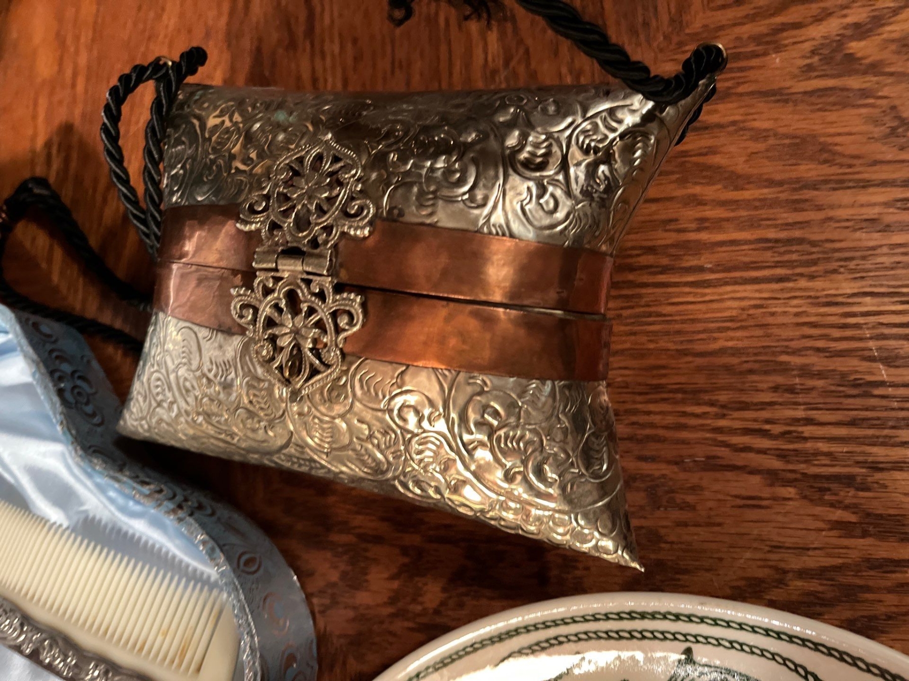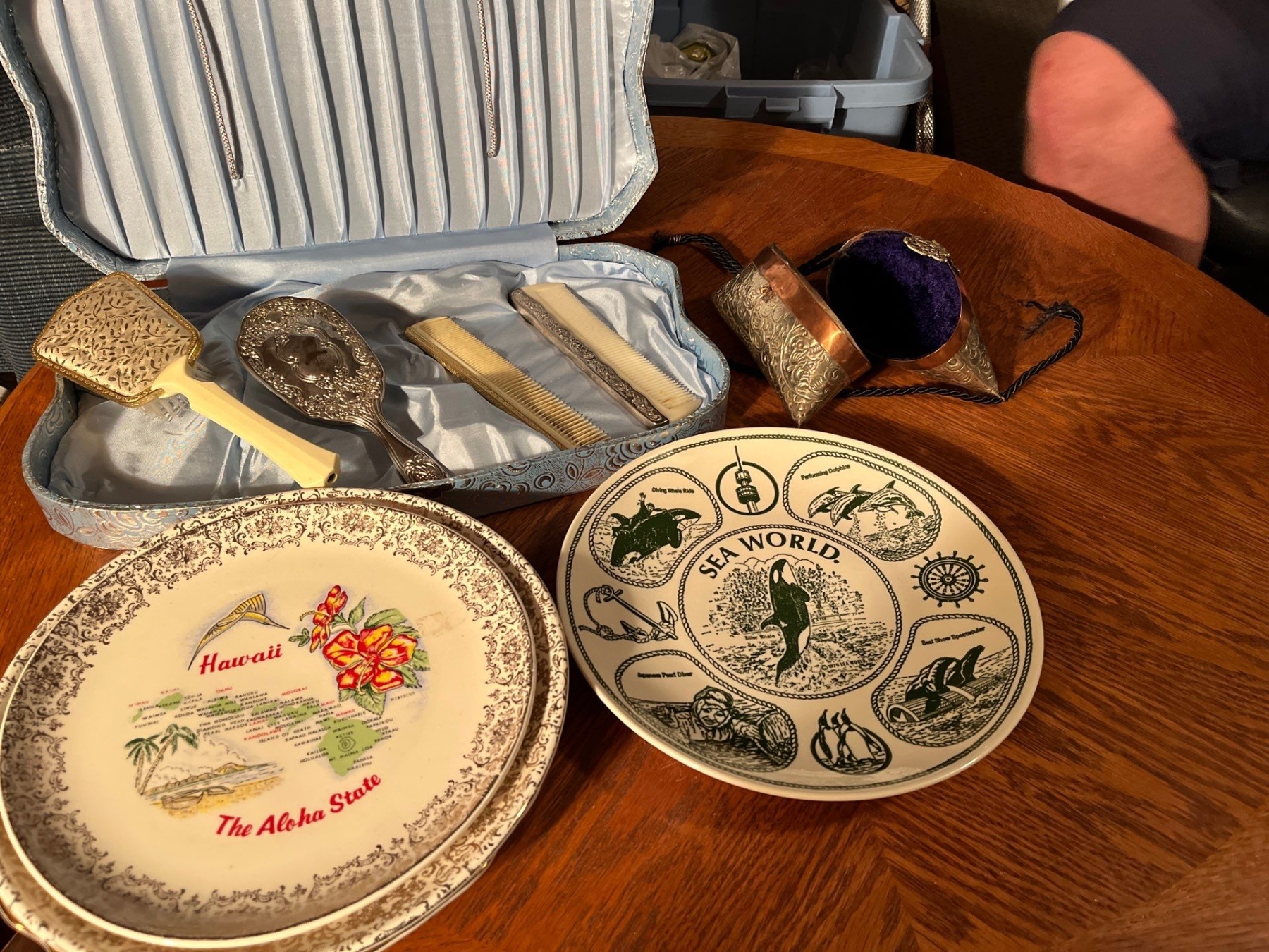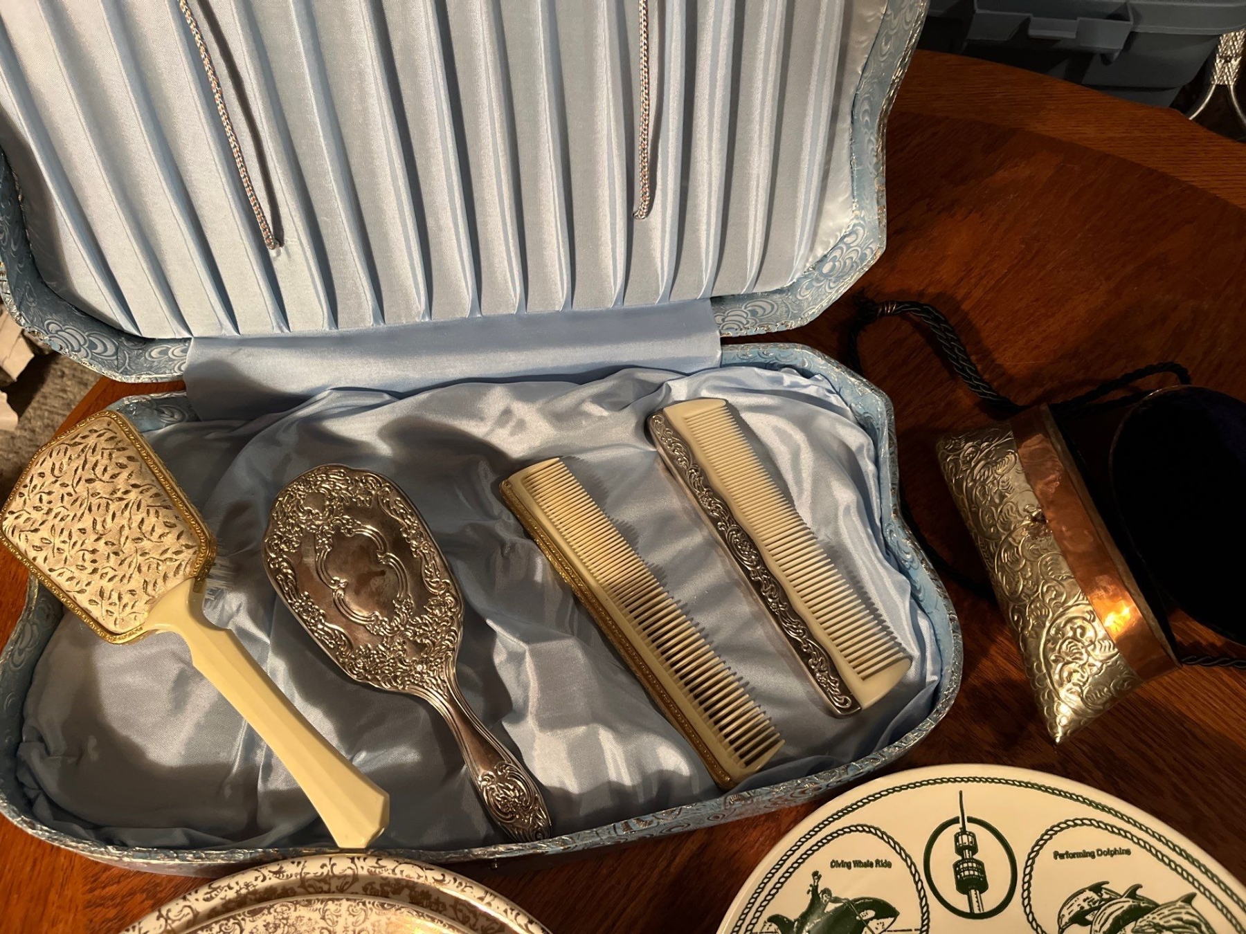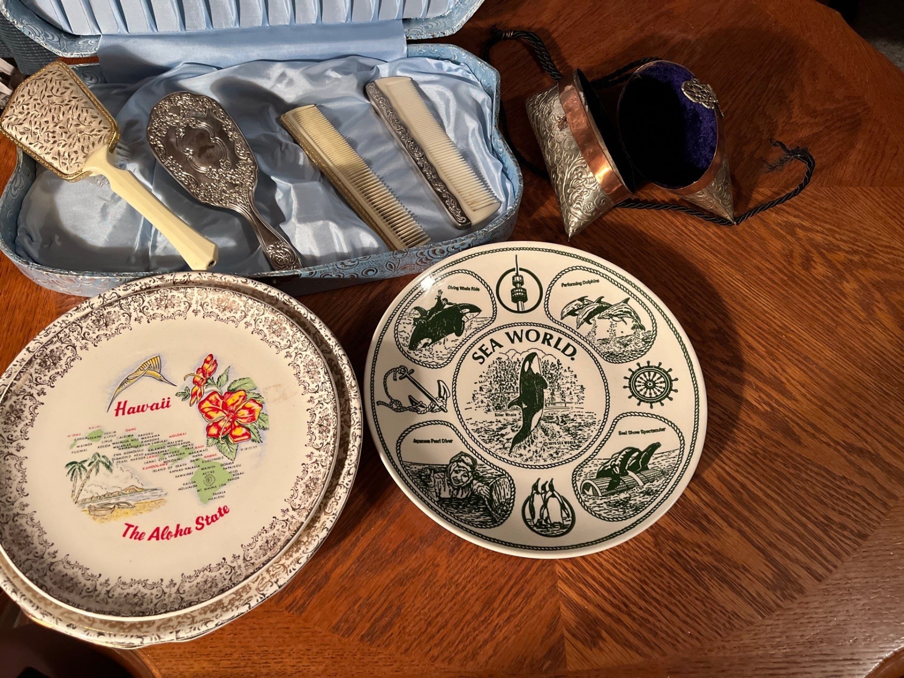 Antique silver plated brush set with plates from all over including SeaWorld and Hawaii and Oklahoma as well as Canada