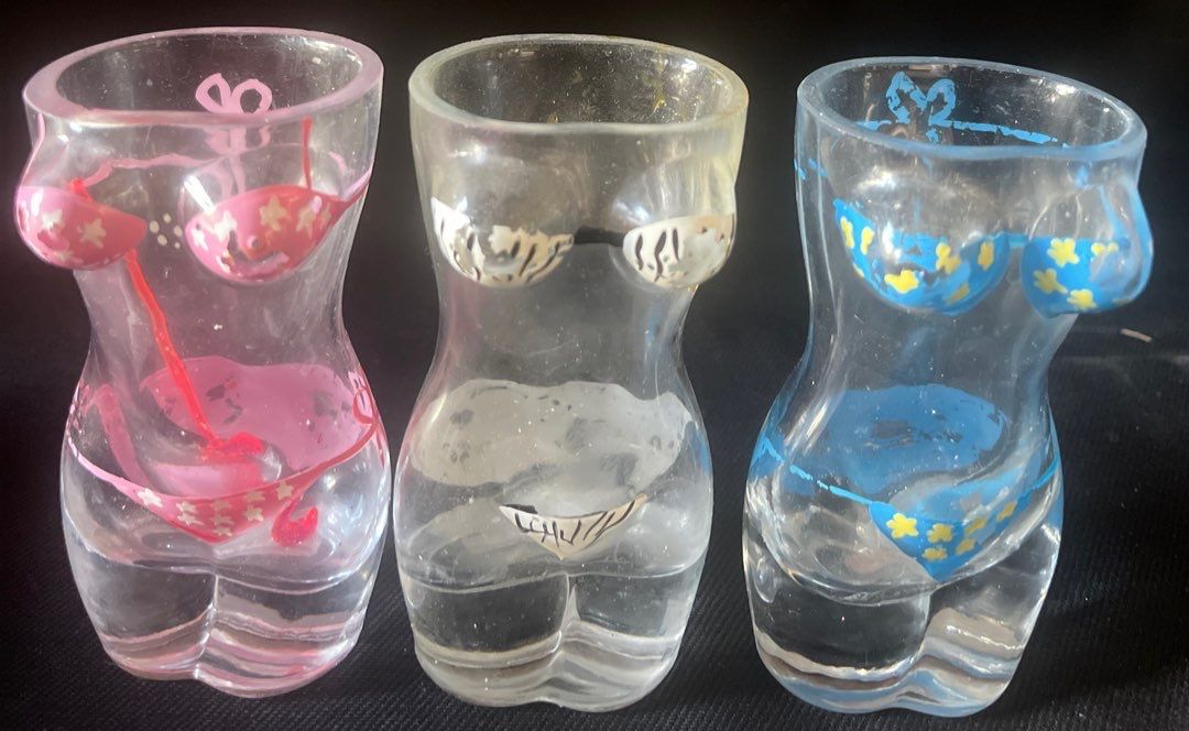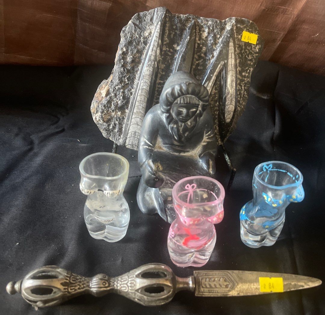 Antiqued Letter Opener Stone Art w/ Indigenous Figure & Bikini babe Shot Glasses