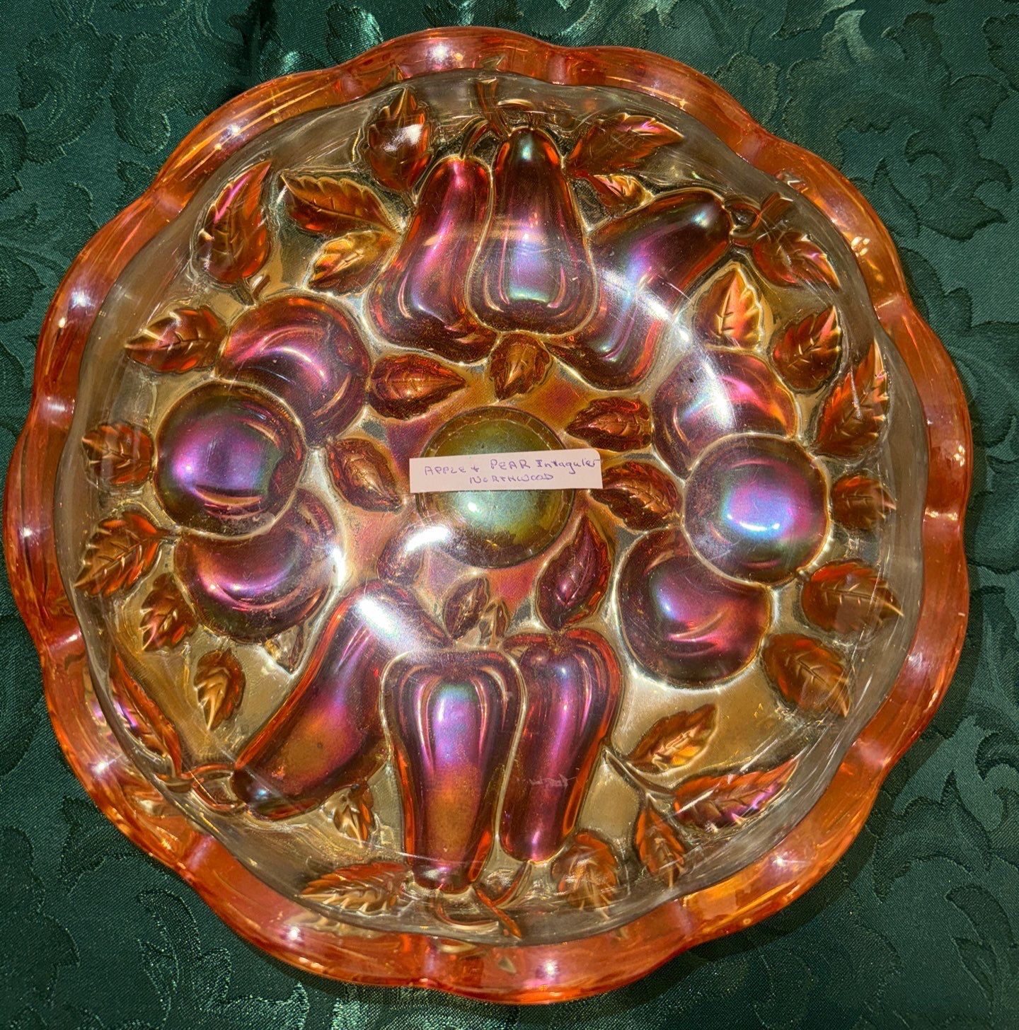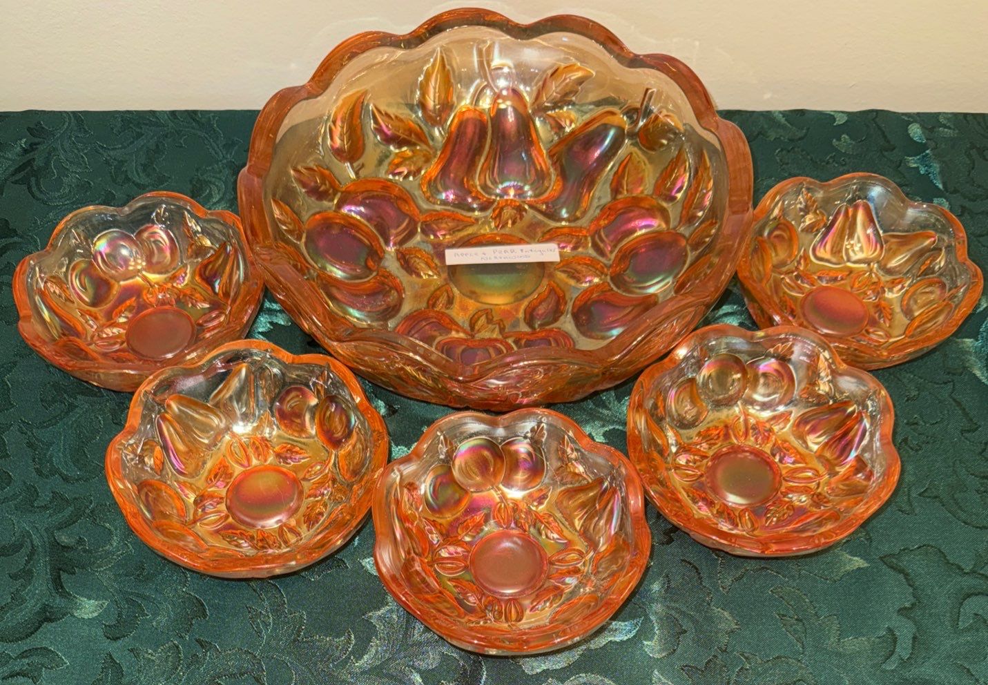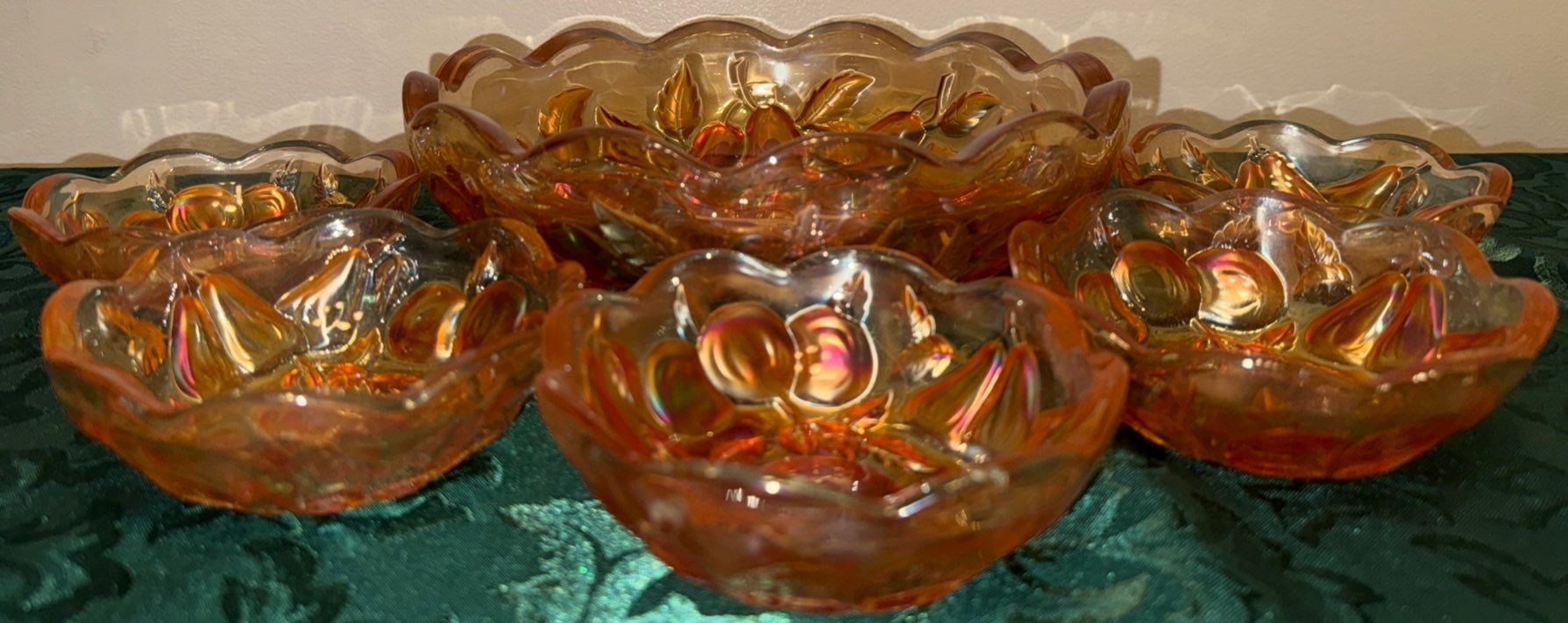 Apple & Pear Intaglio Master Bowl & 5 Berry Bowls Marigold Carnival Northwood Co.