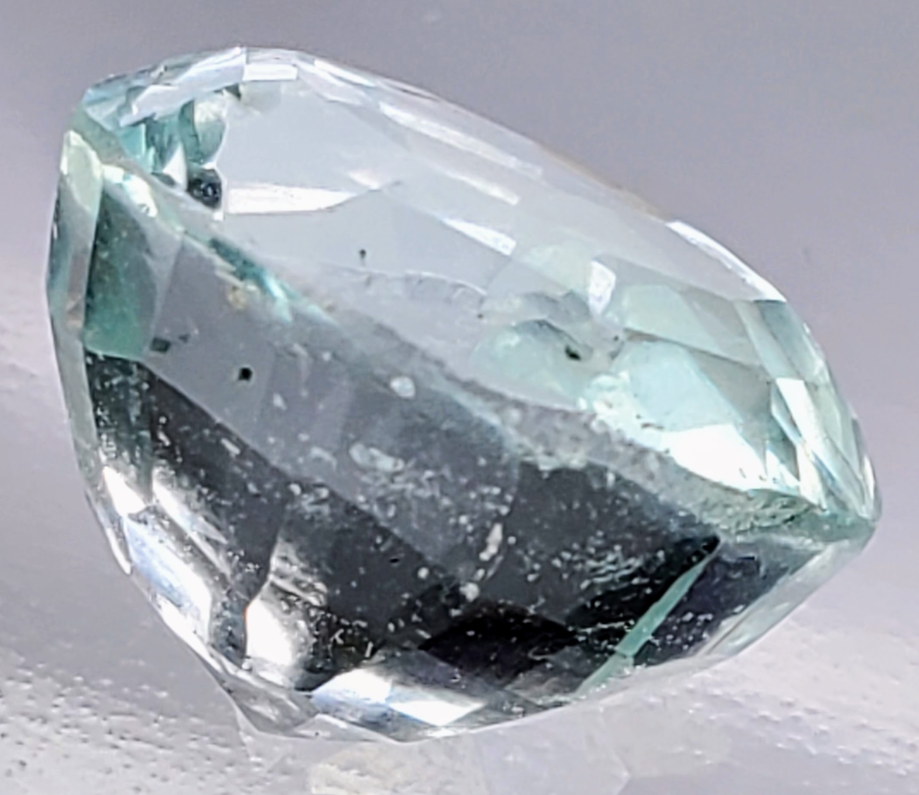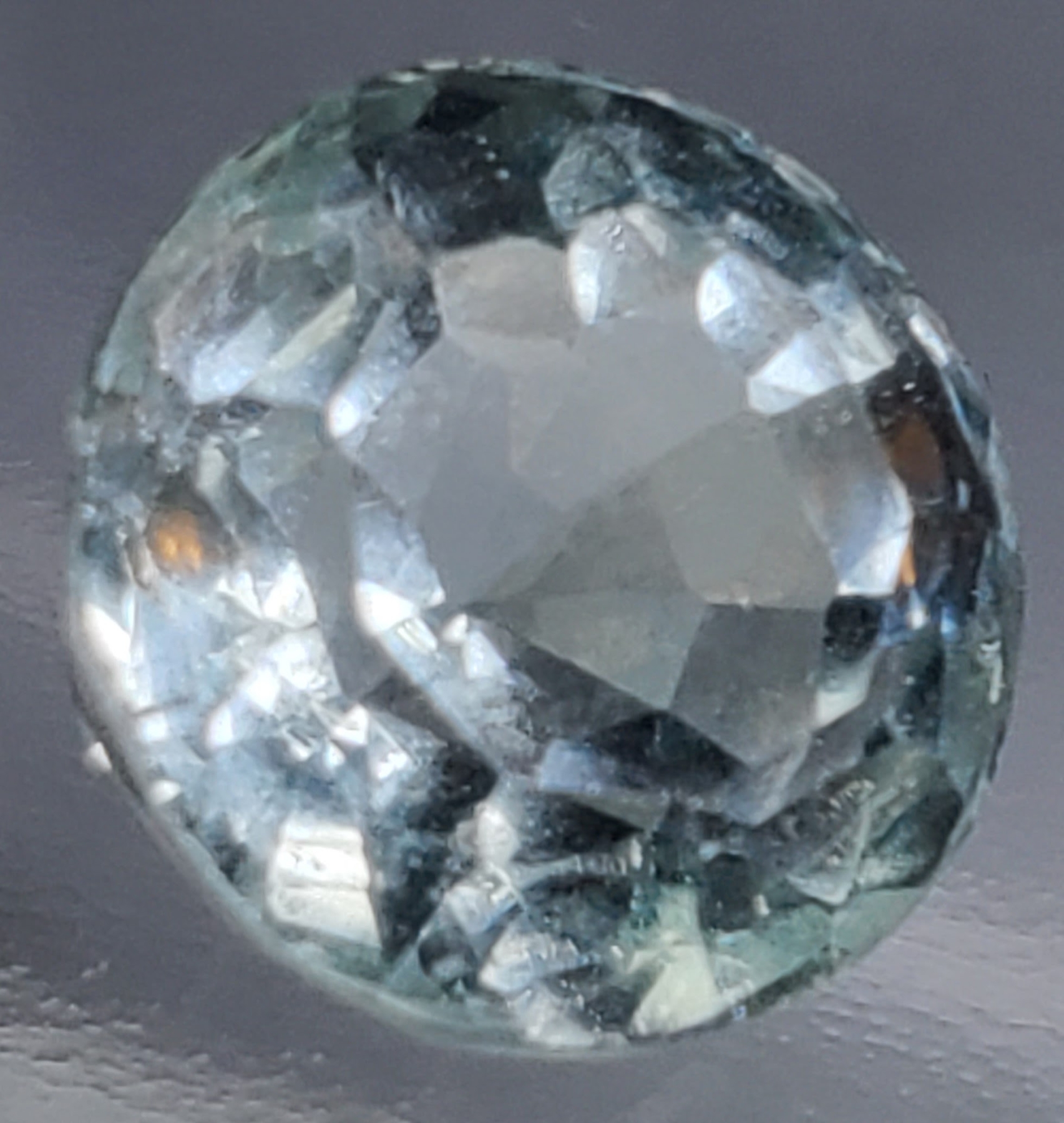 A 10-carat light-blue aquamarine with eye-clean clarity, transparent body, and round faceting. Untreated and bright, offering crisp brilliance. Estimated retail price is $900.