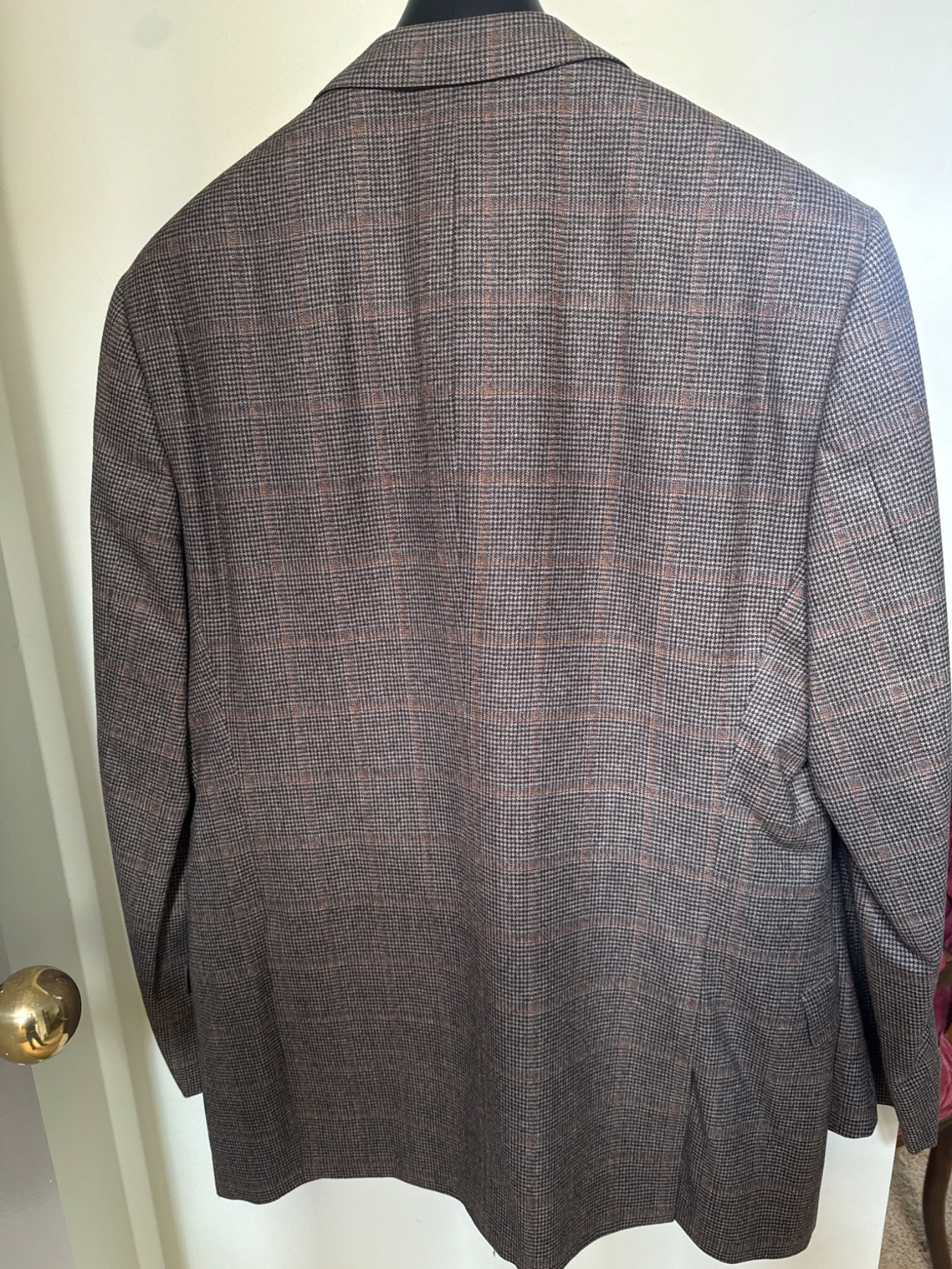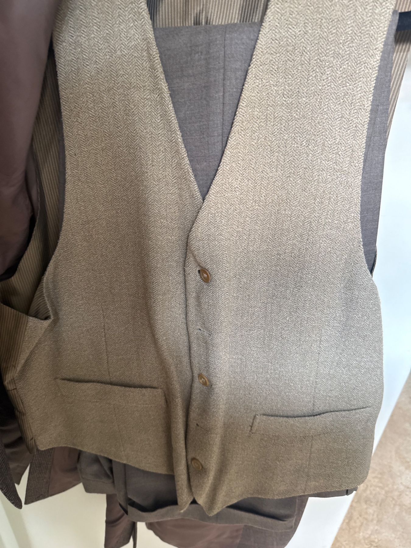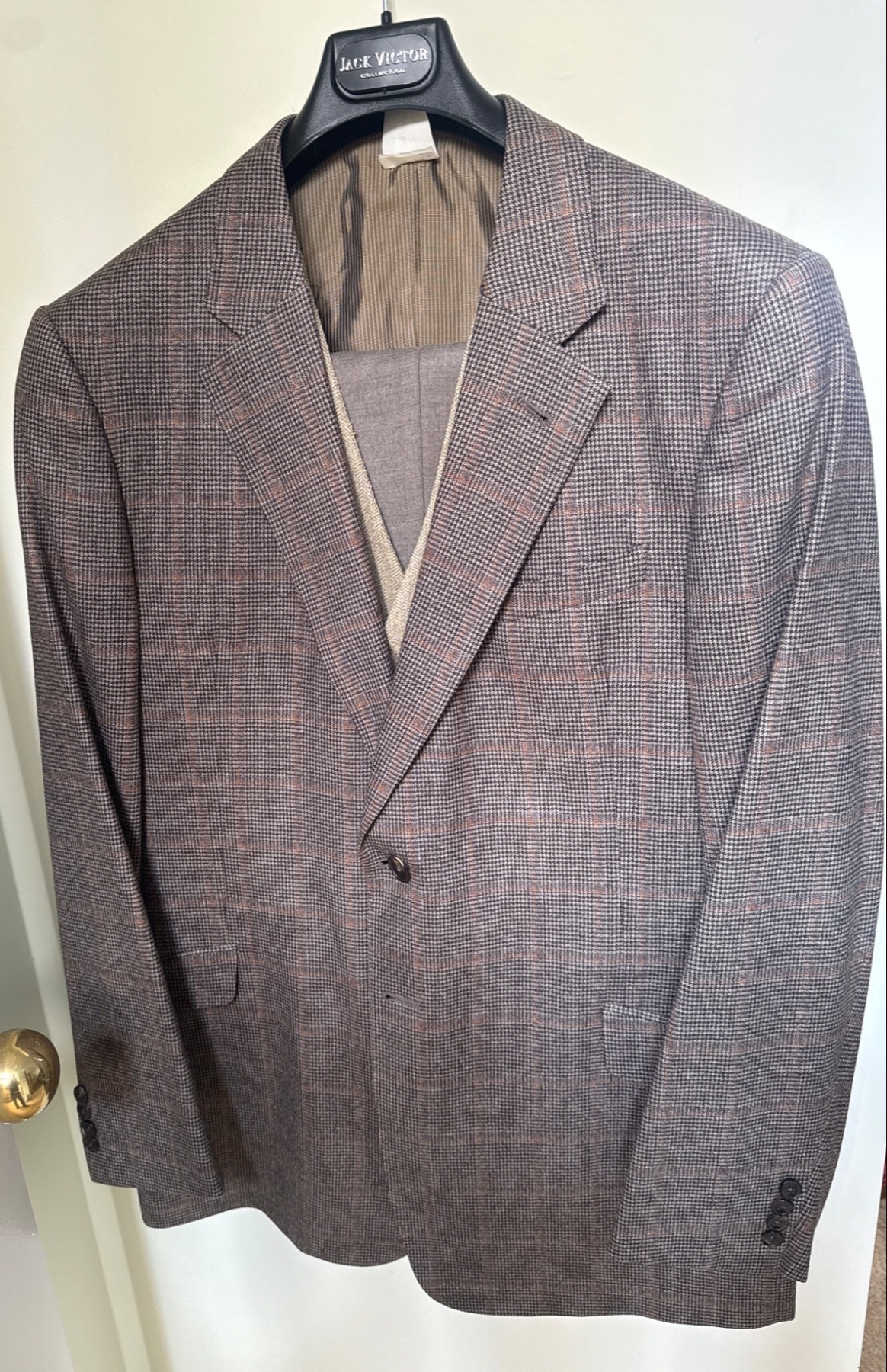 Armani Collezioni three-piece suit, marked 42 Tall and sourced from Henry Singer. The suit includes a plaid jacket, matching trousers, and a beige vest. The jacket features a classic two-button front, notched lapels, and a fully lined interior with 'Armani Collezioni' branding. Designed for a tall fit, this stylish ensemble is ideal for formal occasions. Dimensions not provided.