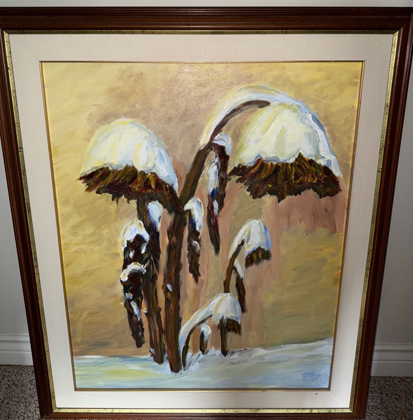 Art - Oil On Board Painting - Depiction Of Snowed On Sunflower Plants 32x38