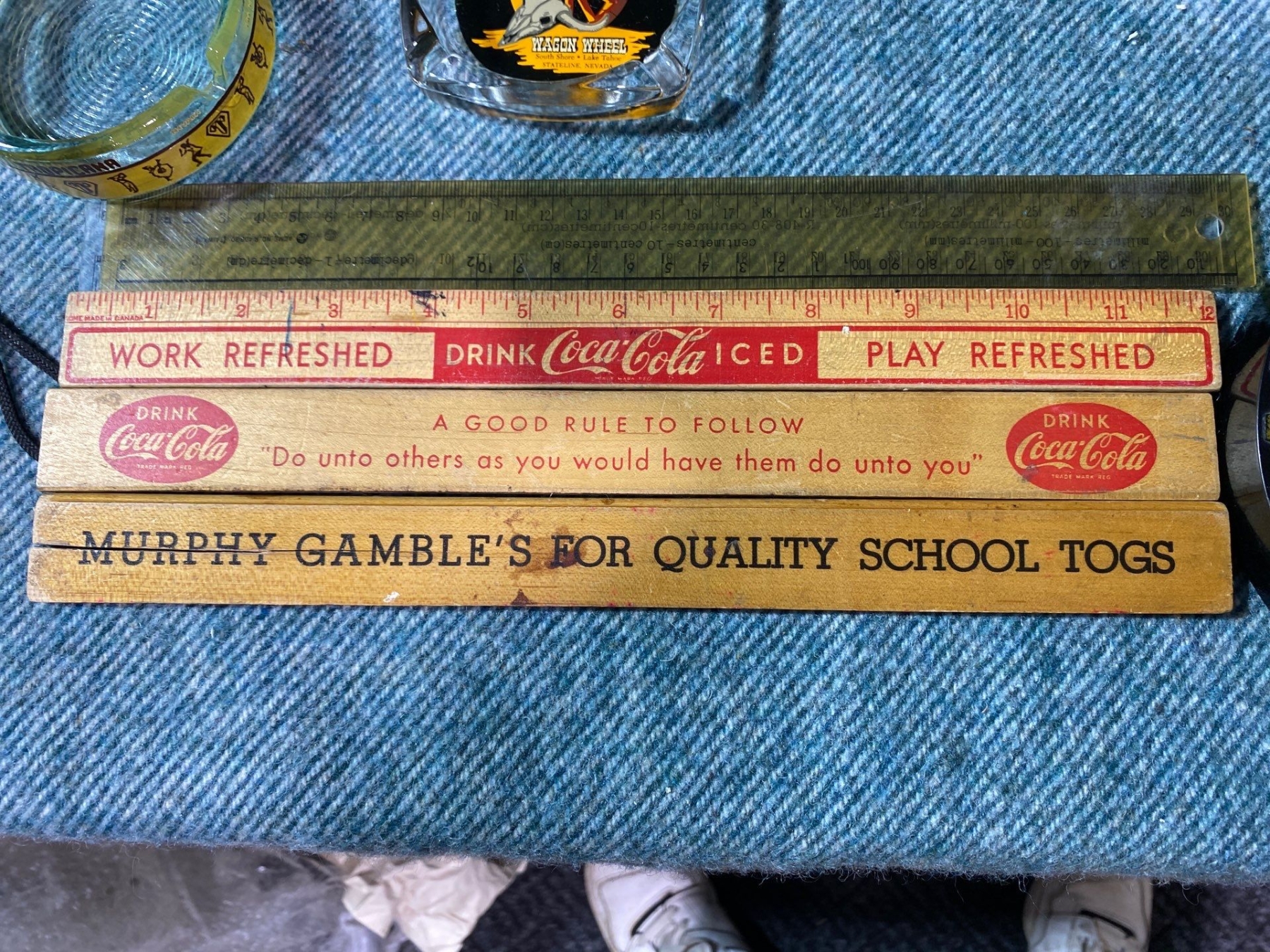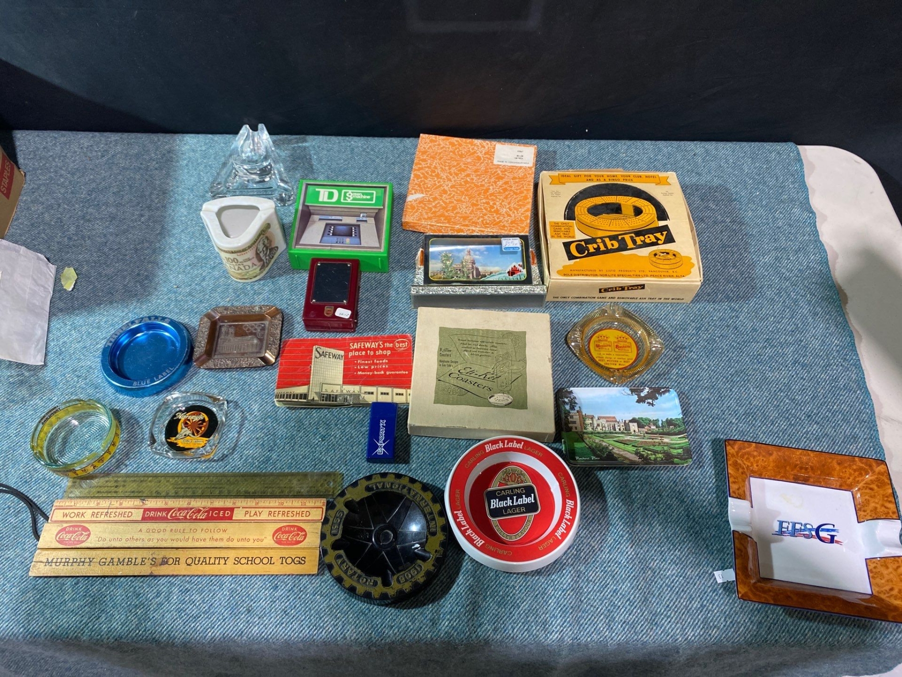 Ashtray Your Way! Crib Tray, Coke Rulers, TD Bank Piggy Bank, Black Label Lager
