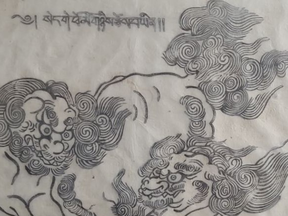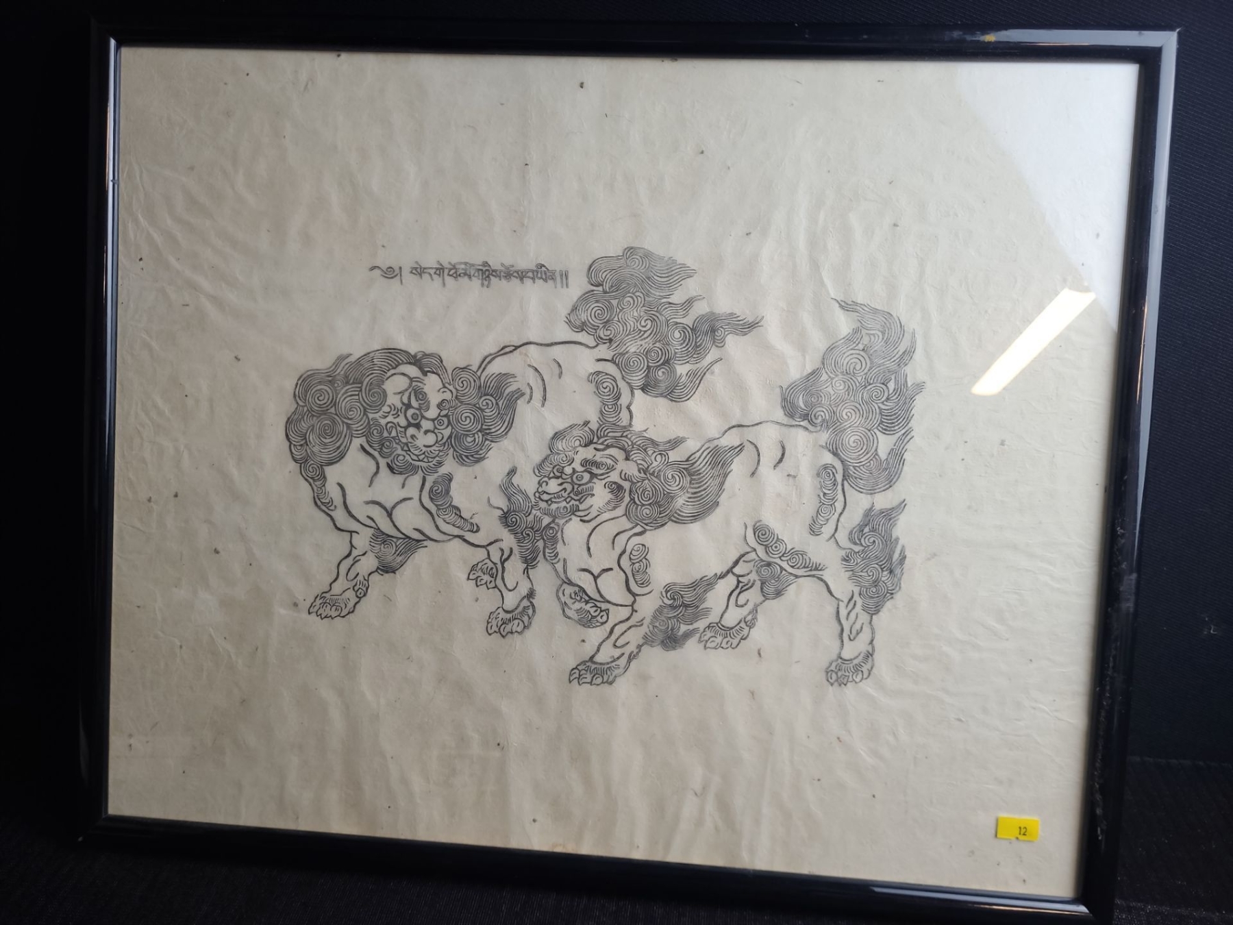 Asian Art Drawing of Fu (Foo) Dogs, Unsigned, Framed Under Glass,19 X 23.5