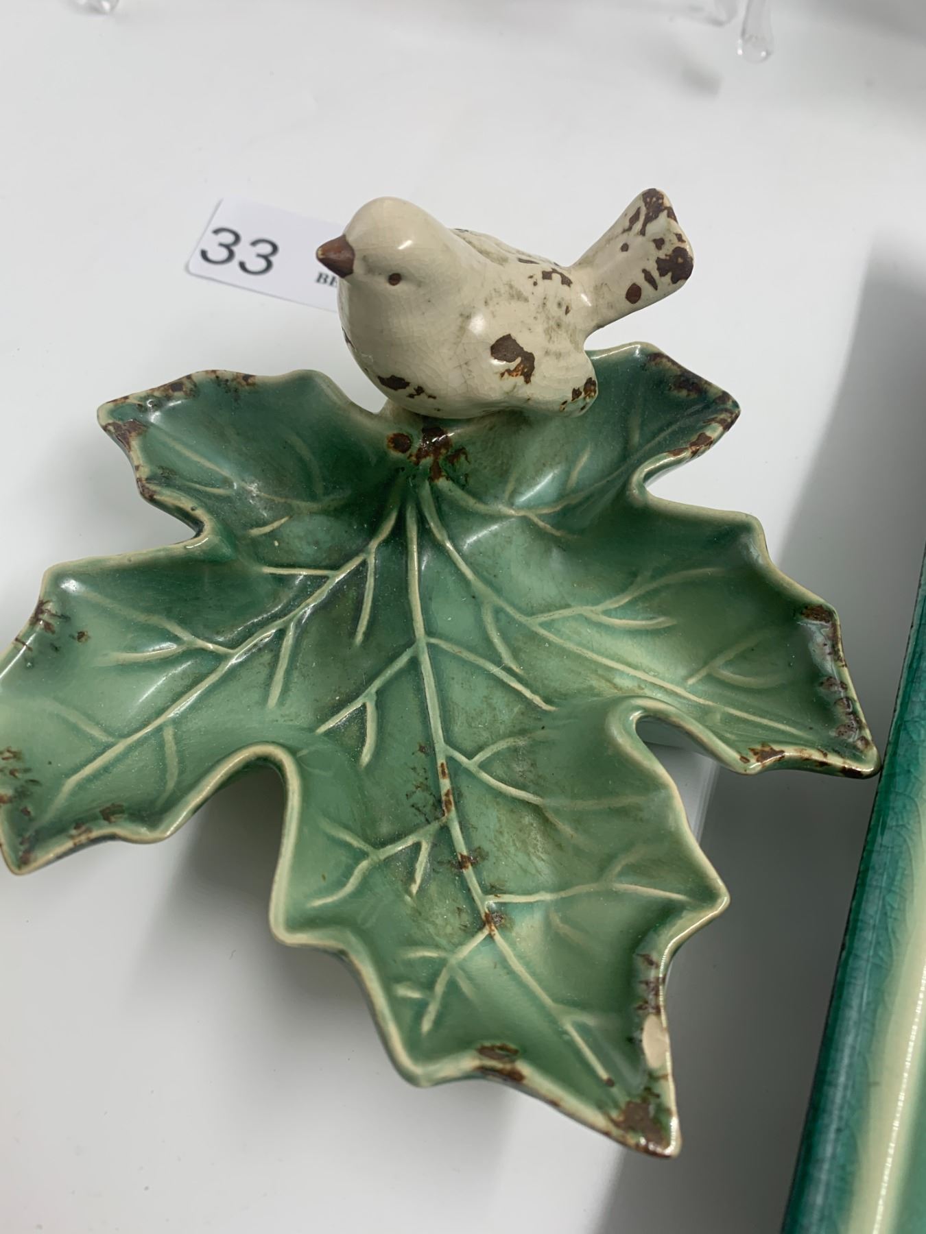Including ceramic rooster pitcher, bird on leaf dish, glass horse, and 2 x wooden birds