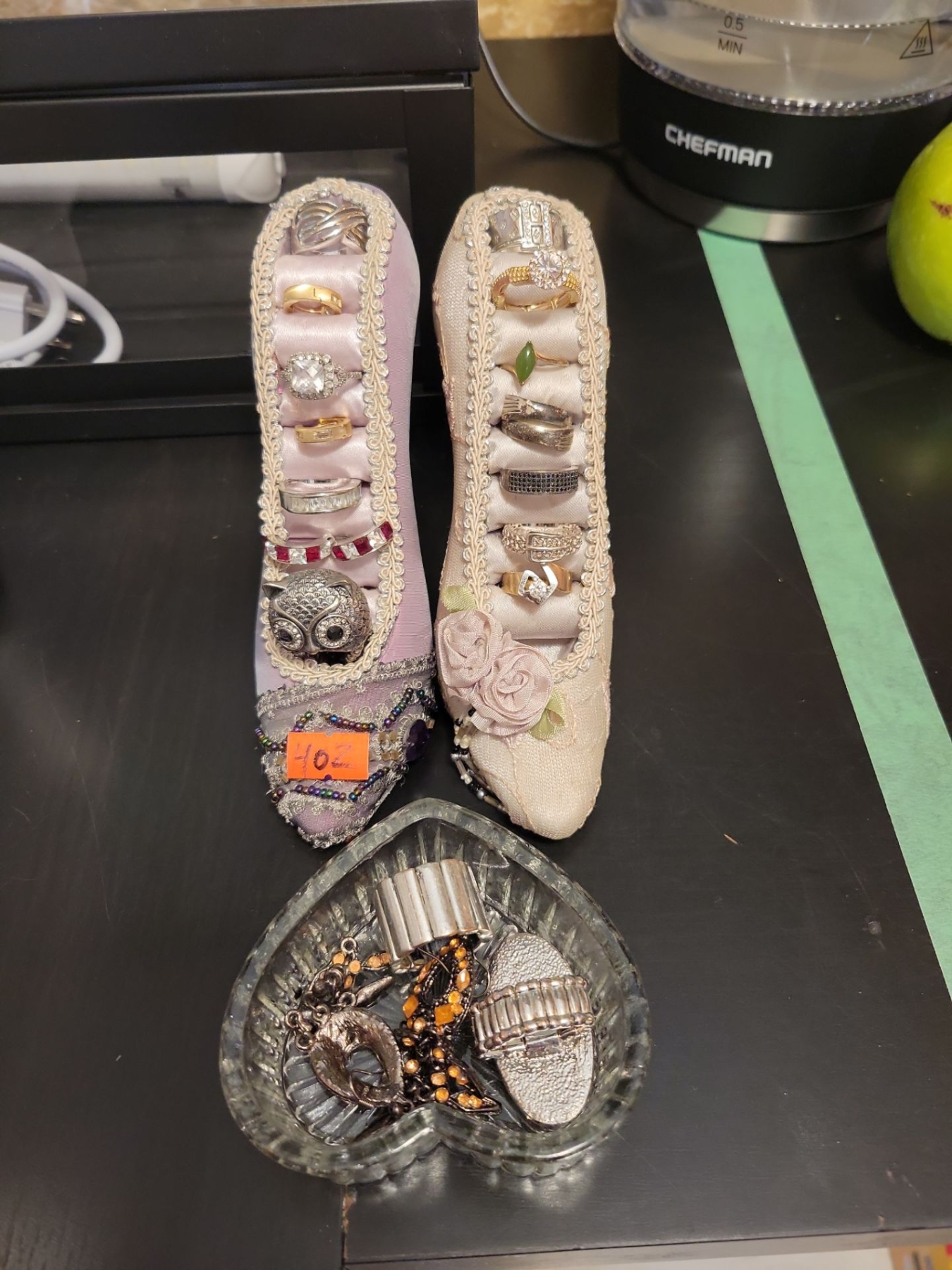Assorted Costume Jewelry in High Heel Ring Holders.