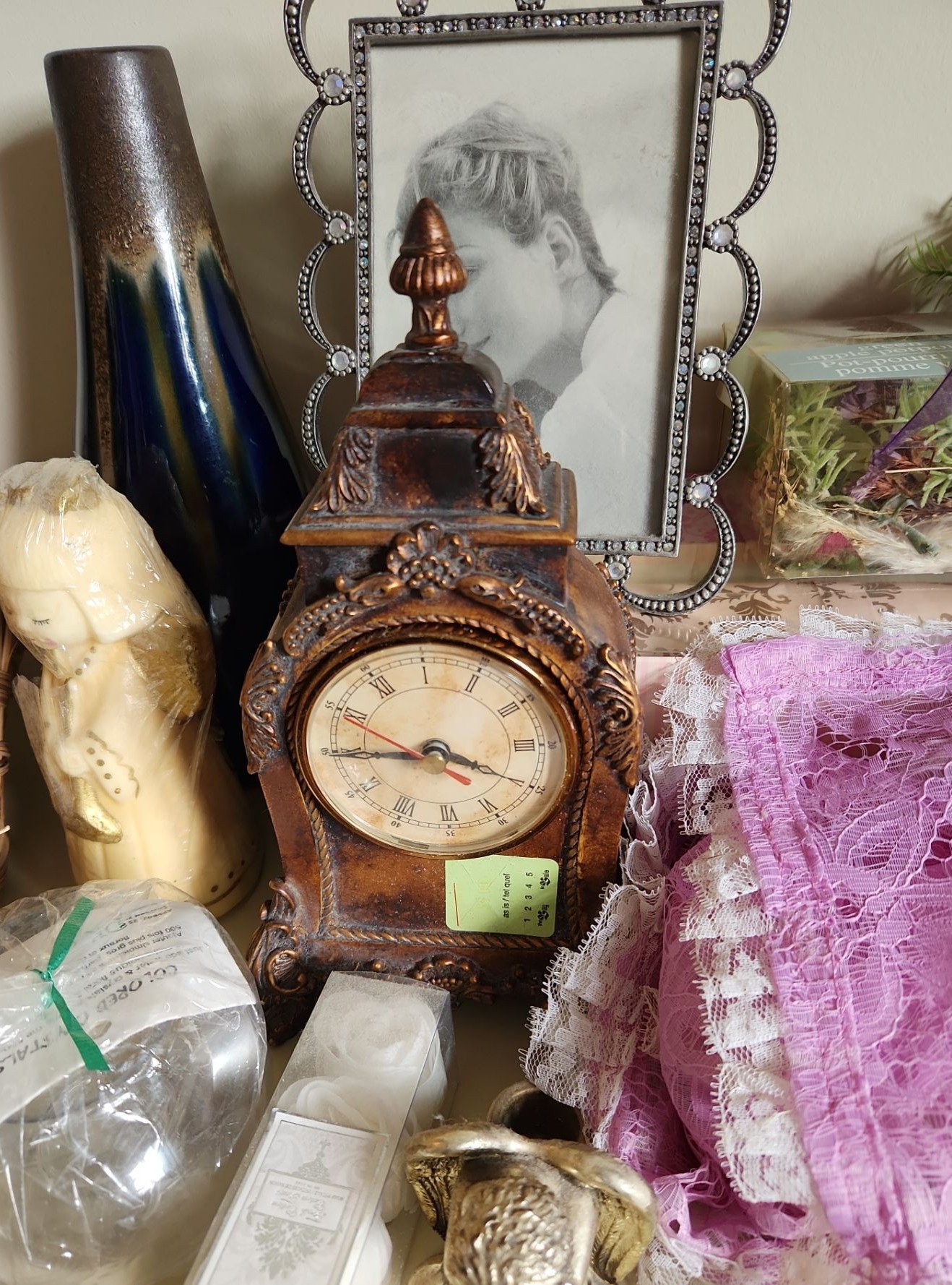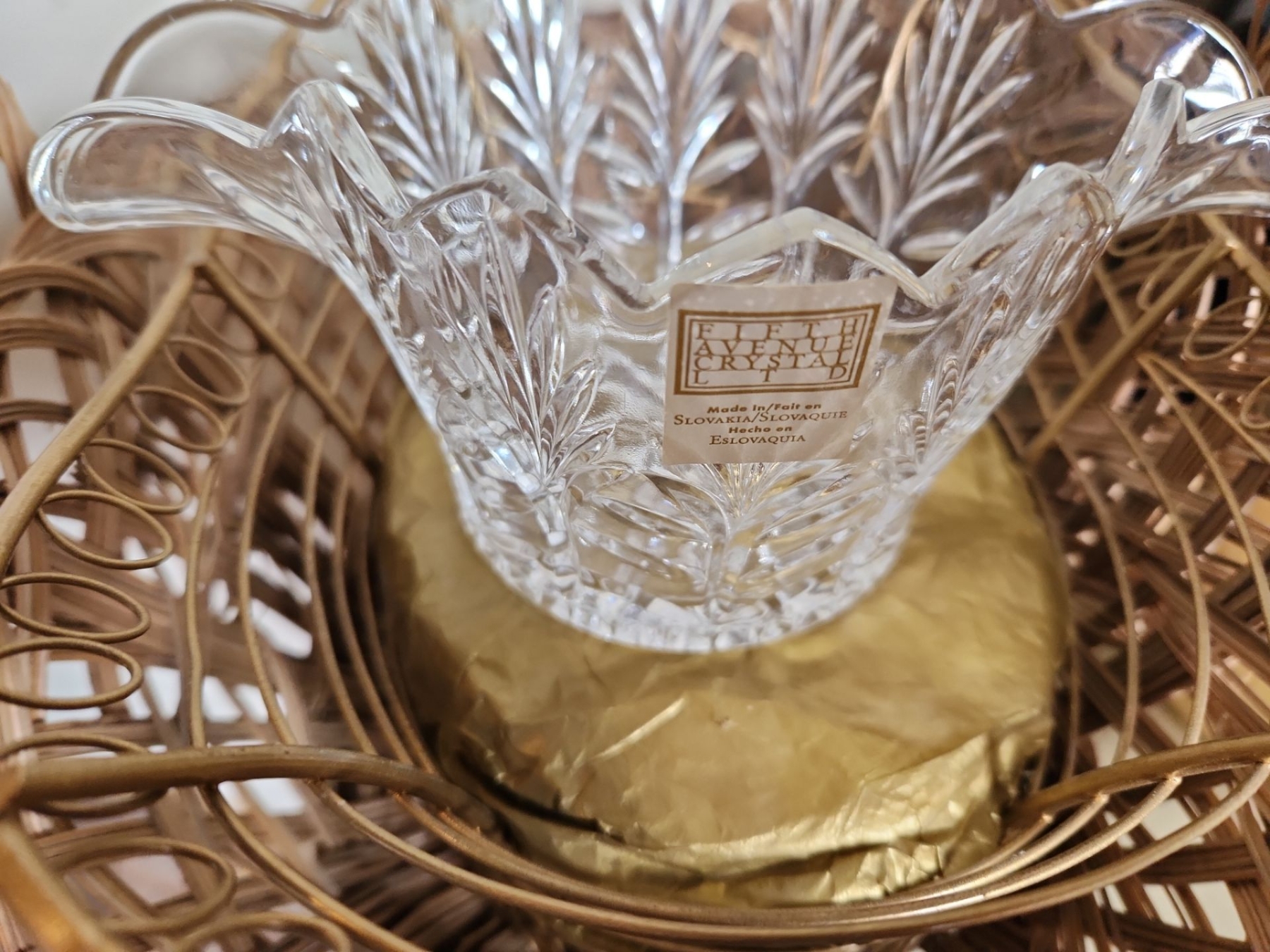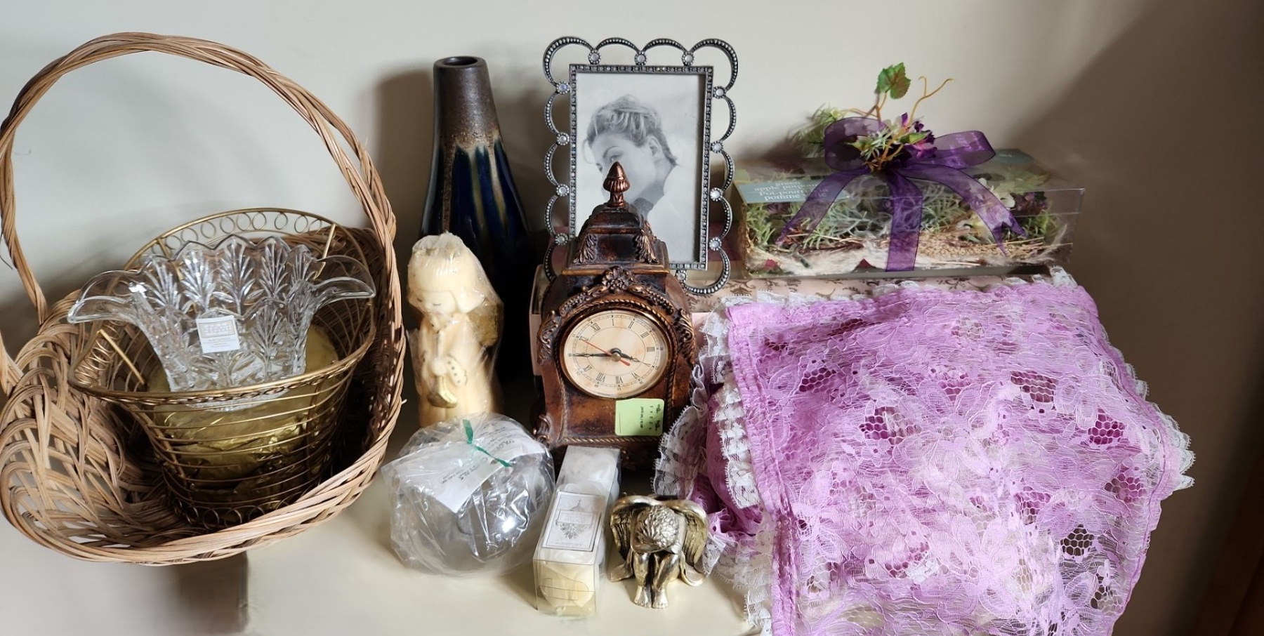 Assorted Decor: Crystal Sauce Boat, Vase 12 T, Frame 4 X 6, Clock 10 T, Drawer Liners and More!