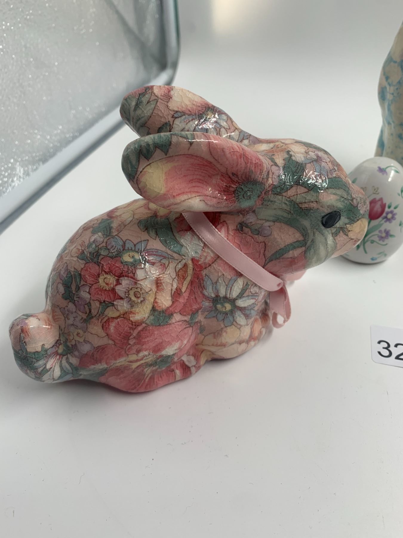 Includes ceramic cat, ceramic easter egg, wooden bunny, and plastic easter bunny scene
