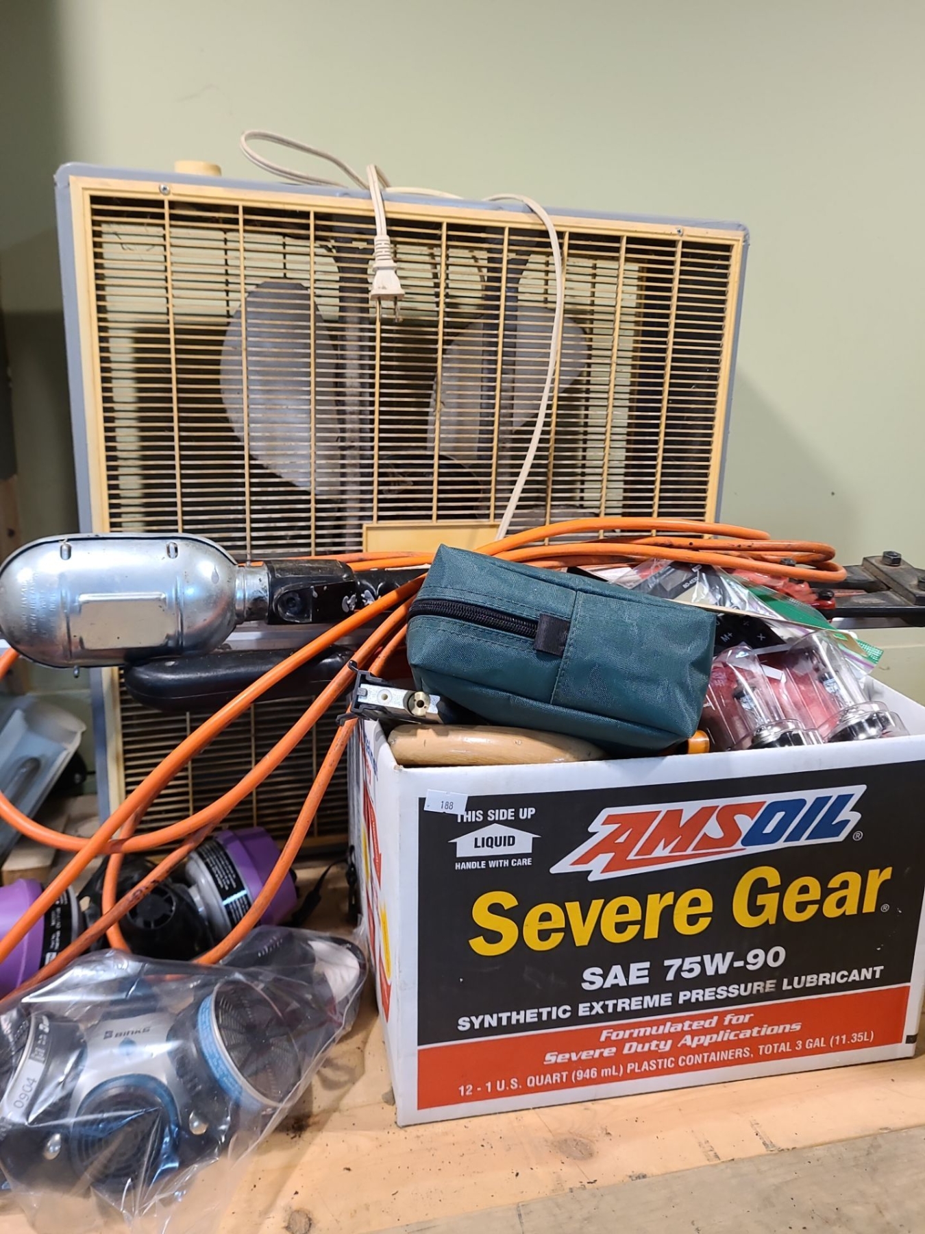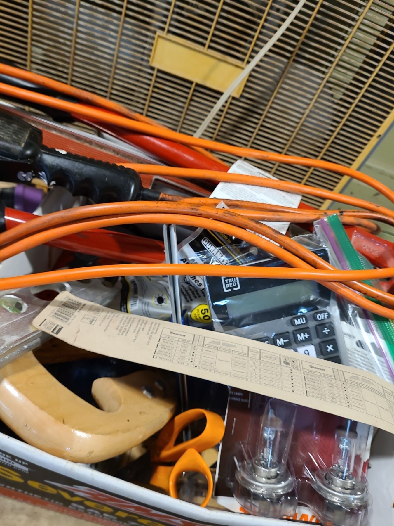 Assorted Garage Items (Box Fan, Clip Light, Box of Miscellaneous Items)
