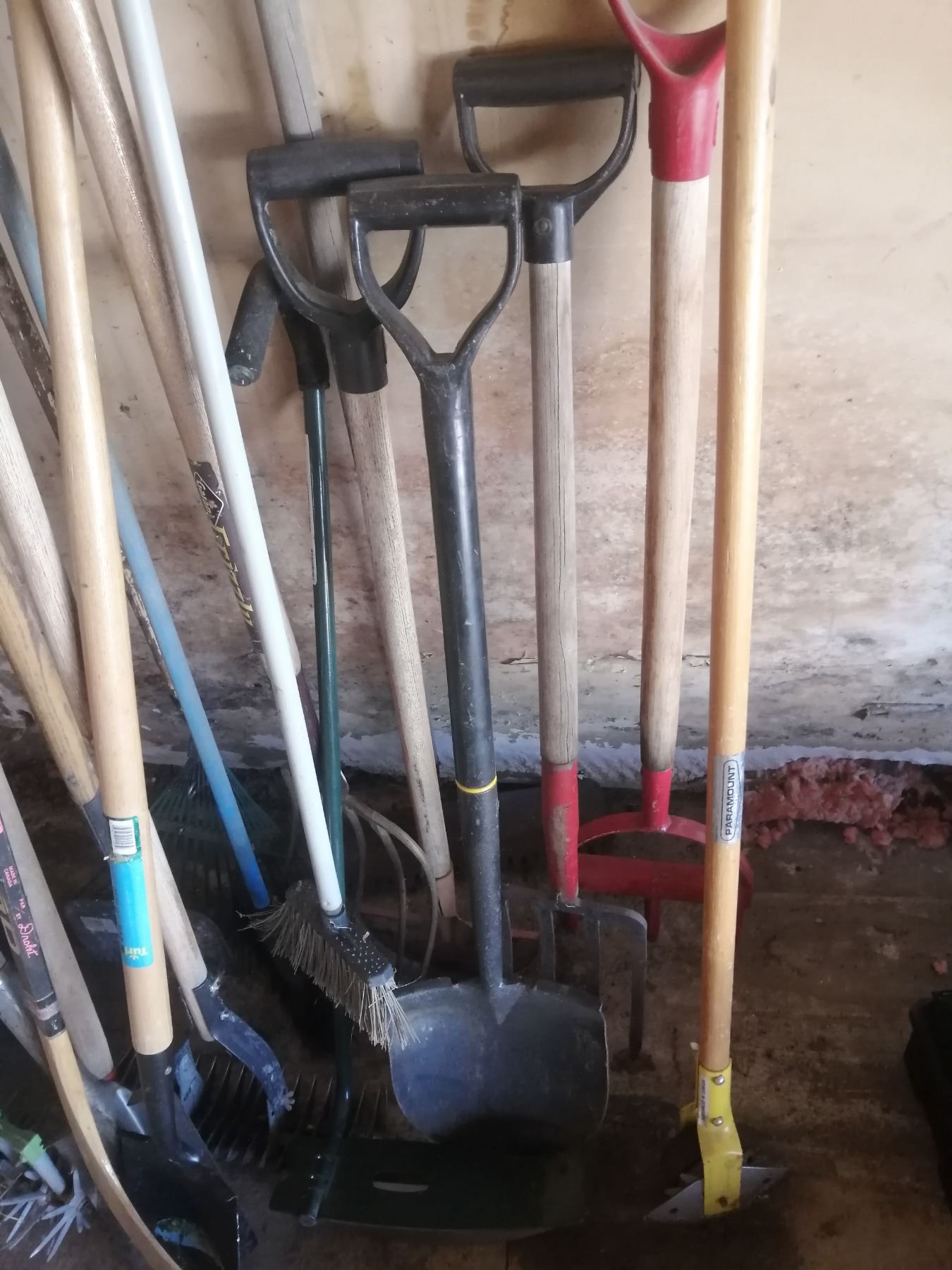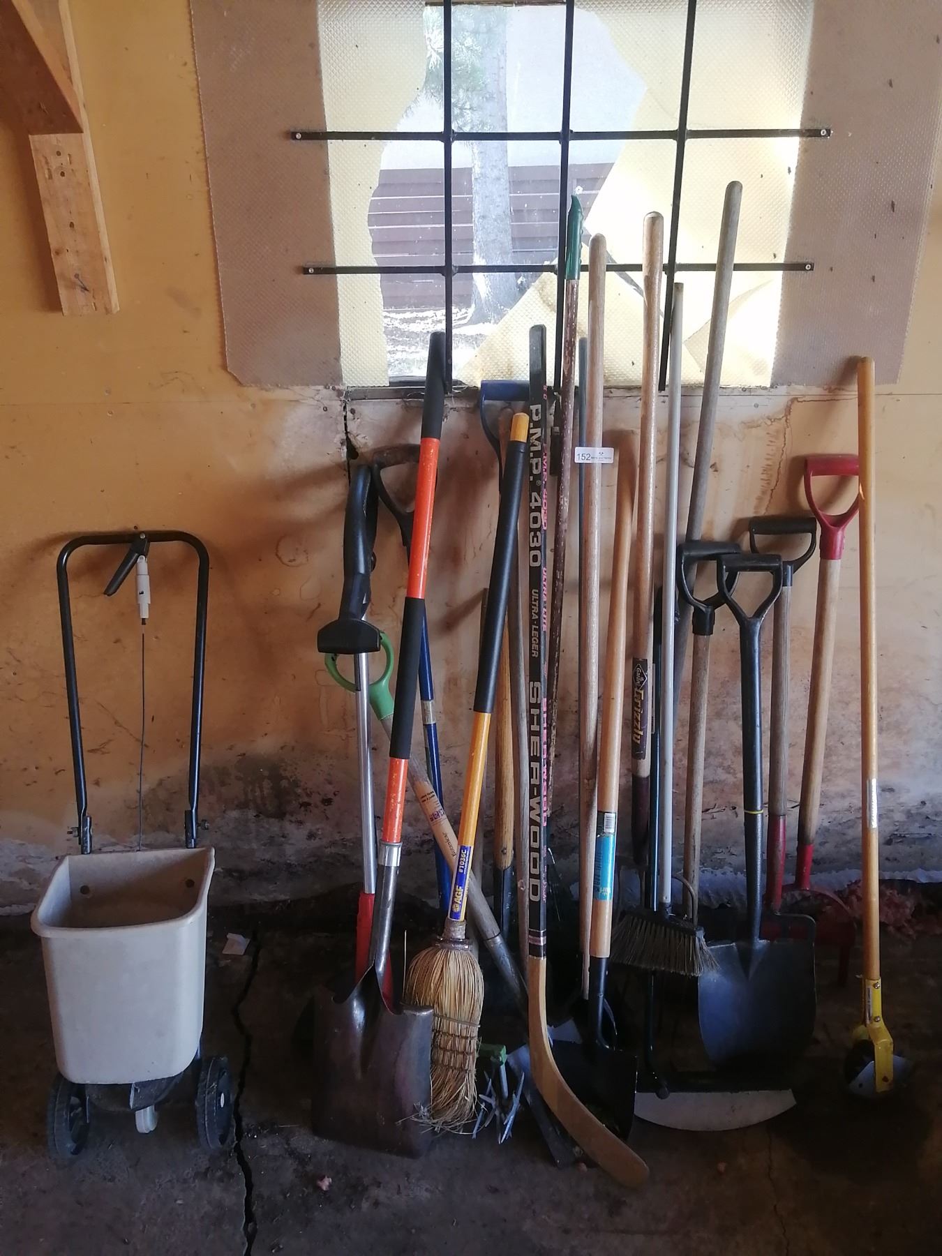Including shovels, rakes, broadcast spreader, Black and Decker edger (Model ST770), and more!
