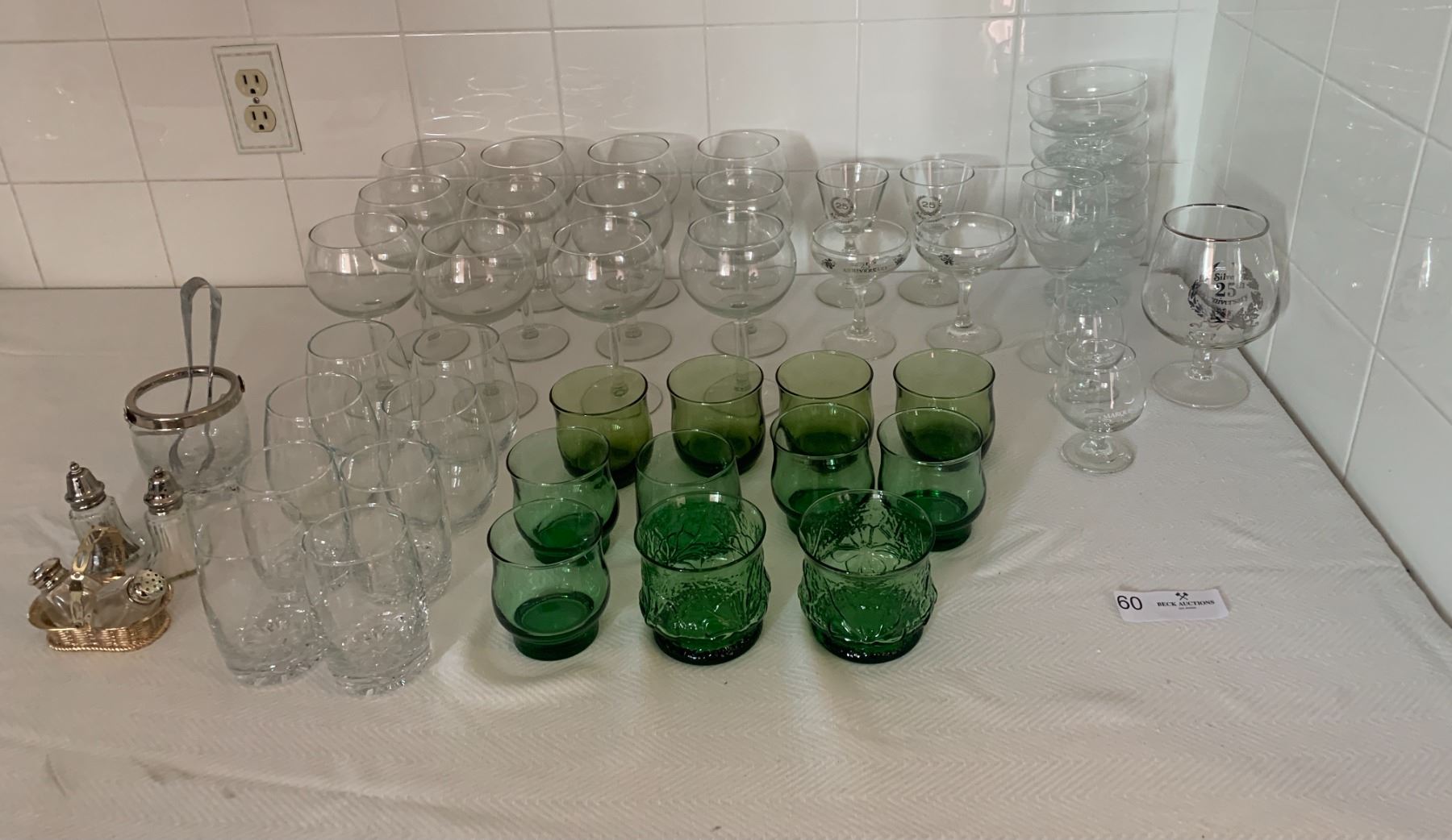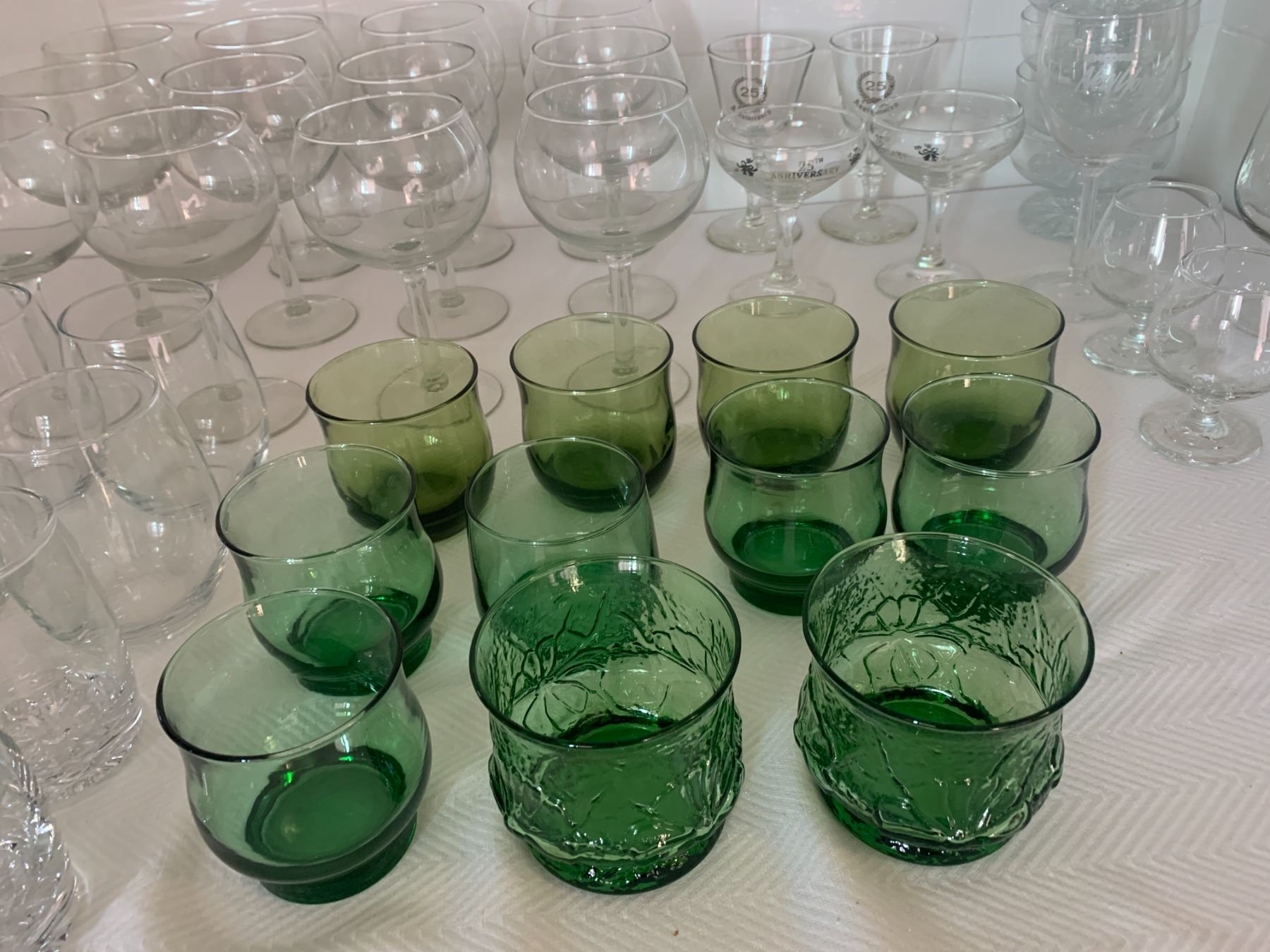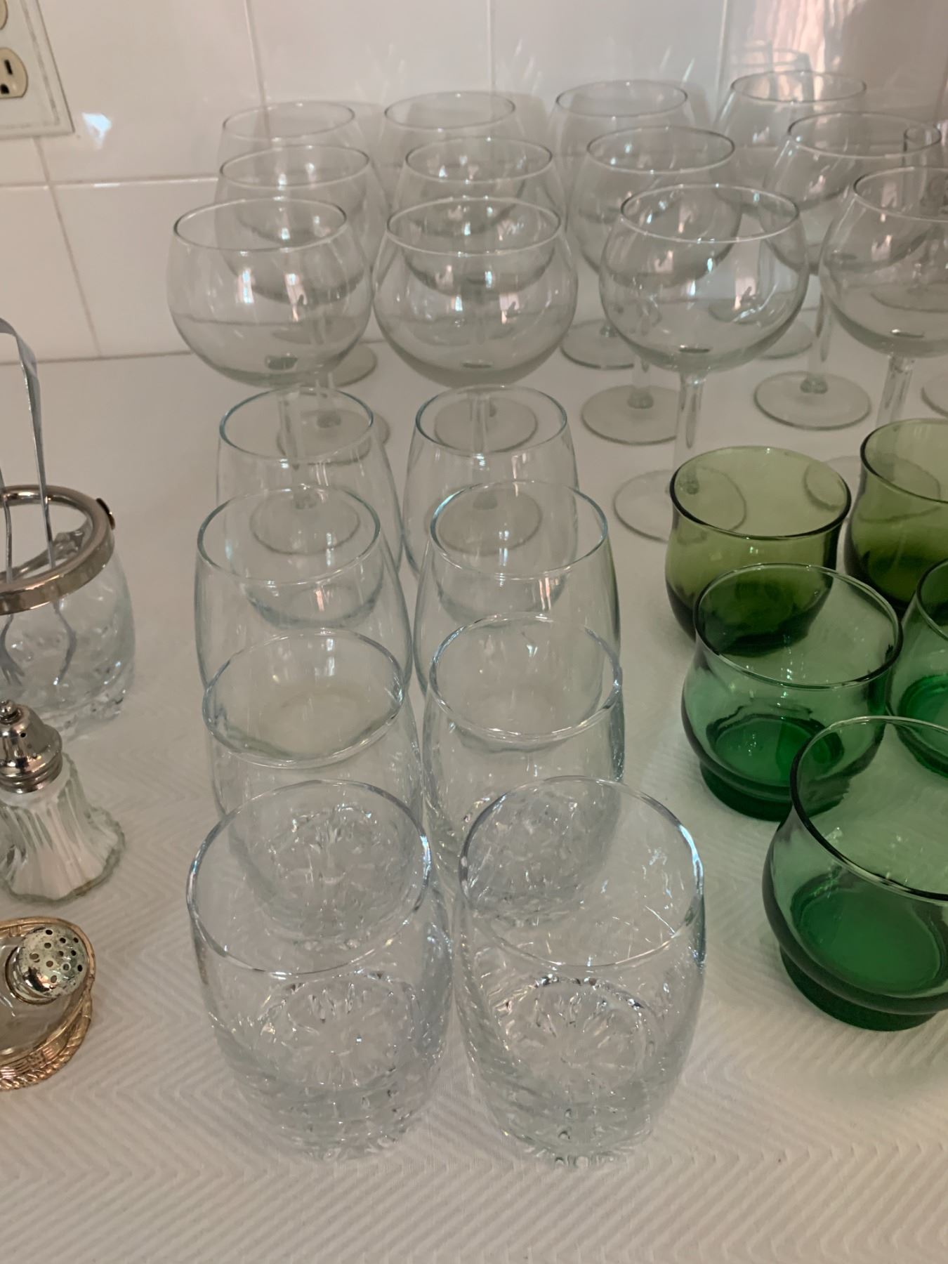 Including stemmed and stemless wine glasses, champagne saucers, brandy snifters, green-colored glasses, and 5 stemmed dessert bowls