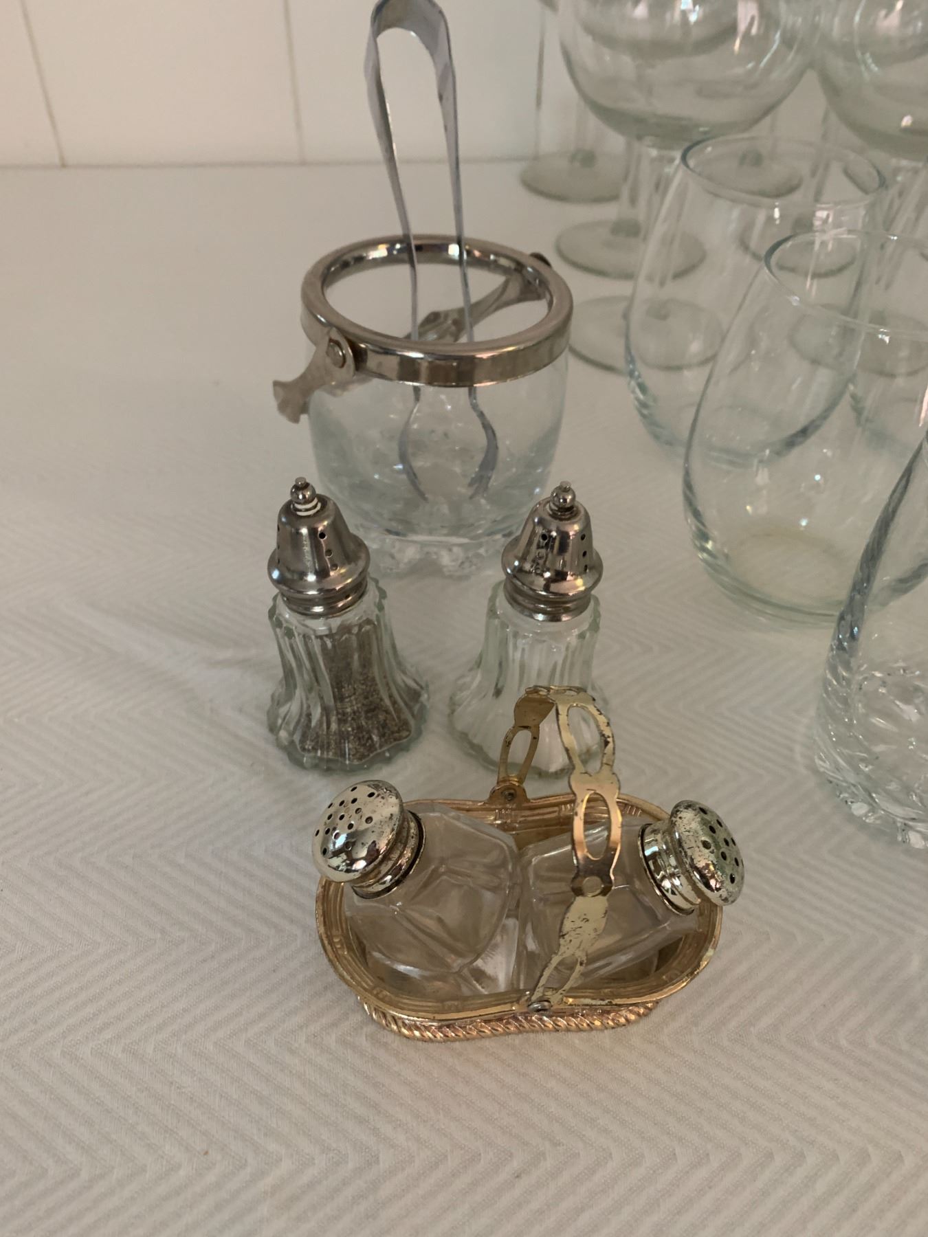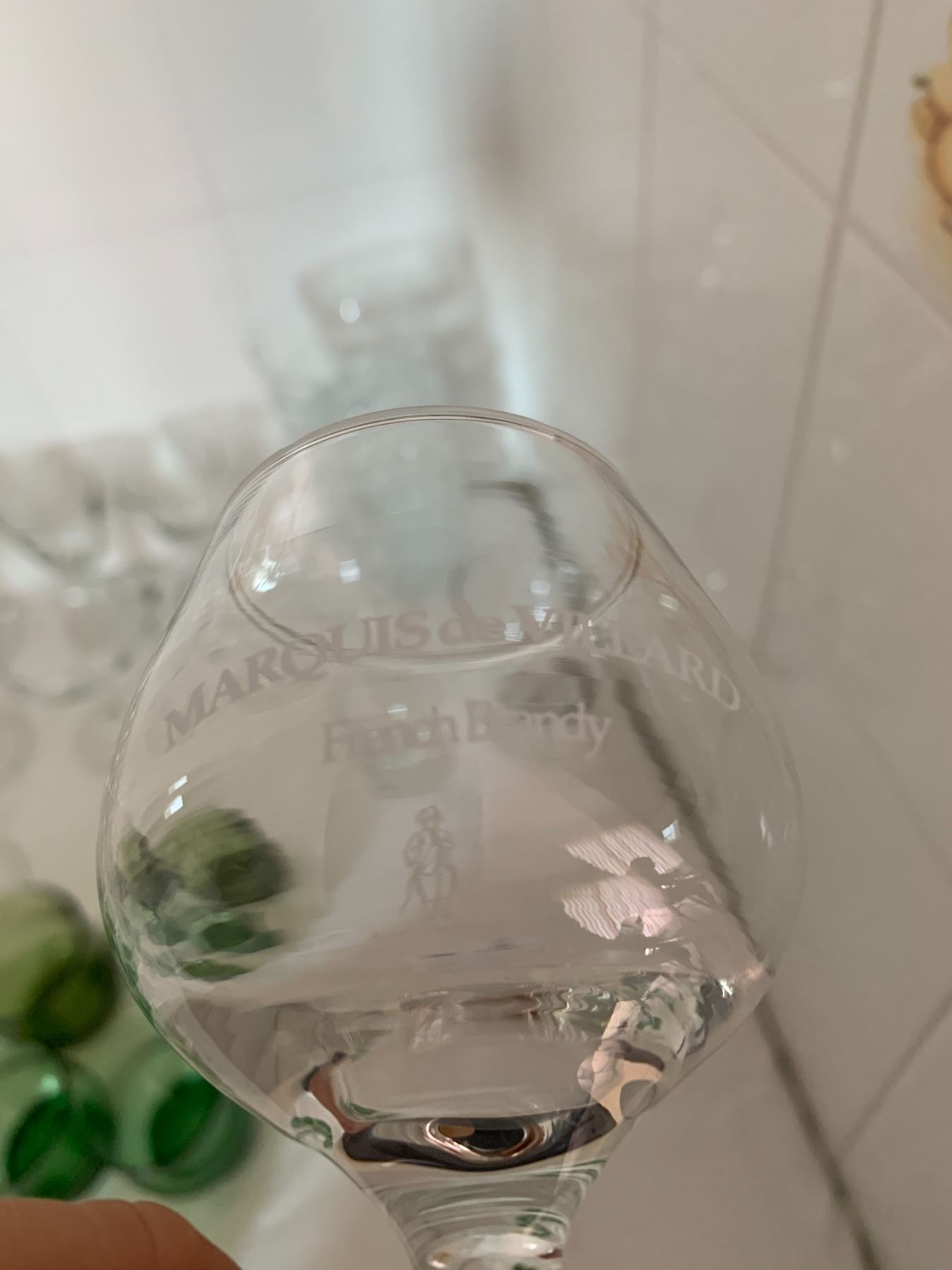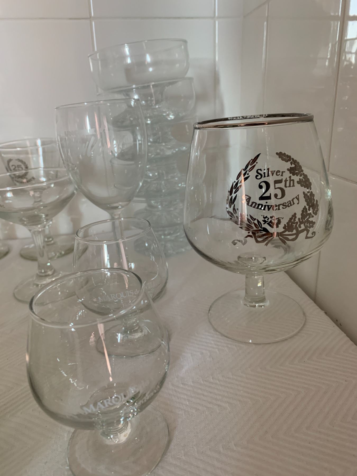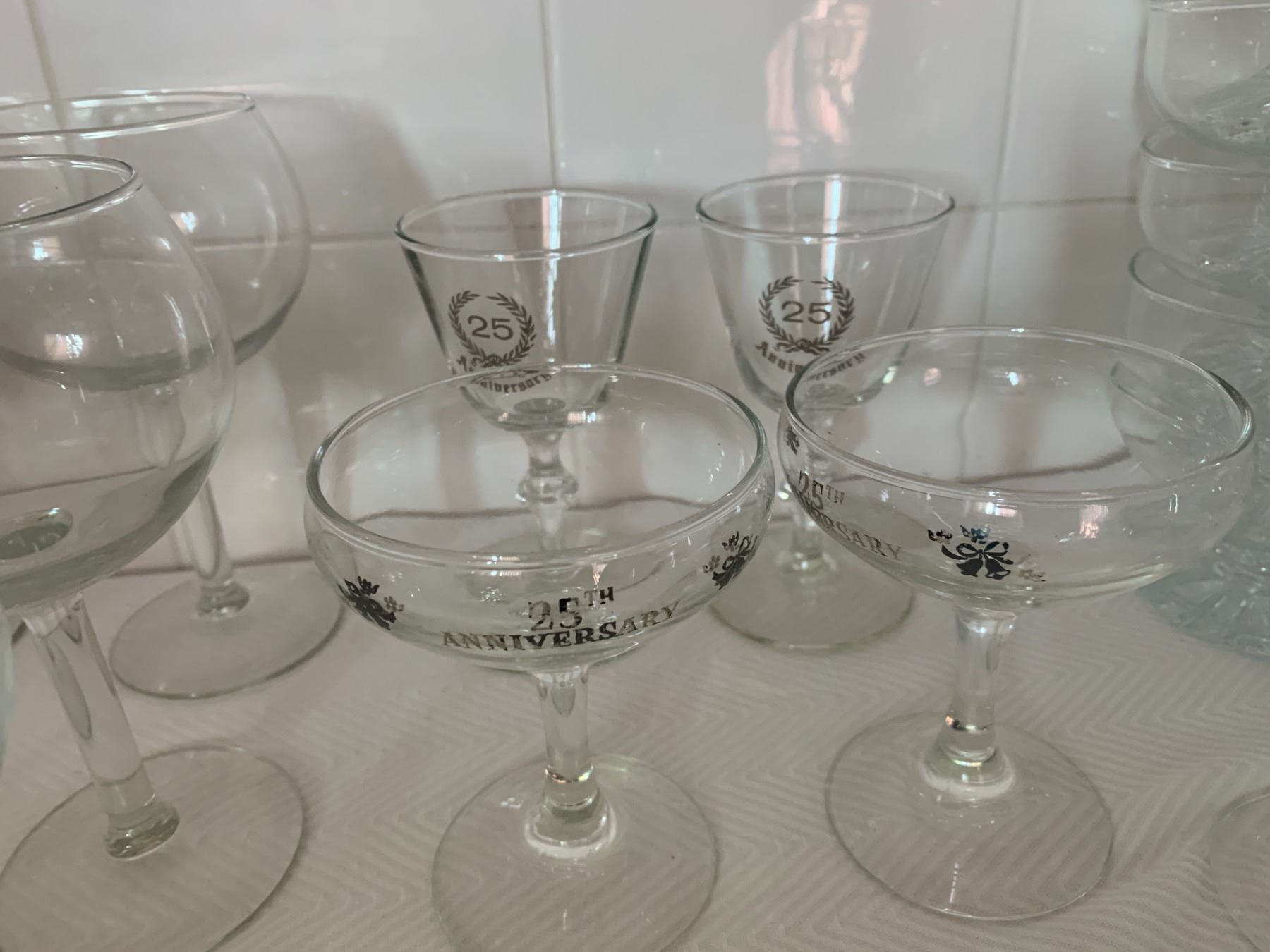 Including stemmed and stemless wine glasses, champagne saucers, brandy snifters, green-colored glasses, and 5 stemmed dessert bowls