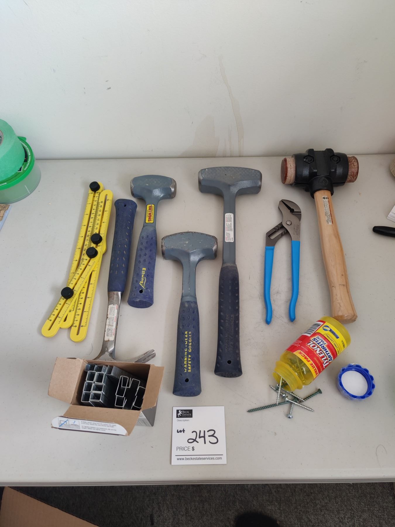 Assorted Hammers & Mallets, Measuring Tools, Pliers, and Hardware