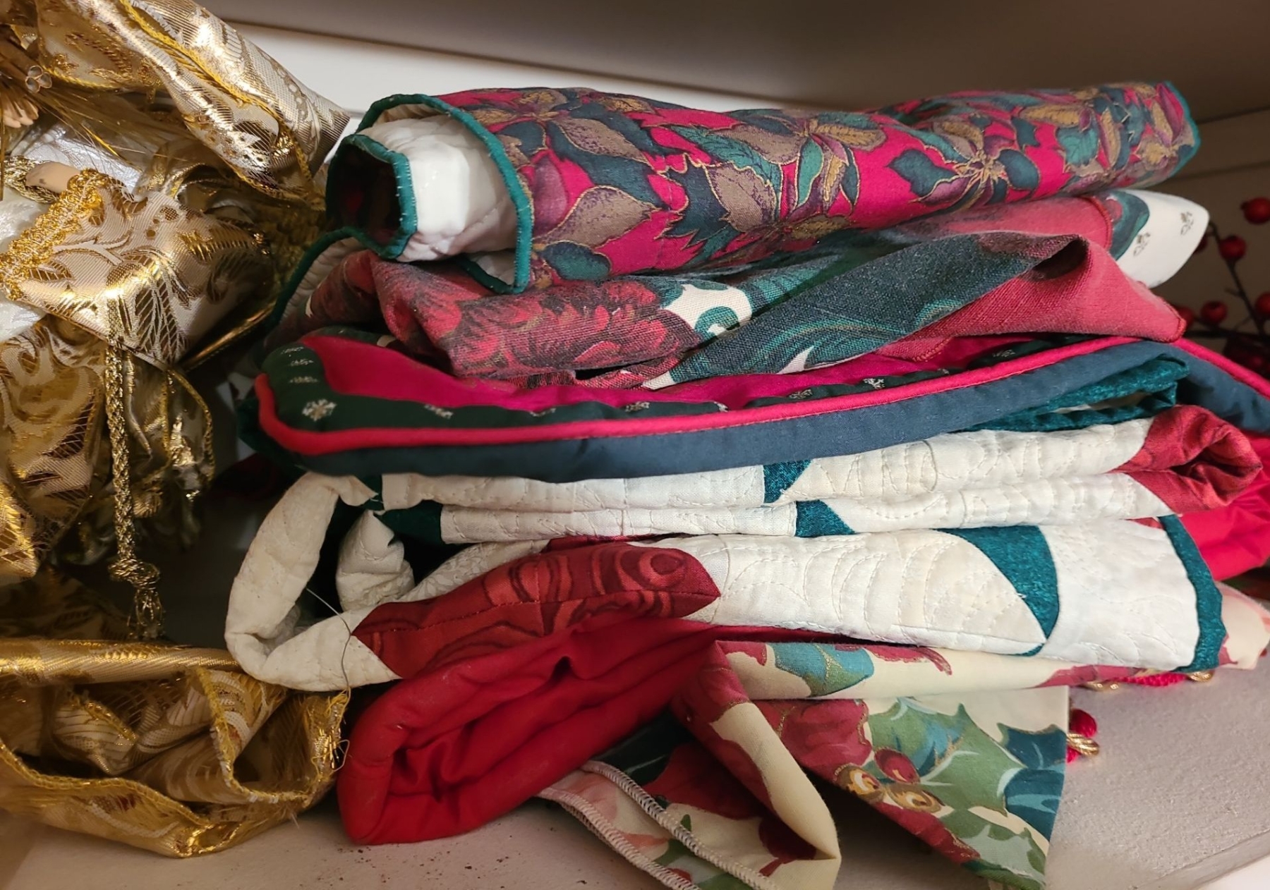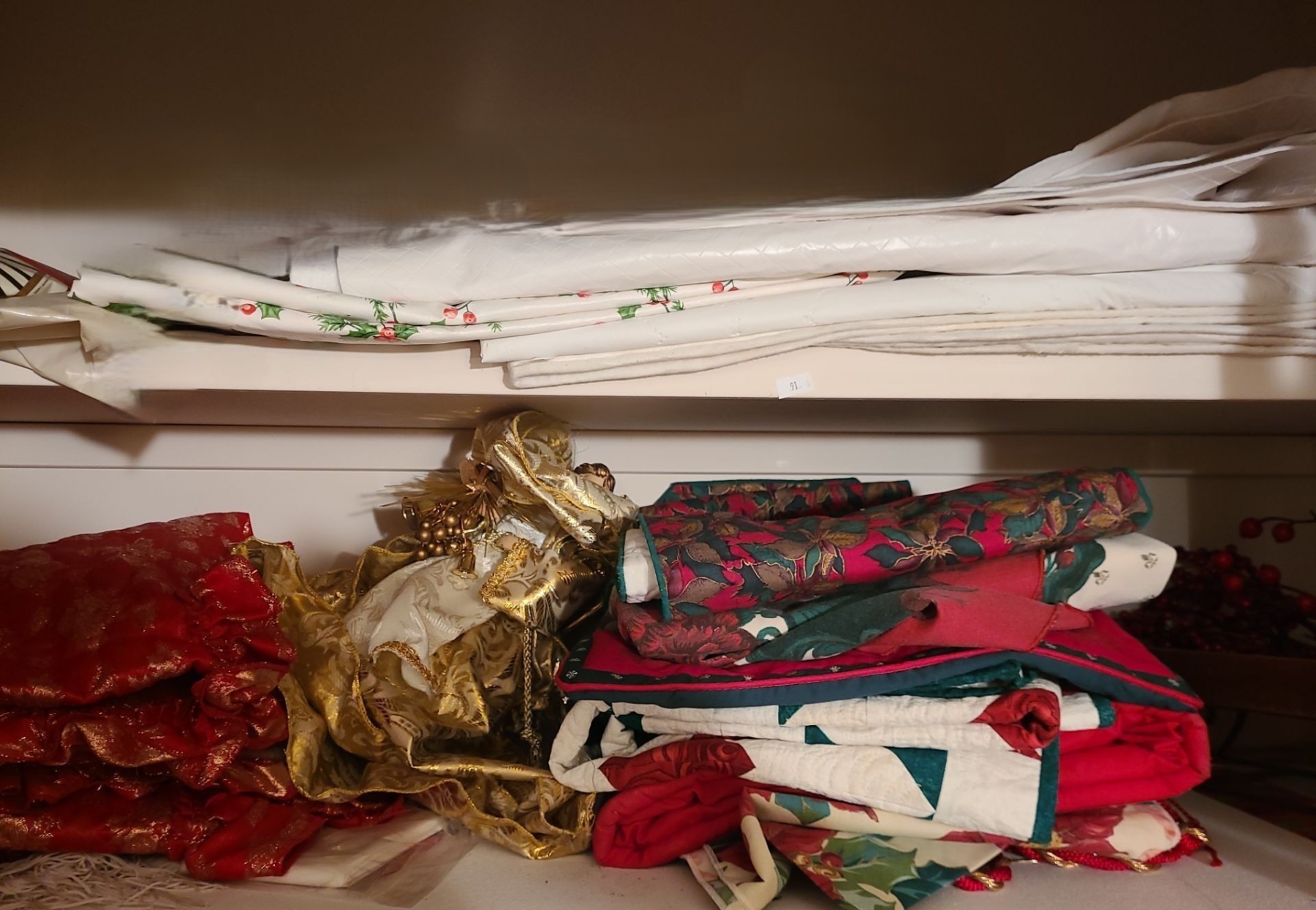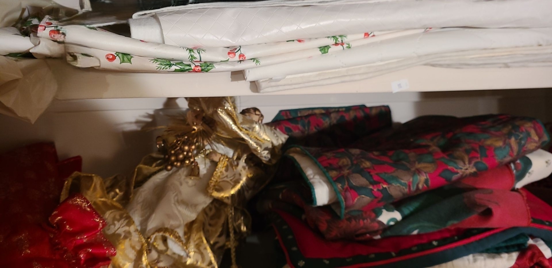 Assorted Holiday Table Decor: Tablecloths, Centrepiece Sled 5 W, 15 D, 6.5 T, Angel Topper and More!