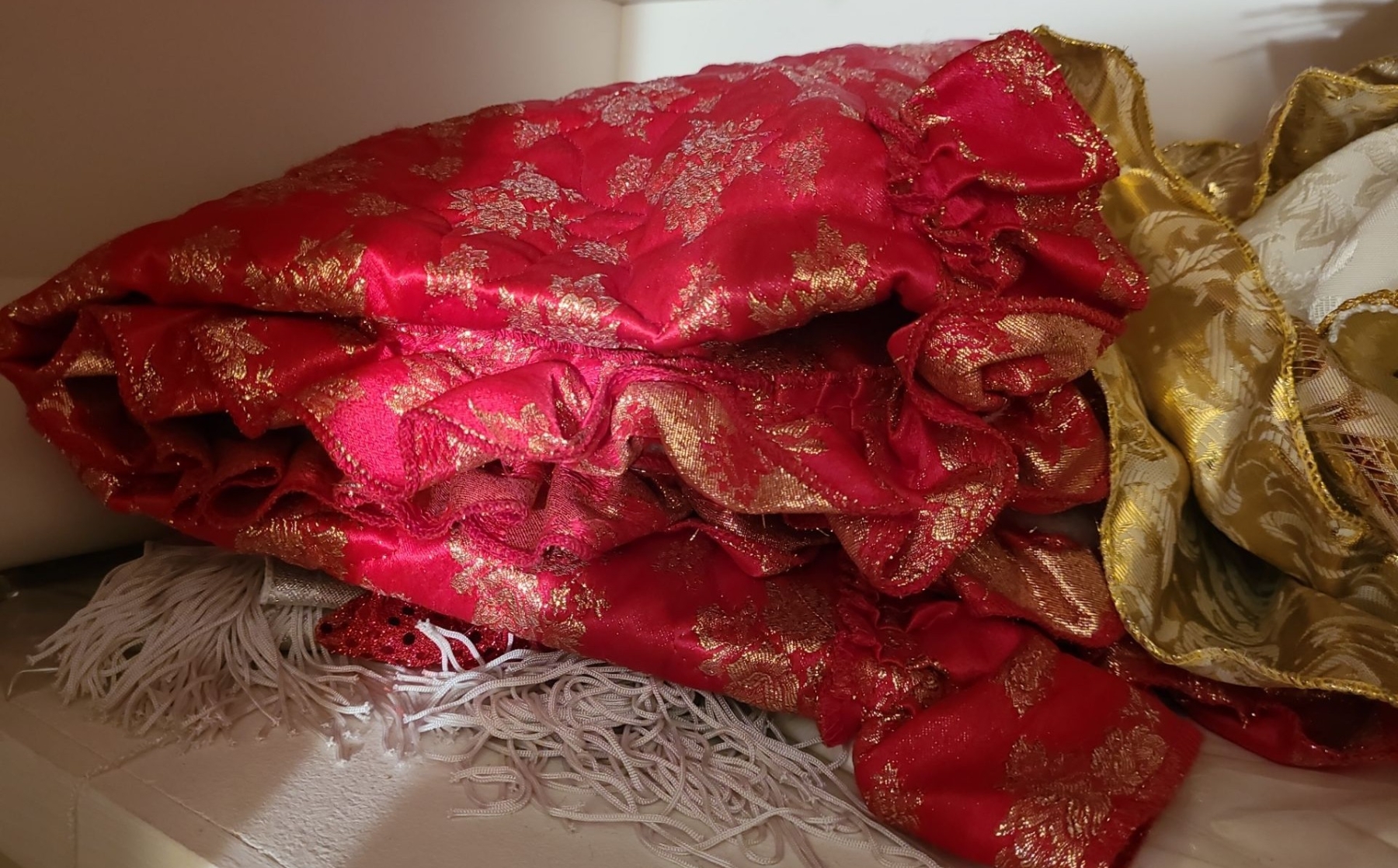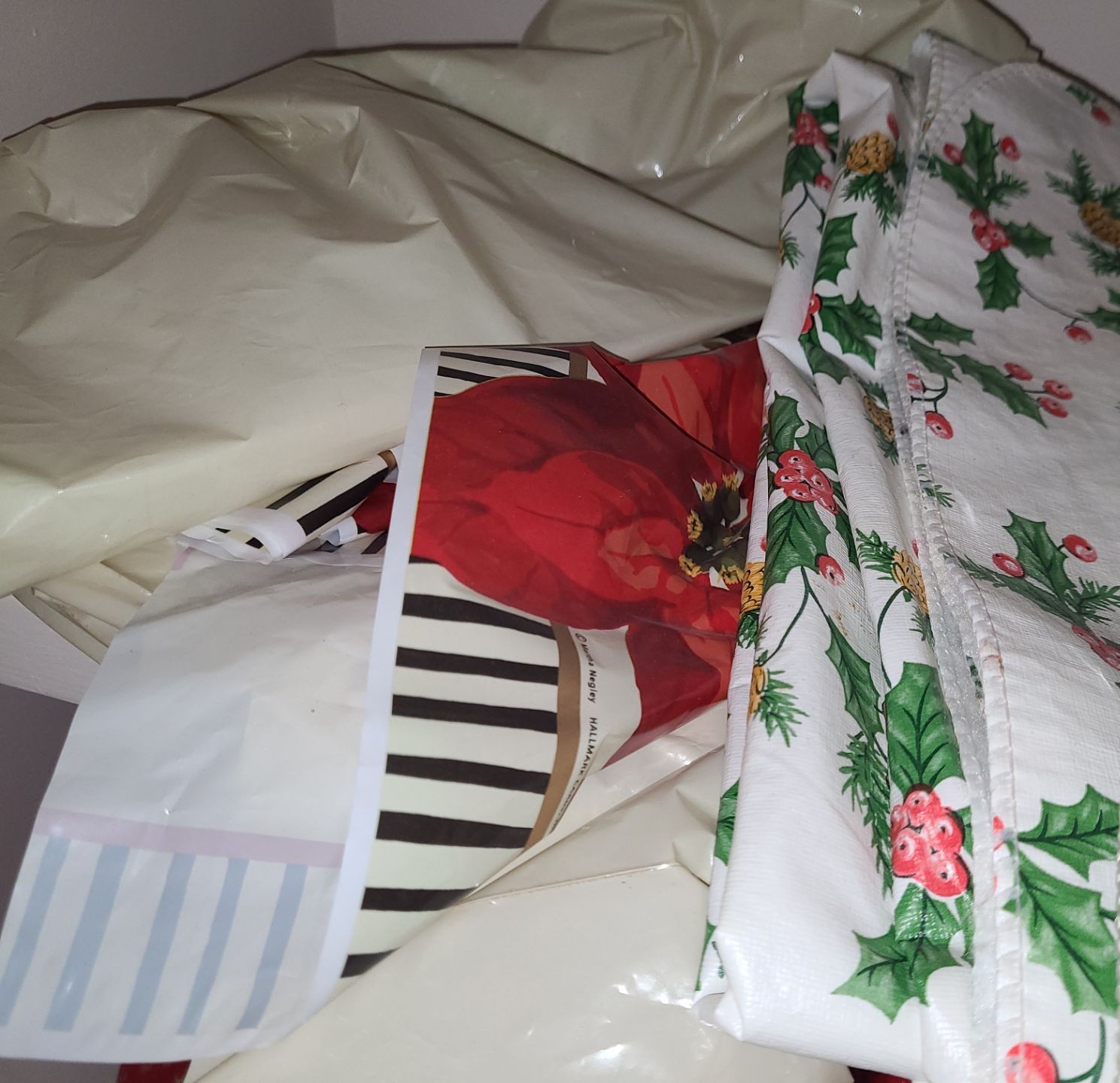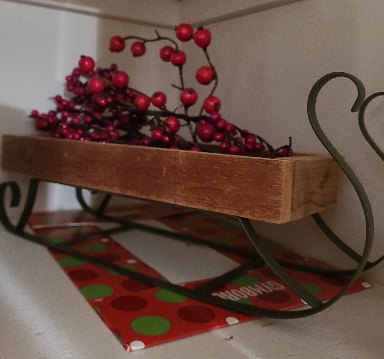 Assorted Holiday Table Decor: Tablecloths, Centrepiece Sled 5 W, 15 D, 6.5 T, Angel Topper and More!