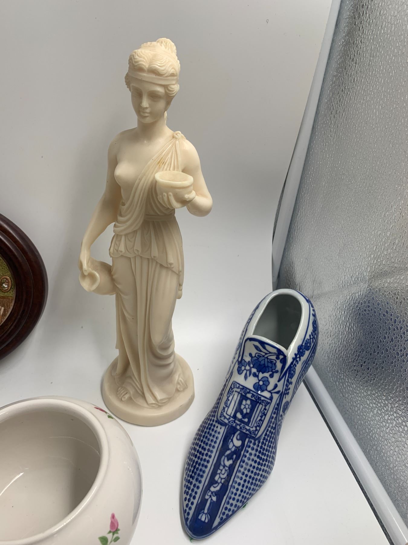 Assorted Home Decor: Including assorted floral cloth doilies, ceramic vase, decorative porcelain shoe, 3D-style artwork, glass vases, and more!