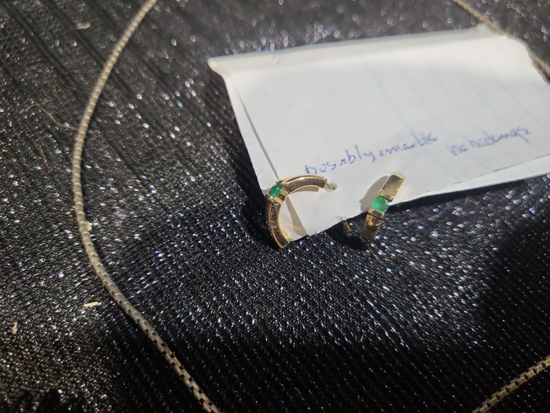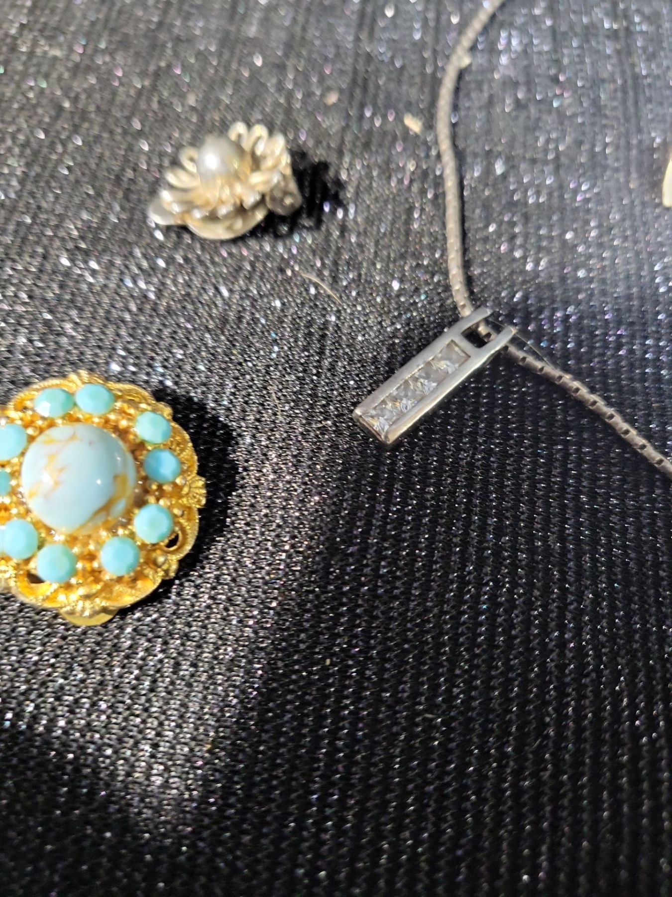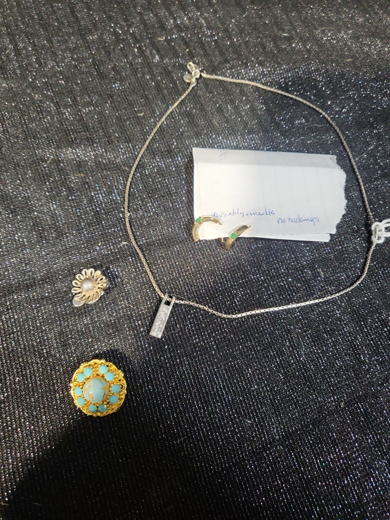 Jewellery lot filled with various items such as possibly yellow gold filled and green jewel earrings, silver and diamond like stone set pendant necklace from Metal Smiths and some clips on earrings, no pair.