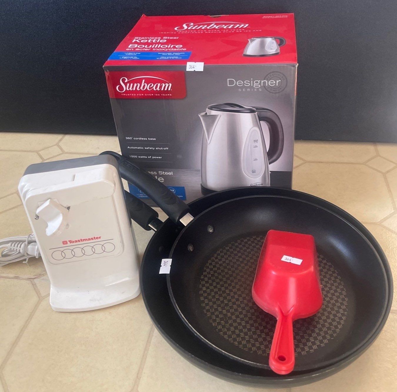 Assorted Kitchen Essentials - Can Opener Frying Pans & New Electric Kettle