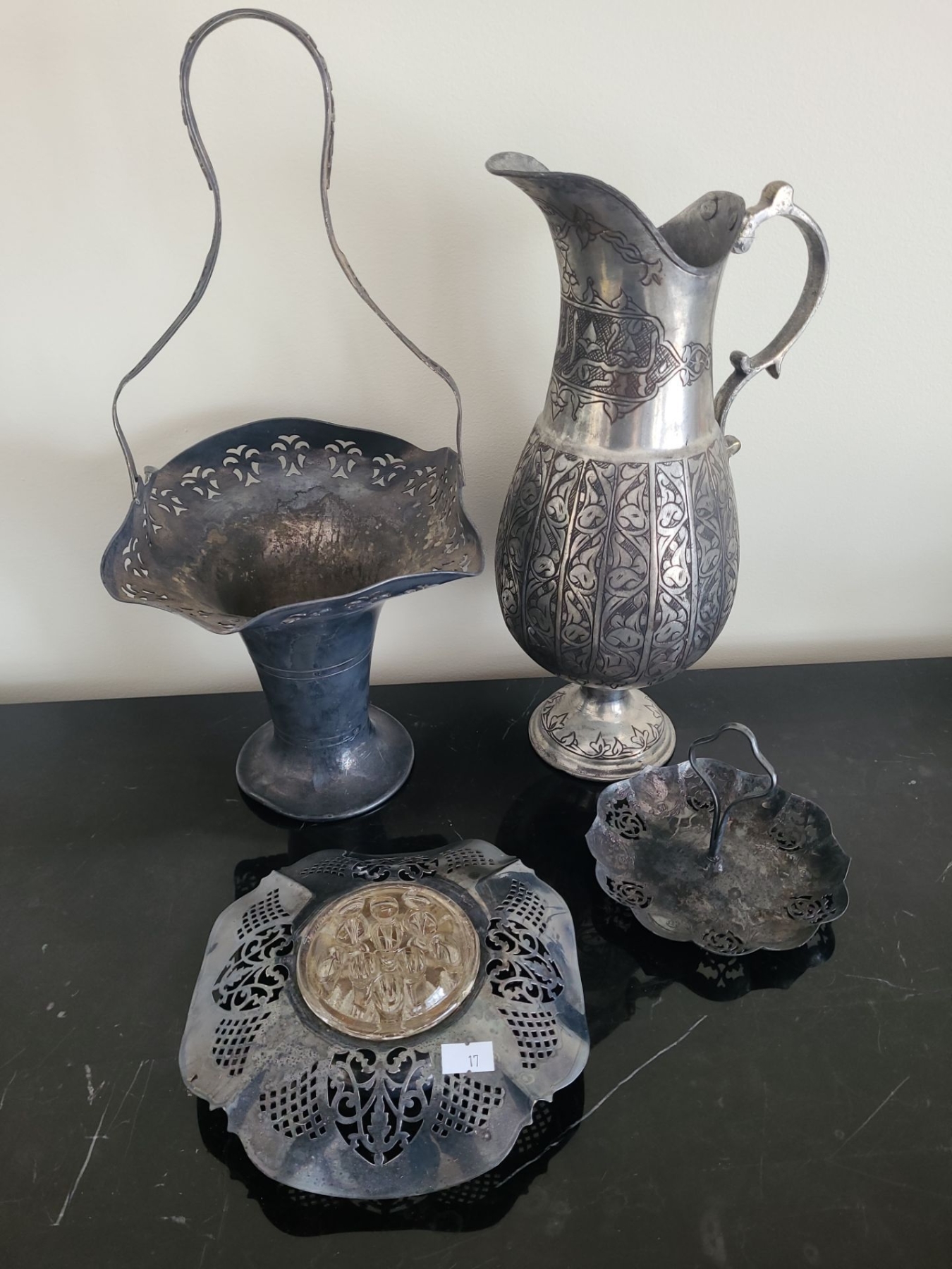 Assorted Metalware Including: Pitcher 14 T, Basket 15.5 T