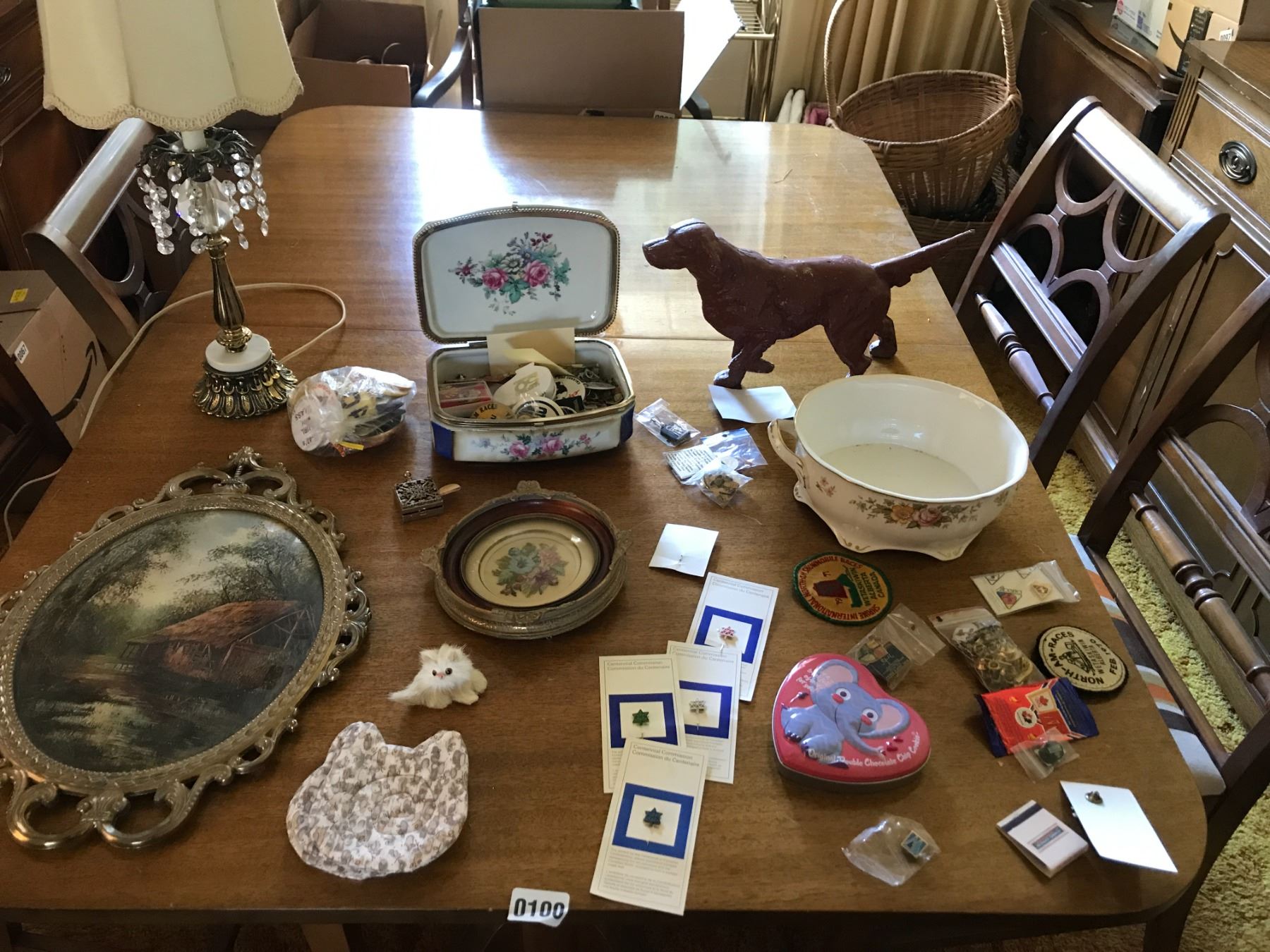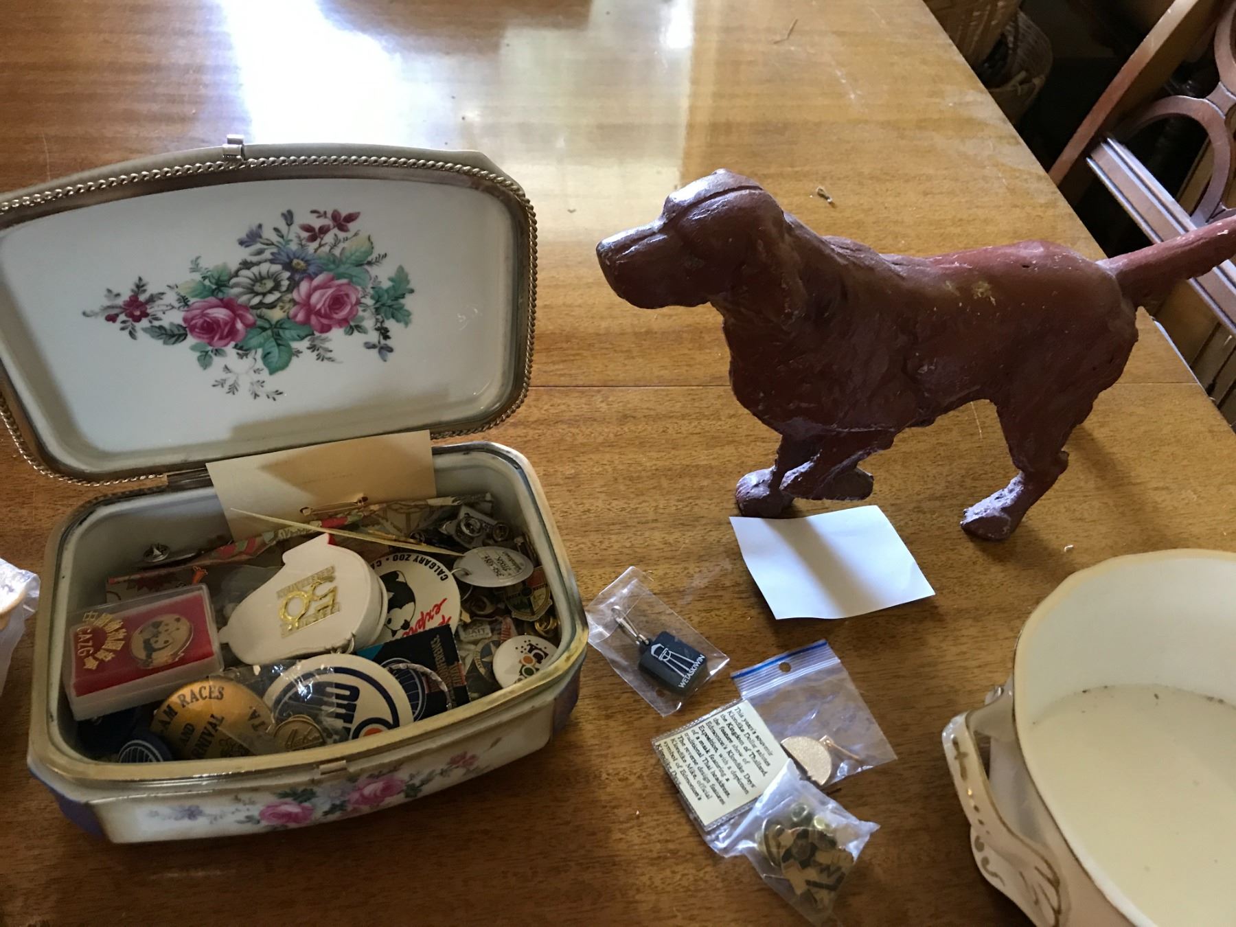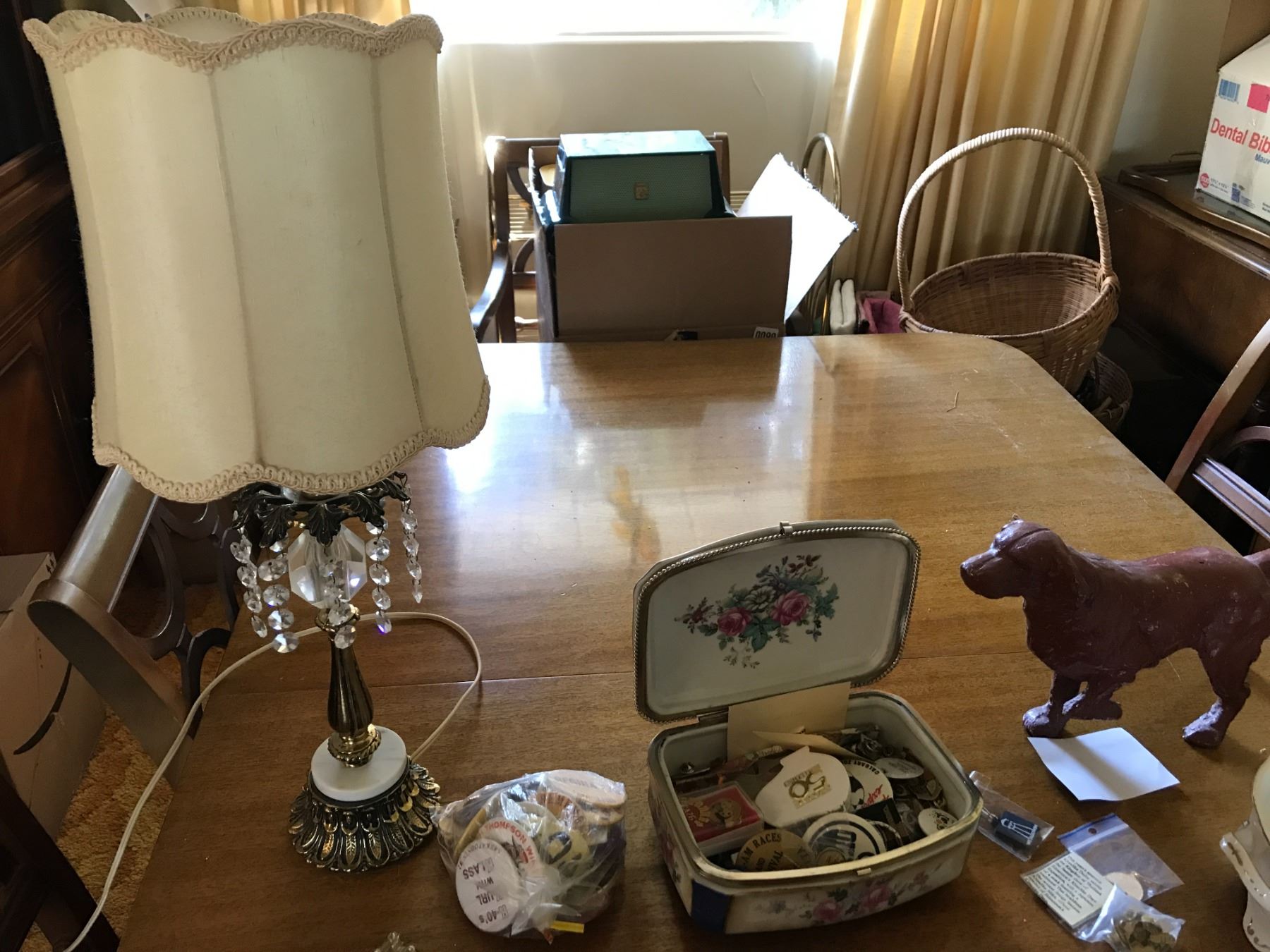 Assorted Pins, Vintage Lamps, Petit Points, Metal Golden Retriever Ornament, & Vintage Bowl