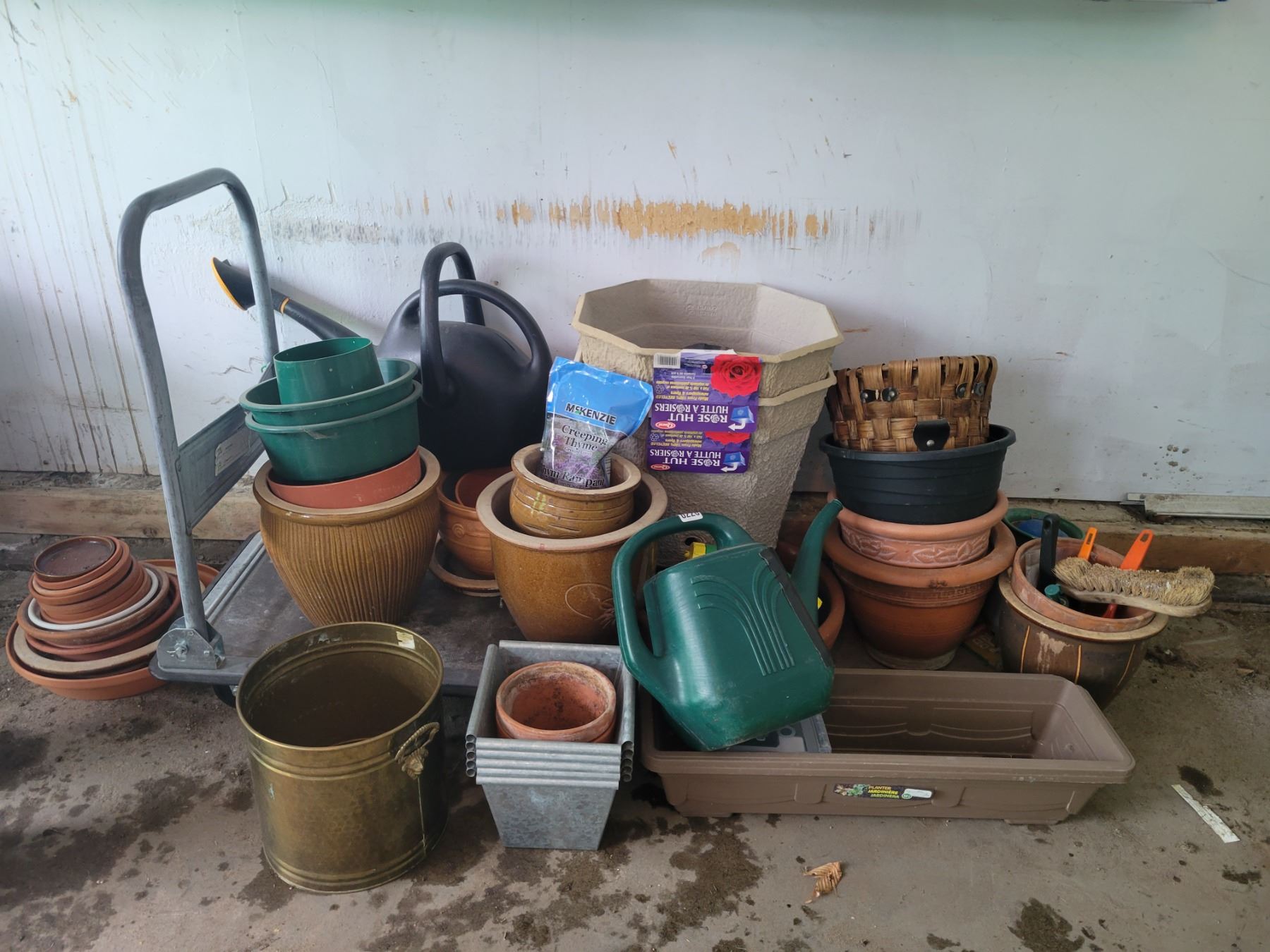 Assorted Pots, Potters, Watering Cans & Metal Wheel Cart