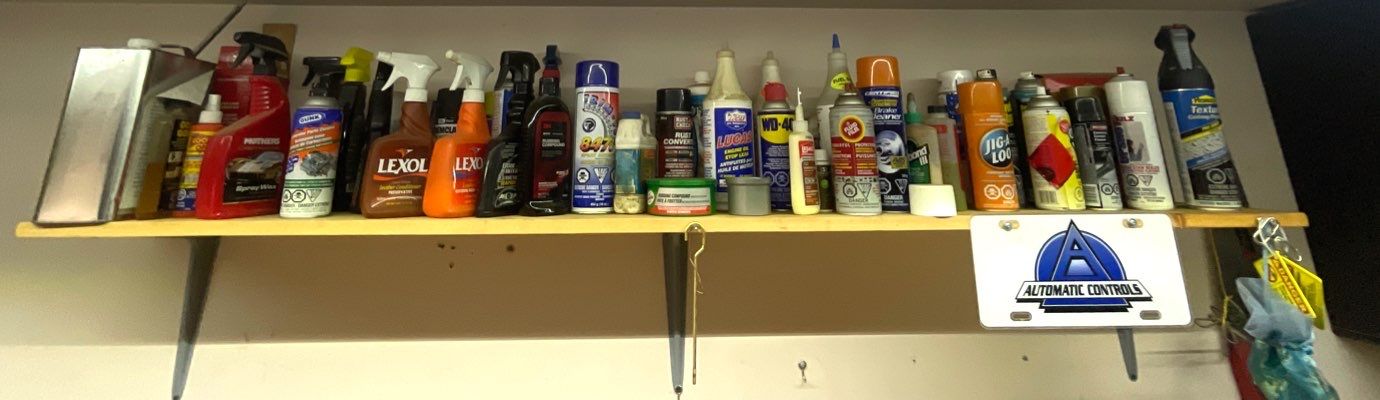 Assorted Shelf Of Shop Supplies/ Fluids For Your Garage
