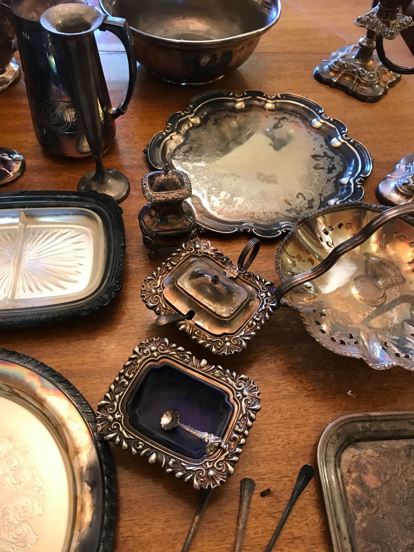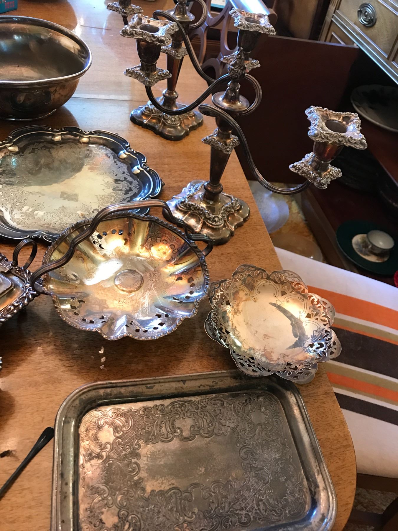 Assorted Silver – Candle Holders, Serving Dishes, Platters, Coffee Pot Etc.