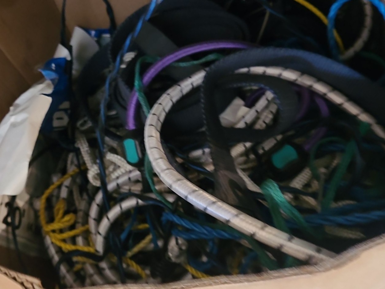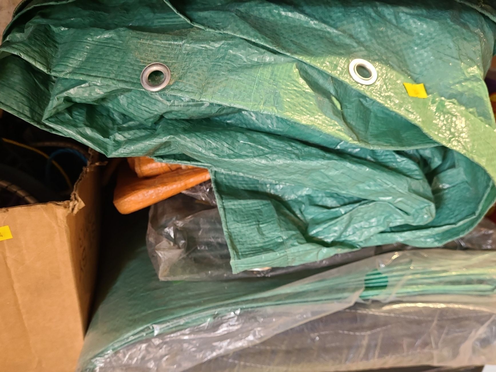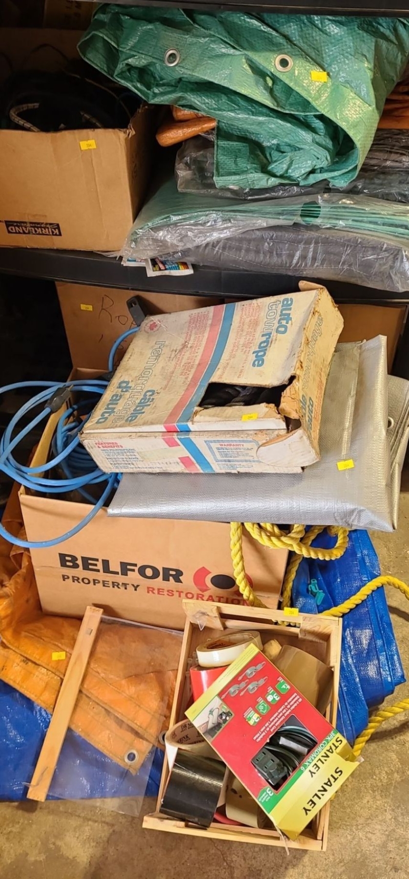 Assorted Tarps, Bungees, Extension Cord, Boxes w/ Rope and More!