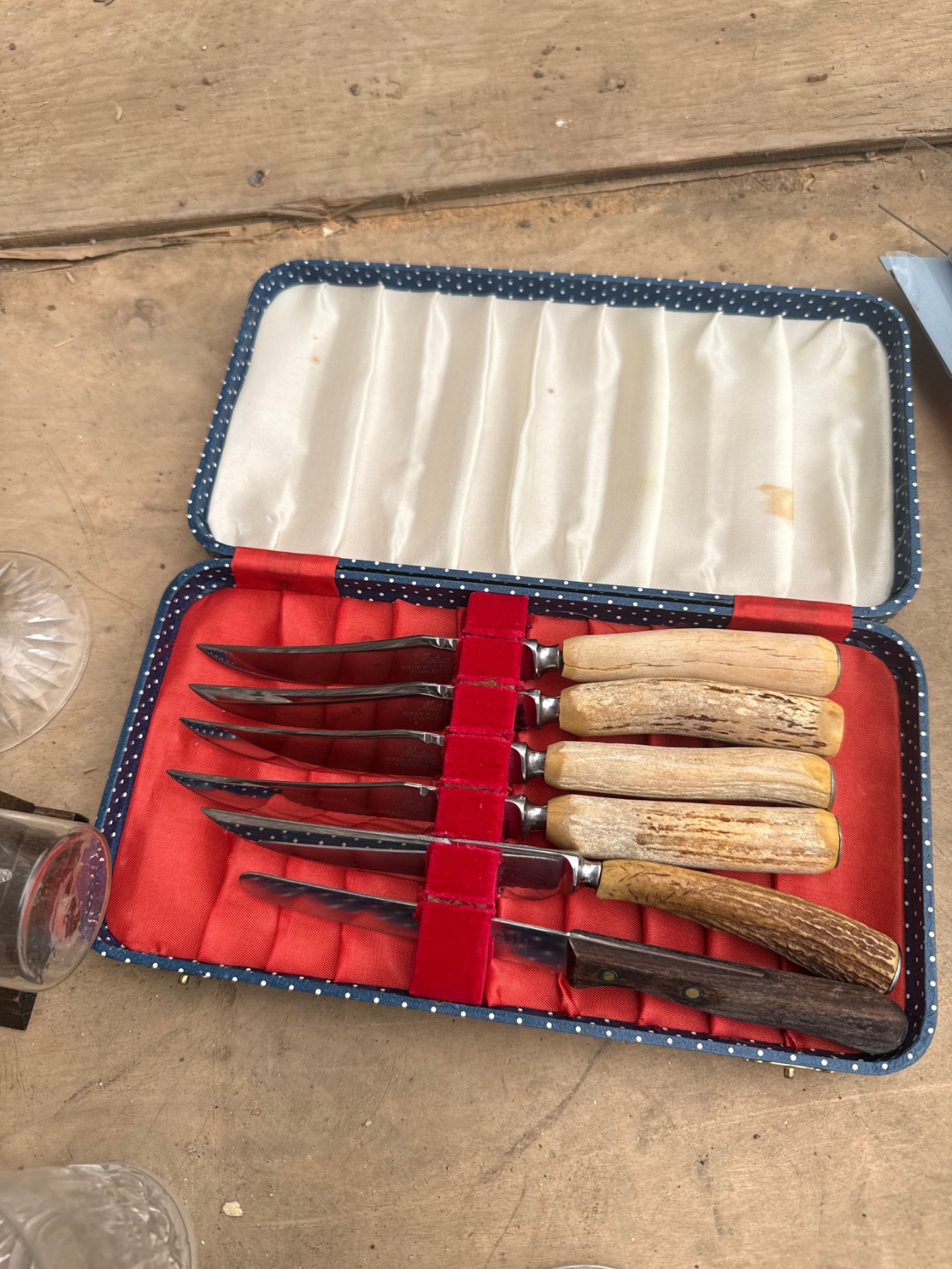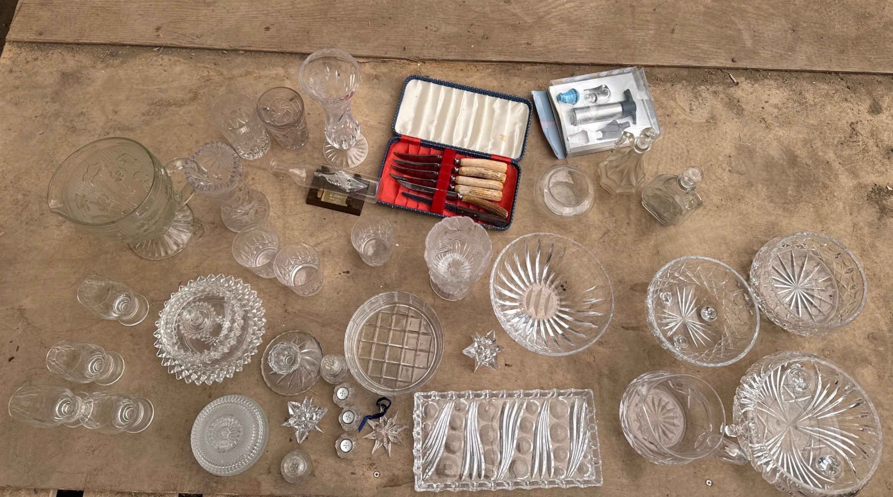 Assorted glassware, antler handle knives, wine vacuum sealer