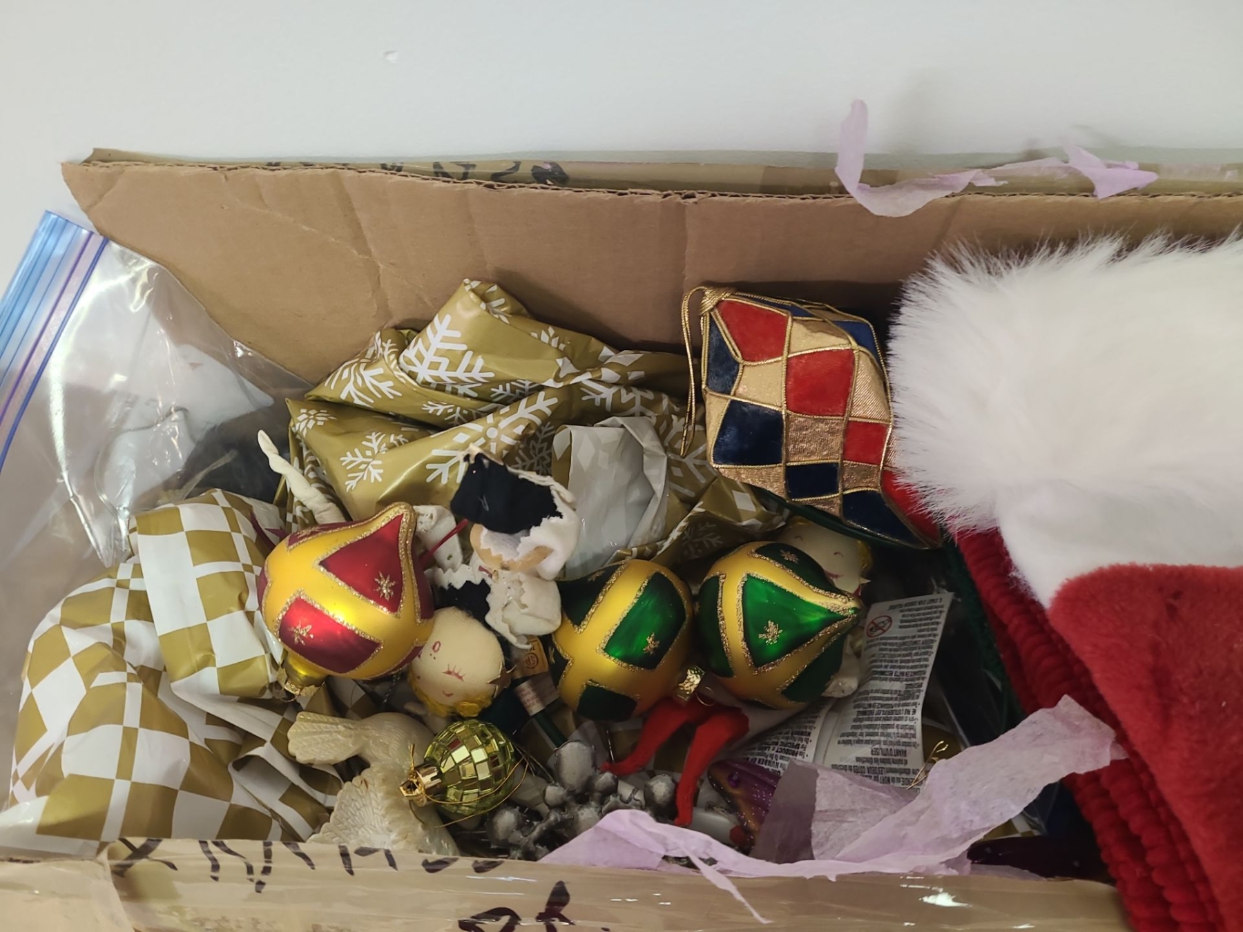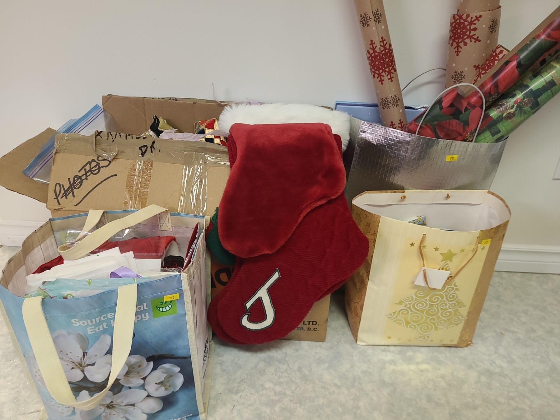 Assorted holiday decorations and wrapping paper/ gift bags, stockings