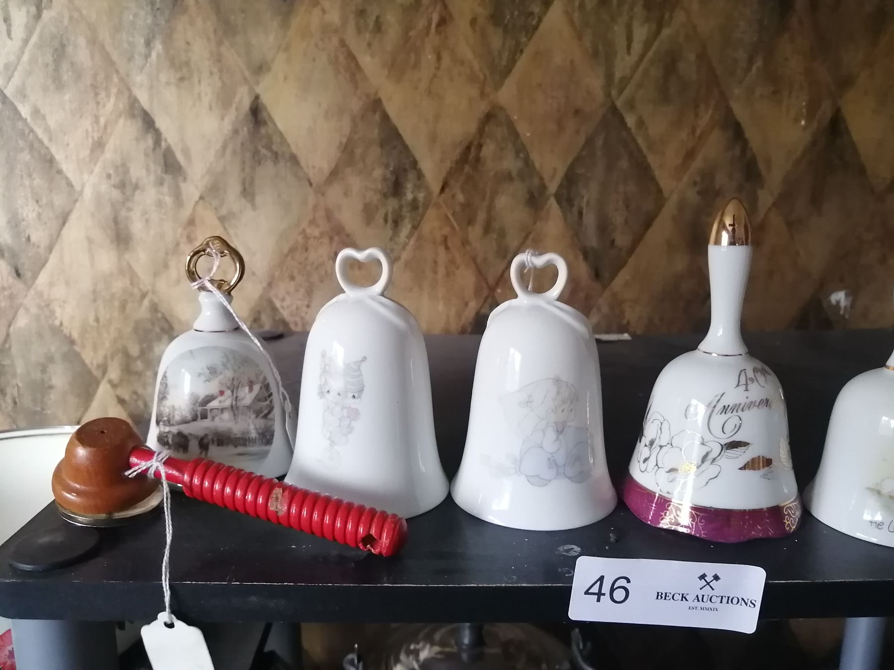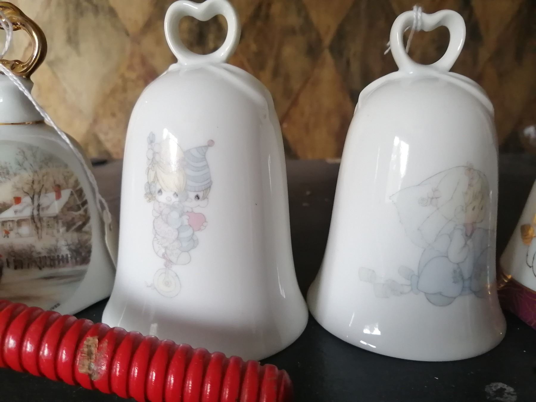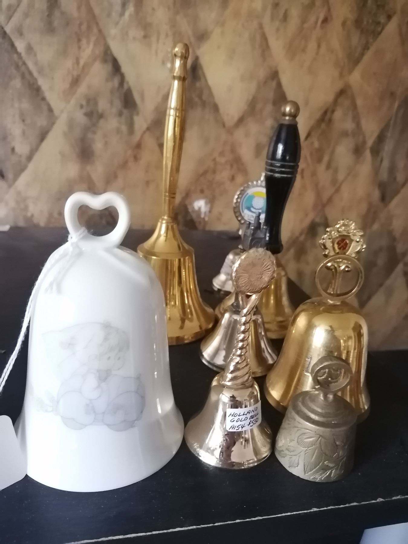 Assortment of Bells (Porcelain and Metal) and Vintage Red Wood Handle Tambourine