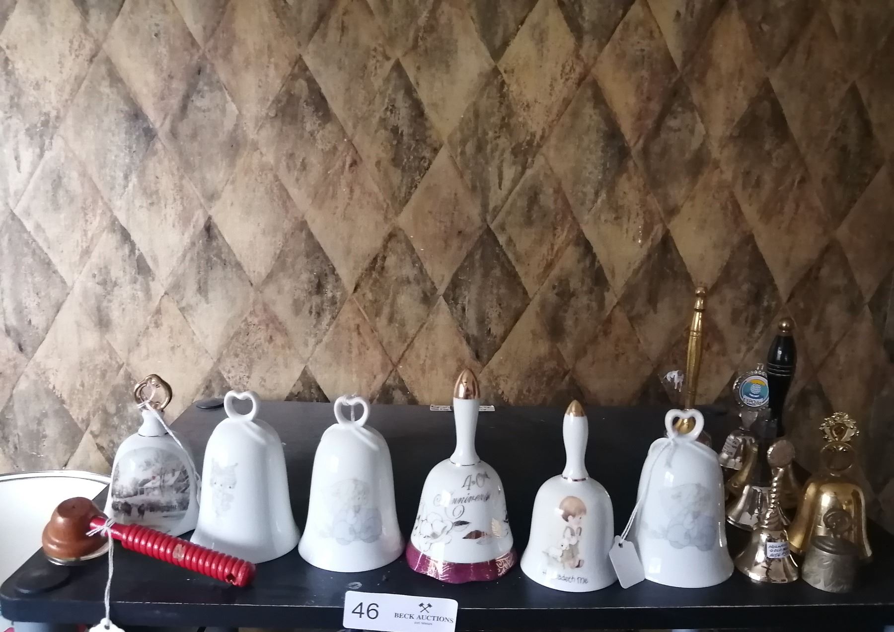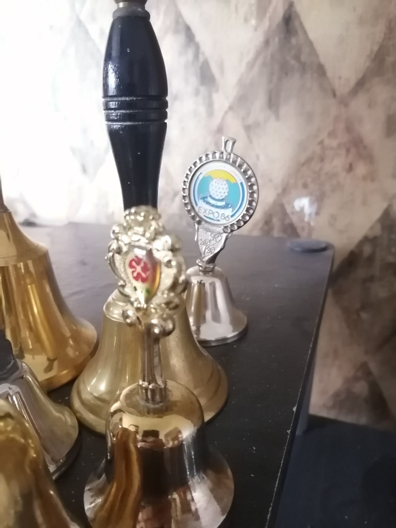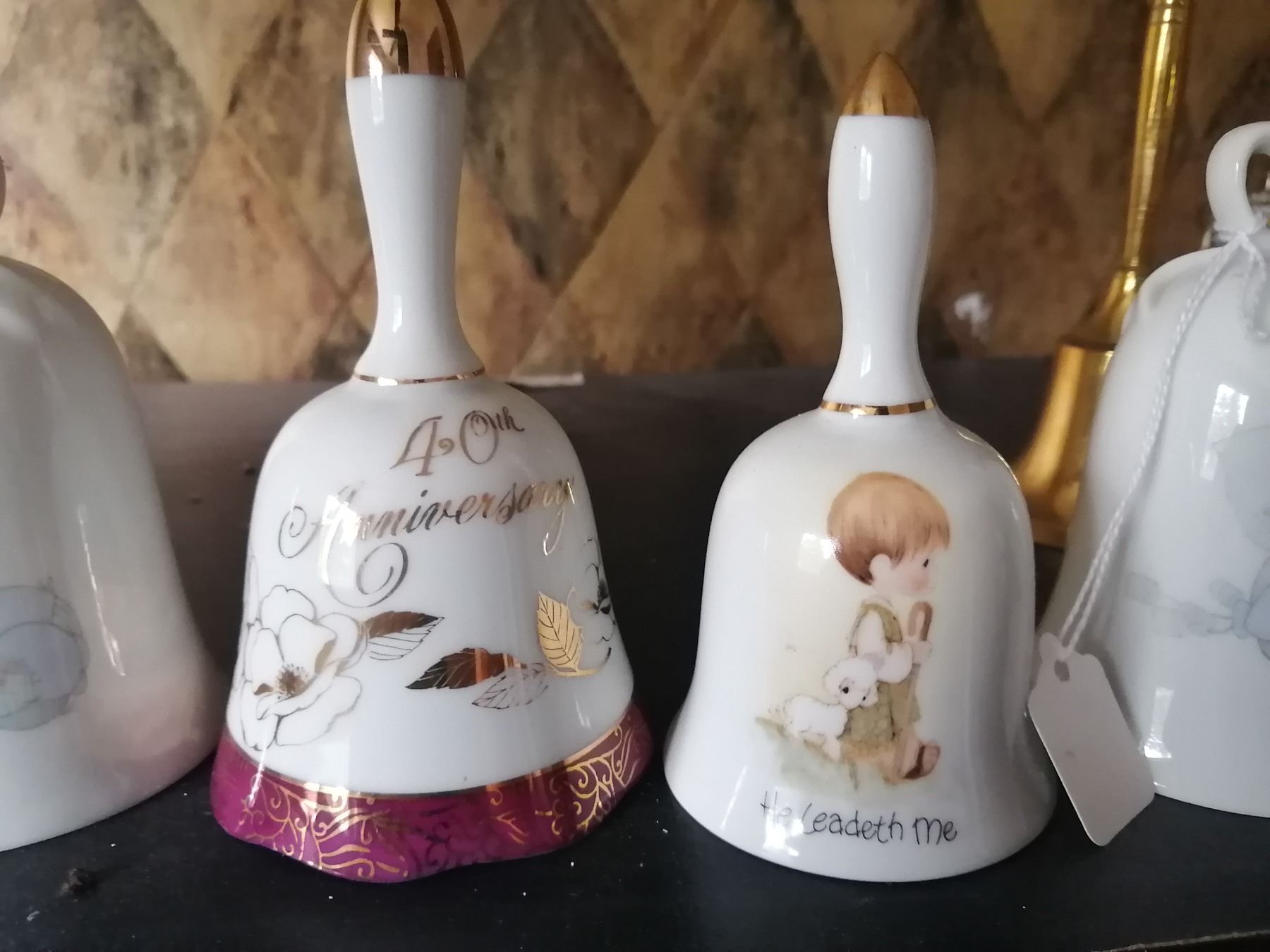 Assortment of Bells (Porcelain and Metal) and Vintage Red Wood Handle Tambourine