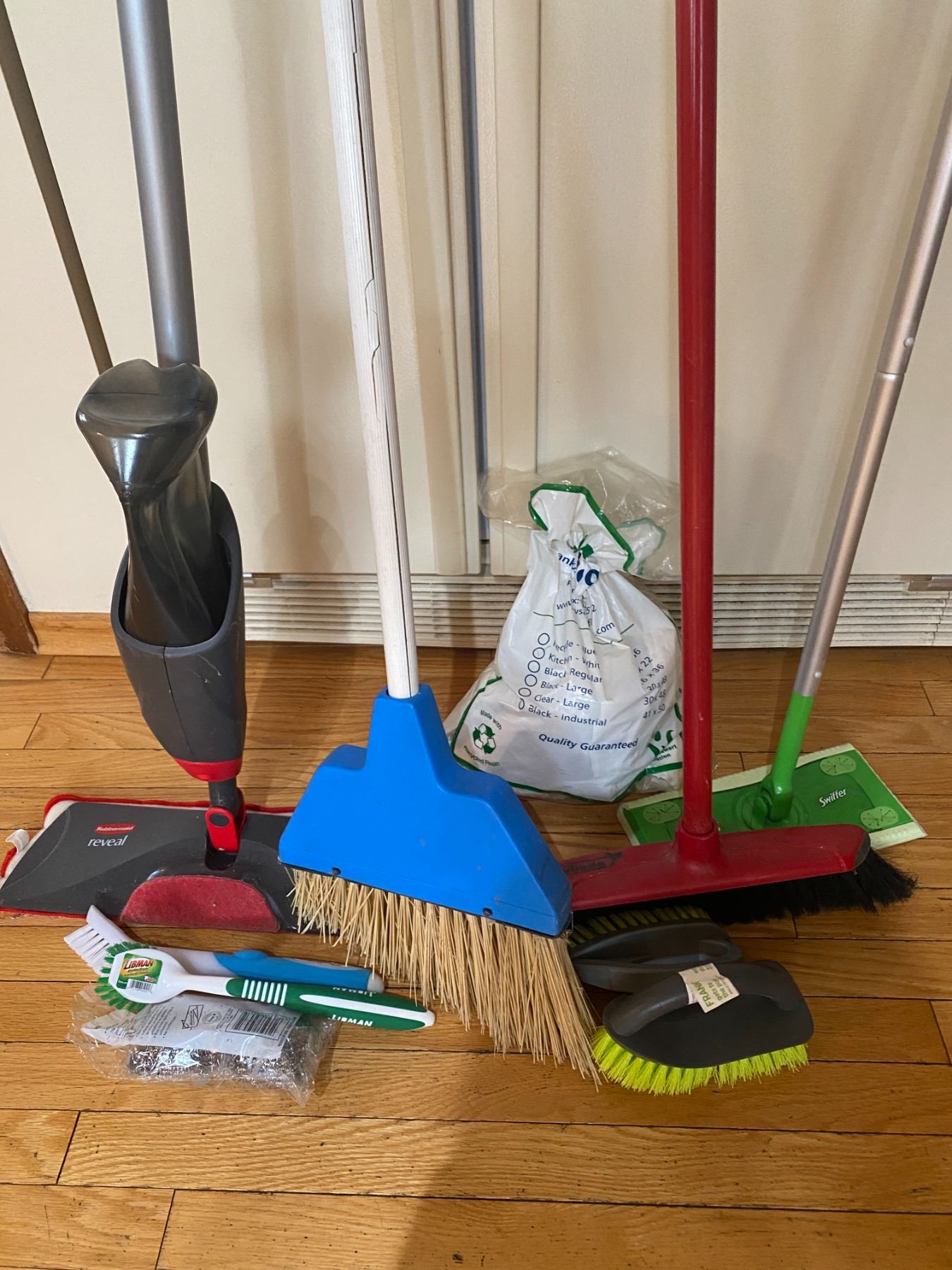 Assortment of Cleaning Supplies, Brooms, Swiffer, Hand Held Scrubbers